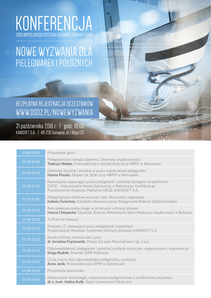 KONFERENCJA OGÓLNOPOLSKIEGO SYSTEMU OCHRONY ZDROWIA OSOZ NOWE WYZWANIA DLA PIELĘGNIAREK I POŁOŻNYCH BEZPŁATNA REJESTRACJA UCZESTNIKÓW WWW.OSOZ.PL/NOWEWYZWANIA 21 października 2016 r. | godz. 10:00 KAMSOFT S.A. | 40-235 Katowice, ul. 1 Maja 133 10.00-10.10 Przywitanie gości 10.10-10.30 Pielęgniarstwo i terapia daremna. Dylematy współczesności Tadeusz Wadas, Przewodniczący Komisji Etyki przy NRPiP w Warszawie 10.30-10.50 Dylematy etyczne i moralne w pracy współczesnej pielęgniarki Hanna Paszko, Ekspert ds. Etyki przy NRPiP w Warszawie 10.50-11.10 Rozwiązania wspierające pracę pielęgniarki i położnej dostępne na platformie OSOZ – Indywidualne Konto Zdrowotne, e-Rejestracja, KtoMaLek.pl Przedstawiciel Wydziału Platformy OSOZ, KAMSOFT S.A. 11.10-11.30 Pielęgniarstwo rodzinne wczoraj i dziś. Wyzwania i zagrożenia Izabela Ćwiertnia, Katolickie Stowarzyszenie Pielęgniarek Polskich Oddział Kraków 11.30-11.50 Rola opiekuna medycznego w strukturze ochrony zdrowia Hanna Chłopecka, Dyrektor Zespołu Policealnych Szkół Medyczno-Społecznych w Bytomiu 11.50-12.10 Przerwa kawowa 12.10-12.30 Produkty IT ułatwiające pracę pielęgniarek i położnych Przedstawiciel Wydziału Systemów Ochrony Zdrowia, KAMSOFT S.A. 12.30-12.50 Rynek ochrony zdrowia dziś i jutro dr Jarosław Frąckowiak, Prezes Zarządu PharmaExpert Sp. z o.o. 12.50-13.10 Odpowiedzialność pielęgniarki i położnej za błędy medyczne, organizacyjne i wykonawcze Kinga Rudnik, Prawnik OIPiP Katowice 13.10-13.30 Co to znaczy być odpowiedzialną pielęgniarką i położną? Anna Janik, Przewodnicząca OIPiP w Katowicach 13.30-13.50 Prezentacja sponsorska 13.50-14.10 Nowoczesne technologie, nowoczesne pielęgniarstwo a oczekiwania pacjentów dr n. hum. Halina Kulik, Śląski Uniwersytet Medyczny