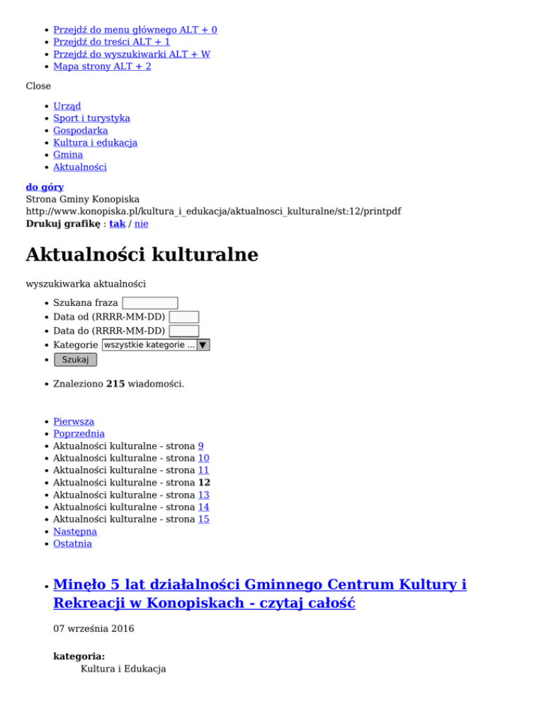 Przejdź do menu głównego ALT + 0 Przejdź do treści ALT + 1 Przejdź do wyszukiwarki ALT + W Mapa strony ALT + 2 Close Urząd Sport i turystyka Gospodarka Kultura i edukacja Gmina Aktualności do góry Strona Gminy Konopiska http://www.konopiska.pl/kultura_i_edukacja/aktualnosci_kulturalne/st:12/printpdf Drukuj grafikę : tak / nie Aktualności kulturalne wyszukiwarka aktualności Szukana fraza Data od (RRRR-MM-DD) Data do (RRRR-MM-DD) Kategorie wszystkie kategorie ... ▼ Szukaj Znaleziono 215 wiadomości. Pierwsza Poprzednia Aktualności kulturalne - strona 9 Aktualności kulturalne - strona 10 Aktualności kulturalne - strona 11 Aktualności kulturalne - strona 12 Aktualności kulturalne - strona 13 Aktualności kulturalne - strona 14 Aktualności kulturalne - strona 15 Następna Ostatnia Minęło 5 lat działalności Gminnego Centrum Kultury i Rekreacji w Konopiskach - czytaj całość 07 września 2016 kategoria: Kultura i Edukacja Dyrektor oraz pracownicy Gminnego Centrum Kultury i Rekreacji pragną podzielić się miłą wiadomością i przy tej okazji złożyć serdeczne podziękowania władzom Gminy Konopiska oraz wszystkim dotychczasowym współpracownikom, sympatykom i sponsorom. Dziękujemy za 5 lat wspólnych działań, przychylność i dobre słowo. Minęło 5 lat działalności Gminnego Centrum Kul Minęło 5 lat działalności Gminnego Centrum Kultury i Rekreacji w Konopiskach - czytaj całość Wakacje z GCKiR szybko minęły - czytaj całość 02 września 2016 kategoria: Kultura i Edukacja Szybko minęły wakacje i choć z nowymi zadaniami wkraczamy w nowy rok szkolny to z uśmiechem będziemy wspominać wspaniałe, szalone chwile spędzone wraz z podopiecznymi na warsztatach i wycieczkach. Wakacje z GCKiR szybko minęły Wakacje z GCKiR szybko minęły - czytaj całość SĄ JESZCZE WOLNE MIEJSCA W PRZEDSZKOLACH PUBLICZNYCH - czytaj całość 02 września 2016 kategoria: Kultura i Edukacja Informujemy wszystkich zainteresowanych rodziców i opiekunów dzieci w wieku przedszkolnym, że dysponujemy wolnymi miejscami w przedszkolach publicznych w Gminie Konopiska. SĄ JESZCZE WOLNE MIEJSCA W PRZEDSZKOLACH PUBLICZN SĄ JESZCZE WOLNE MIEJSCA W PRZEDSZKOLACH PUBLICZNYCH - czytaj całość NOWY ROK SZKOLNY 2016/2017 - czytaj całość 01 września 2016 kategoria: Kultura i Edukacja 1 września 2016 roku uroczysta inauguracja roku szkolnego w Gminie Konopiska NOWY ROK SZKOLNY 2016/2017 NOWY ROK SZKOLNY 2016/2017 - czytaj całość KONKURS FOTOGRAFICZNY - czytaj całość 01 września 2016 kategoria: Kultura i Edukacja Serdecznie zapraszamy do wzięcia udziału w VII Konkursie Fotograficznym „PIĘKNO ZIEMI CZĘSTOCHOWSKIEJ”, nad którym patronat objął Starosta Częstochowski Andrzej Kwapisz. KONKURS FOTOGRAFICZNY KONKURS FOTOGRAFICZNY - czytaj całość II OTWARTE MISTRZOSTWA CZĘSTOCHOWY W FOTOGRAFOWANIU - czytaj całość 31 sierpnia 2016 kategoria: Kultura i Edukacja Drodzy miłośnicy fotografii z Województwa Śląskiego!!! Zapraszamy Was serdecznie do udziału w „II Otwartych Mistrzostw Częstochowy w Fotografowaniu – FOTOMARATON 2016” organizowanych przez Fundację Festiwal Sztuki Fotoreportażu. To kolejna edycja największego Konkursu organizowanego od 2013 roku. II OTWARTE MISTRZOSTWA CZĘSTOCHOWY W FOTOGRAFOWAN II OTWARTE MISTRZOSTWA CZĘSTOCHOWY W FOTOGRAFOWANIU - czytaj całość Jeszcze dzisiaj do północy można głosować na KGW w Kopalni! - czytaj całość 31 sierpnia 2016 kategoria: Kultura i Edukacja ODDAJ SWÓJ GŁOS NA KOŁO GOSPODYŃ WIEJSKICH W KOPALNI Panie uczestniczą w konkursie „KOBIETY NA START”. Głosować można do 31 sierpnia 2016 roku do godziny 23.59, wysyłając SMS na numer 7148 o treści: KNS. 12. Koszt jednego SMS-a wynosi 1,23zł z VAT. Jeszcze dzisiaj do północy można głosować na Jeszcze dzisiaj do północy można głosować na KGW w Kopalni! - czytaj całość XVII Dożynki Powiatowe - czytaj całość 30 sierpnia 2016 kategoria: Kultura i Edukacja Mszą Świętą Dziękczynną odprawioną w niedzielę 28 sierpnia br. przez ks. proboszcza Antoniego Kaczmarka w Kościele Parafialnym pw. św. Doroty w Przyrowie rozpoczęły się XVII Dożynki Powiatowe, współorganizowane przez Starostwo Powiatowe w Częstochowie i Urząd Gminy w Przyrowie. W uroczystościach uczestniczył Jerzy Żurek Wójt Gminy Konopiska z delegacją. XVII Dożynki Powiatowe XVII Dożynki Powiatowe - czytaj całość Panie z KGW Kopalnia po raz kolejny w telewizji - czytaj całość 29 sierpnia 2016 kategoria: Kultura i Edukacja Niezależna Telewizja Lokalna z Radomska zawitała do KGW w Kopalni, aby zrealizować reportaż na temat działalności oraz osiągnięć naszego Koła Gospodyń Wiejskich. Podczas wizyty Panie chętnie opowiadały o swojej działalności, prezentowały archiwalne fotografie oraz zaprezentowały się artystycznie. Panie z KGW Kopalnia po raz kolejny w telewizji Panie z KGW Kopalnia po raz kolejny w telewizji - czytaj całość 100-lecie Ochotniczej Straży Pożarnej w Konopiskach czytaj całość 29 sierpnia 2016 kategoria: Kultura i Edukacja Sto lat działalności to czas podsumowań. Myśl utworzenia straży zrodziła się wśród mieszkańców po jednym z poważniejszych pożarów. Zamysł został wprowadzony w czyn i w 1916 roku powołano do życia jednostkę OSP. 100-lecie Ochotniczej Straży Pożarnej w Konopisk 100-lecie Ochotniczej Straży Pożarnej w Konopiskach - czytaj całość Pierwsza Poprzednia Aktualności kulturalne - strona 9 Aktualności kulturalne - strona 10 Aktualności kulturalne - strona 11 Aktualności kulturalne - strona 12 Aktualności kulturalne - strona 13 Aktualności kulturalne - strona 14 Aktualności kulturalne - strona 15 Następna Ostatnia