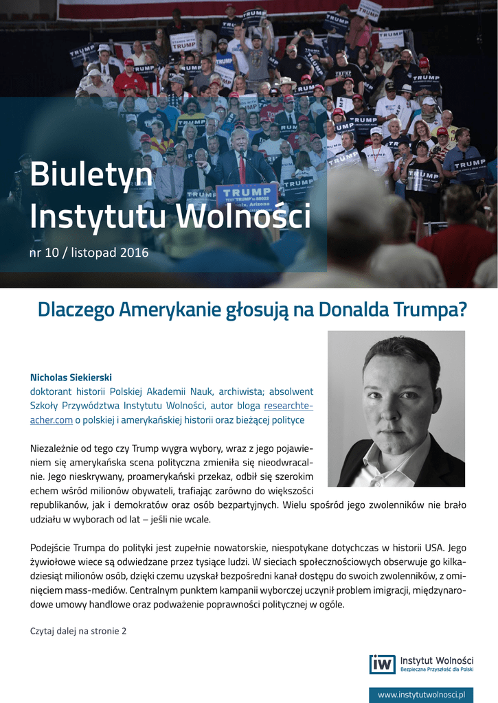 1 Biuletyn Instytutu Wolności nr 10 / listopad 2016 Dlaczego Amerykanie głosują na Donalda Trumpa? Nicholas Siekierski doktorant historii Polskiej Akademii Nauk, archiwista; absolwent Szkoły Przywództwa Instytutu Wolności, autor bloga researchteacher.com o polskiej i amerykańskiej historii oraz bieżącej polityce Niezależnie od tego czy Trump wygra wybory, wraz z jego pojawieniem się amerykańska scena polityczna zmieniła się nieodwracalnie. Jego nieskrywany, proamerykański przekaz, odbił się szerokim echem wśród milionów obywateli, trafiając zarówno do większości republikanów, jak i demokratów oraz osób bezpartyjnych. Wielu spośród jego zwolenników nie brało udziału w wyborach od lat – jeśli nie wcale. Podejście Trumpa do polityki jest zupełnie nowatorskie, niespotykane dotychczas w historii USA. Jego żywiołowe wiece są odwiedzane przez tysiące ludzi. W sieciach społecznościowych obserwuje go kilkadziesiąt milionów osób, dzięki czemu uzyskał bezpośredni kanał dostępu do swoich zwolenników, z ominięciem mass-mediów. Centralnym punktem kampanii wyborczej uczynił problem imigracji, międzynarodowe umowy handlowe oraz podważenie poprawności politycznej w ogóle. Czytaj dalej na stronie 2 www.instytutwolnosci.pl 2 Kontynuacja ze strony 1 Siły drzemiące w społeczeństwie, z których czerpie, nie są nowe. Rdzeń jego elektoratu to klasa średnia, której członków można określić jako „zwykłych Amerykanów” („Middle Americans”). Wspomniana grupa to przede wszystkim biali pracownicy fizyczni, tzw. niebieskie kołnierzyki. Warto jednak nadmienić, że Trump cieszy się większym poparciem reprezentantów mniejszości etnicznych (takich jak Afroamerykanie, Latynosi, Azjaci) niż którykolwiek z republikańskich kandydatów do tej pory. ,,Te wybory są w gruncie rzeczy referendum na temat przyszłego kształtu amerykańskiej tożsamości.” Nicholas Siekierski Przedstawicieli „Middle Americans” charakteryzuje poczucie, że w wyniku intryg kosmopolitycznych elit odbiera się im ich kraj. Ich miejsca pracy zostały przeniesione za granicę albo uległy redukcji. Ich kultura, historia i tradycja są ciągle atakowane przez tak zwaną postępową globalistyczną ideologię, która coraz częściej ingeruje w ich codzienne życie. W tym samym czasie imigracja dramatycznie wpłynęła na sytuację demograficzną w kraju, zmieniając ją nie do poznania (w porównaniu do sytuacji w poprzednim pokoleniu). Te wybory są w gruncie rzeczy referendum na temat przyszłego kształtu amerykańskiej tożsamości. Ruch, którego liderem stał się Donald Trump, nie stoi wyłącznie w opozycji wobec Hillary Clinton. To rewolta przeciwko dwupartyjnemu politycznemu establishmentowi, który jest coraz bardziej obojętny, jeżeli nie wprost wrogo nastawiony, do wartości i spraw ważnych dla zwolenników Trumpa. Jesteśmy świadkami zmiany paradygmatu w amerykańskim życiu politycznym, którego oddziaływanie będzie trwało długo po zakończeniu kampanii. Jeśli Trump zwycięży i będzie w stanie nawet w części zrealizować swoje obietnice wyborcze, nastąpi prawdziwe trzęsienie ziemi, które odczuje cały świat. Zwolennicy Trumpa uważają go za przywódcę, który ostatecznie zapewni obronę ich własnych interesów i spraw ważnych dla całego kraju. Napisano już wiele, o tym, dlaczego Amerykanie wspierają Donalda Trumpa. Socjologowie, naukowcy i eksperci będą omawiać ten temat jeszcze przez długie lata. Najlepszym i najbardziej oczywistym źródłem informacji są jednak zwykli ludzie. W celu lepszego zrozumienia fenomenu Trumpa i motywacji jego wyborców zadałem Amerykanom proste pytanie: czemu popieracie Donalda Trumpa w wyborach prezydenckich? www.instytutwolnosci.pl Czemu Amerykanie głosują na Trumpa – ankieta James, ekspedient, Massachusetts Przez lata obserwowałem, jak odbierano mi mój kraj. W Ameryce trwa wojna kulturowa przeciwko chrześcijaństwu i jego wartościom, przeciwko białym mieszkańcom Ameryki, ich tradycjom i obyczajom. Prędkość, z którą ta wojna się rozprzestrzenia, jest zatrważająca. Większość dużych firm i korporacji, włącznie z wielkimi koncernami medialnymi, jest w to zaangażowana. Donald Trump to ostatnia nadzieja na powstrzymanie tego procesu. Jego przeciwnicy wiedzą o tym, dlatego robią wszystko, żeby go zatrzymać – czy to przy pomocy ordynarnych kłamstw w stronniczych mediach, czy to poprzez cenzurę wypowiedzi jego zwolenników w mediach społecznościowych. Robert, emerytowany dyplomata, Teksas ,,Nie mogę poprzeć kandydatki, która swoją działalność publiczną traktuje jako okazję do wzbogacenia się.” Robert Jako były dyplomata i pracownik administracji państwowej, w której przepracowałem 32 lata, nie mogę poprzeć kandydatki, która wywodzi się z komunistycznej tradycji. Nie zagłosuję na osobę, która ukrywała seksualne ekscesy swojego męża, a jego ofiary próbowała zastraszyć. Nie mogę poprzeć kandydatki, która swoją działalność publiczną traktuje jako okazję do wzbogacenia się, osoby, która naraziła na szwank bezpieczeństwo własnego kraju poprzez oferowanie swych wpływów i usług przedstawicielom obcych państw. To urzędniczka, która nie potrafiła zabezpieczyć poufnych danych i która jest zainteresowana wyłącznie zdobywaniem osobistych korzyści, pogardza i lekceważy zwykłych obywateli, jest zdolna do kłamstw, oszustw, kradzieży, a nawet morderstwa, by zaspokoić swoje prywatne ambicje i cele. Być może Donald Trump słusznie jest oskarżany o instrumentalne traktowanie kobiet, czy wręcz molestowanie, ale jego winy bledną w porównaniu z jego oponentką. Liberalne media na całym świecie zrobią wszystko, by zniszczyć Donalda Trumpa. Już za kilka lat ci dziennikarze stracą swoją uprzywilejowaną pozycję i będą musieli przepraszać za swoje słowa. Alicja, sprzedawca dzieł sztuki, Pensylwania Moja rodzi