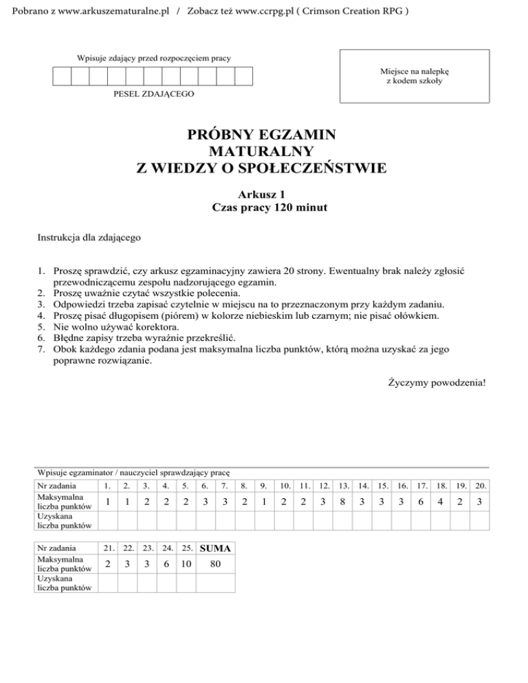 Pobrano z www.arkuszematuralne.pl / Zobacz też www.ccrpg.pl ( Crimson Creation RPG ) Wpisuje zdający przed rozpoczęciem pracy Miejsce na nalepkę z kodem szkoły PESEL ZDAJĄCEGO PRÓBNY EGZAMIN MATURALNY Z WIEDZY O SPOŁECZEŃSTWIE Arkusz 1 Czas pracy 120 minut Instrukcja dla zdającego 1. Proszę sprawdzić, czy arkusz egzaminacyjny zawiera 20 strony. Ewentualny brak należy zgłosić przewodniczącemu zespołu nadzorującego egzamin. 2. Proszę uważnie czytać wszystkie polecenia. 3. Odpowiedzi trzeba zapisać czytelnie w miejscu na to przeznaczonym przy każdym zadaniu. 4. Proszę pisać długopisem (piórem) w kolorze niebieskim lub czarnym; nie pisać ołówkiem. 5. Nie wolno używać korektora. 6. Błędne zapisy trzeba wyraźnie przekreślić. 7. Obok każdego zdania podana jest maksymalna liczba punktów, którą można uzyskać za jego poprawne rozwiązanie. Życzymy powodzenia! Wpisuje egzaminator / nauczyciel sprawdzający pracę Nr zadania Maksymalna liczba punktów Uzyskana liczba punktów 1. 2. 3. 4. 5. 6. 7. 8. 9. 10. 11. 12. 13. 14. 15. 16. 17. 18. 19. 20. 1 1 2 2 2 3 3 2 1 2 Nr zadania Maksymalna liczba punktów Uzyskana liczba punktów 21. 22. 23. 24. 25. SUMA 2 3 3 6 10 80 2 3 8 3 3 3 6 4 2 3 W zadaniach 1-2 podkreśl poprawną odpowiedź. Zadanie 1. (1 pkt) Na podstawie kryterium typu więzi społecznej wyróżnia się grupy społeczne a) b) c) d) małe i duże. formalne i nieformalne. celowe i bezcelowe. pierwotne i wtórne. Zadanie 2. (1 pkt) Wymiar sprawiedliwości w Rzeczypospolitej Polskiej sprawują wyłącznie: a) b) c) d) Sąd Najwyższy, sądy powszechne, sądy administracyjne oraz sądy wojskowe. Sąd Najwyższy, sądy powszechne, sądy grodzkie oraz sądy wojskowe. Sąd Najwyższy, sądy powszechne, sądy administracyjne oraz sądy grodzkie. Sądy powszechne, sądy administracyjne oraz sądy wojskowe. Zadanie 3. (2 pkt) W świetle obowiązującej Konstytucji RP określ, w kompetencjach którego z niżej wymienionych organów znajdują się wskazane sprawy. W wykropkowane miejsca wpisz odpowiednio umieszczone w tabeli właściwe nazwy lub ich skróty. Trybunał Konstytucyjny – TK Trybunał Stanu – TS Sądy administracyjne a) Pociąganie do odpowiedzialności członków Rady Ministrów za czyn polegający na naruszeniu konstytucji i ustaw – ........................................................................................................................ b) Orzekanie o zgodności z konstytucją celów lub działalności partii politycznych – .......................................................................................................................................................... c) Rozstrzyganie sporów kompetencyjnych pomiędzy centralnymi organami państwa – .......................................................................................................................................................... d) Orzekanie o zgodności z ustawami uchwał organów samorządu terytorialnego – .......................................................................................................................................................... e) Pociąganie do odpowiedzialności Prezydenta za przestępstwo pospolite – .................................... f) Rozpatrywanie skarg na decyzje organów administracji publicznej – ............................................ g) Rozpatrywanie indywidualnych skarg konstytucyjnych – .............................................................. Strona 2 z 20 Zadanie 4. (2 pkt) Konstytucja Rzeczypospolitej Polskiej z 2 IV 1997 r. dokonała klasyfikacji praw i wolności człowieka, dzieląc je na trzy grupy. Uporządkuj, zgodnie z zasadą zawartą w Konstytucji, niżej wymienione prawa i wolności, wpisując do tabeli odpowiadające im litery. Prawa i wolności: A. Nikt nie może być poddany torturom ani okrutnemu, nieludzkiemu lub poniżającemu traktowaniu i karaniu. (...) B. Każdemu zapewnia się wolność zrzeszania się. C. Obywatel ma prawo do uzyskiwania informacji o działalności organów władzy publicznej. (...) D. Każdy przeciwko komu prowadzone jest postępowanie karne, ma prawo do obrony we wszystkich stadiach postępowania. (...) E. Obywatel polski ma prawo do udziału w referendum. F. Każdy ma prawo do ochrony zdrowia. G. Każdy ma prawo do nauki. H. Rodzice mają prawo do wychowania dzieci zgodnie z własnymi przekonaniami. Wolności i prawa osobiste Wolności i prawa polityczne Wolności i prawa ekonomiczne, socjalne i kulturalne Zadanie 5. (2 pkt) Przyporządkuj pojęciom ich znaczenia, dopisując do poszczególnych cyfr właściwe litery: a) sztuka rządzenia państwem i społeczeństwem, podejmowania decyzji i ich realizacji, 1) nacjonalizm 2) populizm 3) ksenofobia 4) tolerancja b) głoszenie haseł chwytliwych, łatwo trafiających do emocji a nie rozsądku odbiorców, ośmieszanie rywali, schlebianie określonym grupom, składanie obietnic bez pokrycia, opieranie się na stereotypie biednego, skrzywdzonego człowieka, odwoływanie się do jego mądrości i przeciwstawianie się ją istniejącej władzy, c) szacunek, wyrozumiałość, otwartość w stosunku do cudzych wierzeń, poglądów, postaw, różniących się od własnych, d) niechęć do wszystkiego, co obce i inne; może dotyczyć odmiennego koloru skóry, wyznania, języka, e) ideologia, w której za nadrzędną wartość uznaje się naród oraz interesy własnej wspólnoty narodowej. 1) ....................; 2) .....................; 3) ....................; 4) ................... . Strona 3 z 20 Zadanie 6. (3 pkt) Do podanych opisów dopisz pełne nazwy charakteryzowanych organizacji pozarządowych działających w Polsce. a) Organizacja powstała w 1989 r. Prowadzi szeroki program edukacji w zakresie ochrony praw człowieka. Monitoruje działalność rozmaitych instytucji, od których zależy poziom praworządności w Polsce. Najbardziej znani członkowie: Ewa Łętowska i Marek Nowicki. 