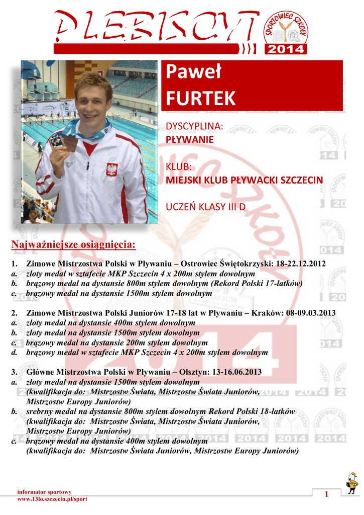 Paweł FURTEK DYSCYPLINA: PŁYWANIE KLUB: MIEJSKI KLUB PŁYWACKI SZCZECIN UCZEŃ KLASY III D Najważniejsze osiągnięcia: 1. Zimowe Mistrzostwa Polski w Pływaniu – Ostrowiec Świętokrzyski: 18-22.12.2012 a. złoty medal w sztafecie MKP Szczecin 4 x 200m stylem dowolnym b. brązowy medal na dystansie 800m stylem dowolnym (Rekord Polski 17-latków) c. brązowy medal na dystansie 1500m stylem dowolnym 2. Zimowe Mistrzostwa Polski Juniorów 17-18 lat w Pływaniu – Kraków: 08-09.03.2013 a. złoty medal na dystansie 400m stylem dowolnym b. złoty medal na dystansie 1500m stylem dowolnym c. brązowy medal na dystansie 200m stylem dowolnym d. brązowy medal w sztafecie MKP Szczecin 4 x 200m stylem dowolnym Główne Mistrzostwa Polski w Pływaniu – Olsztyn: 13-16.06.2013 złoty medal na dystansie 1500m stylem dowolnym (kwalifikacja do: Mistrzostw Świata, Mistrzostw Świata Juniorów, Mistrzostw Europy Juniorów) b. srebrny medal na dystansie 800m stylem dowolnym Rekord Polski 18-latków (kwalifikacja do: Mistrzostw Świata, Mistrzostw Świata Juniorów, Mistrzostw Europy Juniorów) c. brązowy medal na dystansie 400m stylem dowolnym (kwalifikacja do: Mistrzostw Świata Juniorów, Mistrzostw Europy Juniorów) 3. a. informator sportowy www.13lo.szczecin.pl/sport 1 4. a. b. Mistrzostwa Europy Juniorów w Pływaniu – Poznań: 10-14.07.2013 złoty medal na dystansie 800m stylem dowolnym srebrny medal na dystansie 1500m stylem dowolnym 5. a. b. Mistrzostwa Świata w Pływaniu – Barcelona: 19.07-04.08.2013 14. miejsce na dystansie 1500m stylem dowolnym 22. miejsce na dystansie 800m stylem dowolnym 6. Mistrzostwa Świata Juniorów w Pływaniu – Dubai: 26-31.08.2013 a. Brązowy medal na dystansie 800m stylem dowolnym (Rekord Polski 18-latków) b. Brązowy medal na dystansie 1500m stylem dowolnym c. 6. miejsce na dystansie 400m stylem dowolnym 7. a. b. Zawody kwalifikacyjne do Mistrzostw Europy – Poznań: 30.11-01.12.2013 1. miejsce na dystansie 1500m stylem dowolnym (kwalifikacja do ME) 2. miejsce na dystansie 400m stylem dowolnym (kwalifikacja do ME) (Rekord Polski 18- latków) 8. a. b. Mistrzostwa Europy w Pływaniu – Herning: 12-15.12.2013 24. miejsce na dystansie 400m stylem dowolnym 9. miejsce na dystansie 1500m stylem dowolnym 9. a. b. Zimowe Mistrzostwa Polski w pływaniu – Ostrowiec Świętokrzyski: 19-22.12.2013 złoty medal na dystansie 1500m stylem dowolnym złoty medal w sztafecie MKP Szczecin 4 x 200m stylem dowolnym informator sportowy www.13lo.szczecin.pl/sport 2