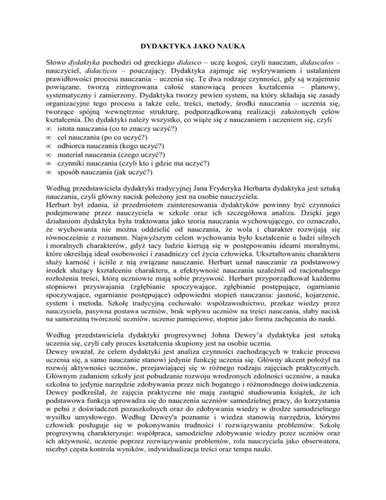 DYDAKTYKA JAKO NAUKA Słowo dydaktyka pochodzi od greckiego didasco – uczę kogoś, czyli nauczam, didascalos – nauczyciel, didacticos – pouczający. Dydaktyka zajmuje się wykrywaniem i ustalaniem prawidłowości procesu nauczania – uczenia się. Te dwa rodzaje czynności, gdy są wzajemnie powiązane, tworzą zintegrowana całość stanowiącą proces kształcenia – planowy, systematyczny i zamierzony. Dydaktyka tworzy pewien system, na który składają się zasady organizacyjne tego procesu a także cele, treści, metody, środki nauczania – uczenia się, tworzące spójną wewnętrznie strukturę, podporządkowaną realizacji założonych celów kształcenia. Do dydaktyki należy wszystko, co wiąże się z nauczaniem i uczeniem się, czyli • istota nauczania (co to znaczy uczyć?) • cel nauczania (po co uczyć?) • odbiorca nauczania (kogo uczyć?) • materiał nauczania (czego uczyć?) • czynniki nauczania (czyli kto i gdzie ma uczyć?) • sposób nauczania (jak uczyć?) Według przedstawiciela dydaktyki tradycyjnej Jana Fryderyka Herbarta dydaktyka jest sztuką nauczania, czyli główny nacisk położony jest na osobie nauczyciela. Herbart był zdania, iż przedmiotem zainteresowania dydaktyków powinny być czynności podejmowane przez nauczyciela w szkole oraz ich szczegółowa analiza. Dzięki jego działaniom dydaktyka była traktowana jako teoria nauczania wychowującego, co oznaczało, że wychowania nie można oddzielić od nauczania, że wola i charakter rozwijają się równocześnie z rozumem. Najwyższym celem wychowania było kształcenie u ludzi silnych i moralnych charakterów, gdyż tacy ludzie kierują się w postępowaniu ideami moralnymi, które określają ideał osobowości i zasadniczy cel życia człowieka. Ukształtowaniu charakteru służy karność i ściśle z nią związane nauczanie. Herbart uznał nauczanie za podstawowy środek służący kształceniu charakteru, a efektywność nauczania uzależnił od racjonalnego rozłożenia treści, którą uczniowie mają sobie przyswoić. Herbart przyporządkował każdemu stopniowi przyswajania (zgłębianie spoczywające, zgłębianie postępujące, ogarnianie spoczywające, ogarnianie postępujące) odpowiedni stopień nauczania: jasność, kojarzenie, system i metoda. Szkołę tradycyjną cechowało: współzawodnictwo, przekaz wiedzy przez nauczyciela, pasywna postawa uczniów, brak wpływu uczniów na treści nauczania, słaby nacisk na samorzutną twórczość uczniów, uczenie pamięciowe, stopnie jako forma zachęcania do nauki. Według przedstawiciela dydaktyki progresywnej Johna Dewey’a dydaktyka jest sztuką uczenia się, czyli cały proces kształcenia skupiony jest na osobie ucznia. Dewey uważał, że celem dydaktyki jest analiza czynności zachodzących w trakcie procesu uczenia się, a samo nauczanie stanowi jedynie funkcję uczenia się. Główny akcent położył na rozwój aktywności uczniów, przejawiającej się w różnego rodzaju zajęciach praktycznych. Głównym zadaniem szkoły jest pobudzanie rozwoju wrodzonych zdolności uczniów, a nauka szkolna to jedynie narzędzie zdobywania przez nich bogatego i różnorodnego doświadczenia. Dewey podkreślał, że zajęcia praktyczne nie mają zastąpić studiowania książek, że ich podstawowa funkcja sprowadza się do nauczenia uczniów samodzielnej pracy, do korzystania w pełni z doświadczeń pozaszkolnych oraz do zdobywania wiedzy w drodze samodzielnego wysiłku umysłowego. Według Dewey'a poznanie i wiedza stanowią narzędzia, którymi człowiek posługuje się w pokonywaniu trudności i rozwiązywaniu problemów. Szkołę progresywną charakteryzuje: współpraca, samodzielne zdobywanie wiedzy przez uczniów oraz ich aktywność, uczenie poprzez rozwiązywanie problemów, rola nauczyciela jako obserwatora, niezbyt częsta kontrola wyników, indywidualizacja treści oraz tempa nauki. DYDAKTYKA MATEMATYKI JAKO NAUKA O PROCESIE NAUCZANIA - UCZENIA SIĘ MATEMATYKI Dydaktyka matematyki jako dydaktyka szczegółowa jest nauką, której przedmiotem badań są zagadnienia związane z procesem nauczania – uczenia się matematyki. Dotyczy ona zarówno treści, metod i środków poglądowych, jak i procesów psychicznych i aktywności matematycznych związanych z tworzeniem i kształtowaniem się pojęć matematycznych, typów rozumowań towarzyszących dowodzeniu twierdzeń czy rozwiązywaniu zadań. Dydaktyka matematyki oprócz badania problemów metodycznych, gdzie szuka odpowiedzi na pytania jak uczyć, jakie stosować metody nauczania, jakie środki dydaktyczne wykorzystać, zajmuje się problemami teoretycznymi poszukującymi prawidłowości uczenia się matematyki oraz rozstrzygnięciami problemów, dlaczego uczyć, kogo i czego uczyć. Główne zadania nauczania matematyki to • opanowanie przez ucznia podstawowych wiadomości z matematyki, • wyrobienie umiejętności posługiwania się metodami matematycznymi i zastosowania matematyki w różnych dziedzinach, • kształcenie logicznego myślenia i umiejętności ścisłego wyrażania myśli przy użyciu pojęć i symboli matematycznych. Przy określaniu terminu "podstawowe wiadomości z matematyki" można brać pod uwagę np. • kryterium naukowe – zależne od poziomu rozwoju matematyki, a więc zmienne w czasie, • kryterium użyteczności – zależne od rozwoju różnych dziedzin wykorzystujących matematykę (informatyka, fizyka, biotechnologia itp.) też zmiennych w czasie, • kryterium elementarnego charakteru matematyki – gdzie każde pojęcie matematyczne może zostać wyabstrahowane z naturalnej matematyzacji znanych uczniowi stosunków rzeczywistych, • kryterium optymalnej organizacji materiału nauczania – wprowadzenie niektórych pojęć daje uczniowi możliwość zrozumienia całej konstrukcji matematyki szkolnej. W nauczaniu matematyki należy zwrócić uwagę na psychiczne i psychologiczne podłoże myślenia matematycznego, sp