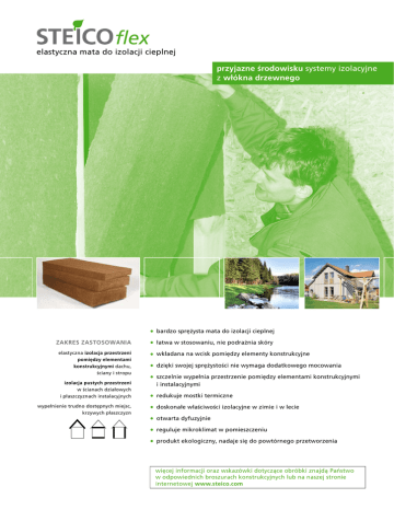 flex elastyczna mata do izolacji cieplnej przyjazne środowisku systemy izolacyjne z włókna drzewnego • bardzo sprężysta mata do izolacji cieplnej ZAKRES ZASTOSOWANIA elastyczna izolacja przestrzeni pomiędzy elementami konstrukcyjnymi dachu, ściany i stropu izolacja pustych przestrzeni w ścianach działowych i płaszczyznach instalacyjnych wypełnienie trudno dostępnych miejsc, krzywych płaszczyzn • łatwa w stosowaniu, nie podrażnia skóry • wkładana na wcisk pomiędzy elementy konstrukcyjne • dzięki swojej sprężystości nie wymaga dodatkowego mocowania • szczelnie wypełnia przestrzenie pomiędzy elementami konstrukcyjnymi i instalacyjnymi • redukuje mostki termiczne • doskonałe właściwości izolacyjne w zimie i w lecie • otwarta dyfuzyjnie • reguluje mikroklimat w pomieszczeniu • produkt ekologiczny, nadaje się do powtórnego przetworzenia więcej informacji oraz wskazówki dotyczące obróbki znajdą Państwo w odpowiednich broszurach konstrukcyjnych lub na naszej stronie internetowej www.steico.com DOSTARCZANE FORMATY STEICOflex maty format [mm] ciężar /m2 [kg] sztuk / pakiet pakiet / paleta 40 1 220 x 575 2,0 10 12 84,18 ok. 186 50 1 220 x 575 2,5 9 10 63,13 ok. 186 60 1 220 x 575 3,0 8 10 56,12 ok. 186 80 1 220 x 575 3,6 6 10 42,09 ok. 170 100 1 220 x 575 4,5 4 12 33,67 ok. 170 120 1 220 x 575 5,4 4 10 28,06 ok. 175 140 1 220 x 575 6,3 4 8 22,45 ok. 160 160 1 220 x 575 7,2 3 10 21,05 ok. 170 180 1 220 x 575 9,0 3 8 18,84 ok. 190 200 1 220 x 575 12,0 2 12 18,84 ok. 245 grubość [mm] powierz. / pal. [m2] ciężar / paleta [kg] STEICOflex klin grubość [mm] format [mm] ciężar /m2 [kg] sztuk / pakiet pakiet / paleta 60 1 220 x 670 3,0 16 10 powierz. / pal. [m2] ciężar / paleta [kg] 65,40 ok. 215 80 1 220 x 670 3,6 12 10 49,05 ok. 195 100 1 220 x 670 4,5 8 12 39,24 ok. 195 120 1 220 x 670 5,4 8 10 32,70 ok. 195 140 1 220 x 670 6,3 8 8 26,16 ok. 185 160 1 220 x 670 7,2 6 10 24,52 ok. 195 180 1 220 x 670 9,0 6 8 19,62 ok. 195 200 1 220 x 670 12,0 4 13 19,62 ok. 255 STEICOflex do elementów prefabrykowanych grubość [mm] format [mm] ciężar /m2 [kg] sztuk / pakiet pakiet / paleta powierz / pal. [m2] ciężar / paleta [kg] 40 1 220 x 625 2,0 10 12 91,50 ok. 200 60 1 220 x 625 3,0 8 10 61,00 ok. 200 80 1 220 x 625 3,6 6 10 45,72 ok. 185 formaty specjalne od 550 do 3 100 mm na zapytanie PARAMETRY TECHNICZNE STEICOflex w pozycji leżącej, w suchym miejscu w przypadku nadmiernej ilości wilgoci należy stworzyć warunki umożliwiające odparowanie wody opakowanie transportowe można usunąć dopiero po ustawieniu palety na stabilnym podłożu WF – EN 13171 – T2 – TR1 – AF5 klasyfikacja ogniowa wg PN EN 13501-1 E deklarowany współczynnik przewodzenia ciepła l D [ W / ( m * K )] 0,038 deklarowany opór cieplny R D [( m2 * K ) / W] 1,05 / 1,30 / 1,55 / 2,10 / 2,60 / 3,15 / 3,65 / 4,20 / 4,70 / 5,25 grubość [mm] 40 / 50 / 60 / 80 / 100 / 120 / 140 / 160 / 180 / 200 współczynnik przewodzenia ciepła wartość obliczeniowa l [W / ( m * K )] 0,039 gęstość [kg / m3] ok. 50 współczynnik oporu dyfuzji pary wodnej m 1/2 właściwa pojemność cieplna c [J / (kg * K)] oporność przepływu powietrza kod odpadu 2100 [( kPa * s ) / m2] ≥5 170604 Zakład produkcyjny certyfikowany zgodnie z STEICO AG Werk Czarnków Z-23.11-1452 ISO 9001:2000 No. 0104-0307-003-1 Dystrybutor: www.steico.com MAGAZYNOWANIE / Transport oznaczenie płyt Zmiany techniczne zastrzeżone. 01 / 2007. Obowiązuje aktualne wydanie. produkcja i kontrola wg PN EN 13171
