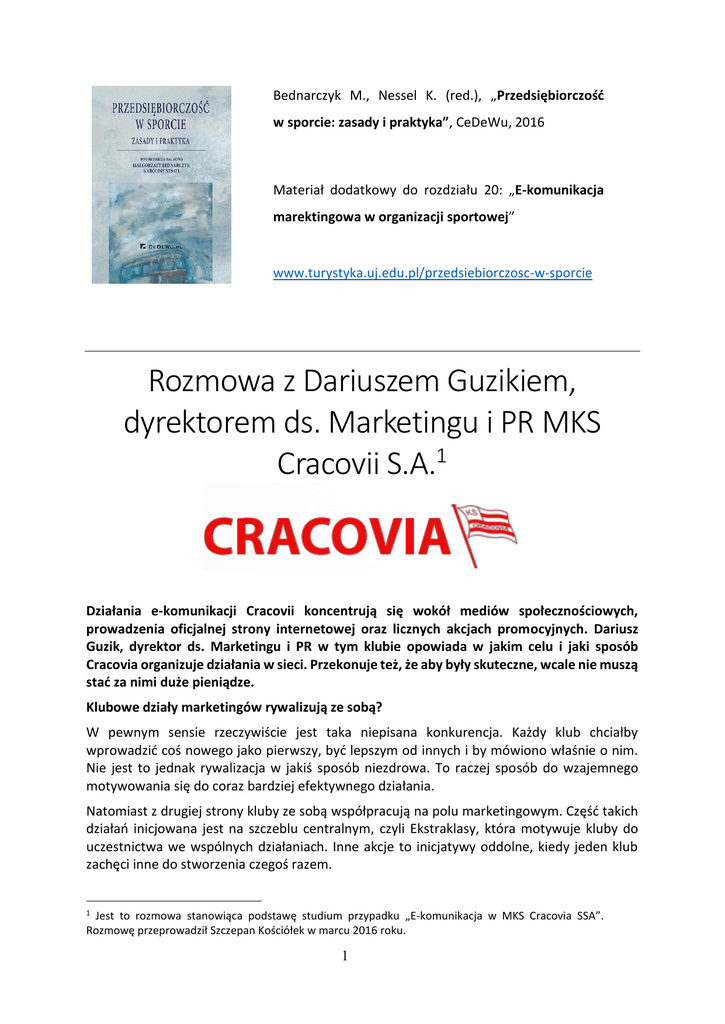 Bednarczyk M., Nessel K. (red.), „Przedsiębiorczość w sporcie: zasady i praktyka”, CeDeWu, 2016 Materiał dodatkowy do rozdziału 20: „E-komunikacja marektingowa w organizacji sportowej” www.turystyka.uj.edu.pl/przedsiebiorczosc-w-sporcie Rozmowa z Dariuszem Guzikiem, dyrektorem ds. Marketingu i PR MKS Cracovii S.A.1 Działania e-komunikacji Cracovii koncentrują się wokół mediów społecznościowych, prowadzenia oficjalnej strony internetowej oraz licznych akcjach promocyjnych. Dariusz Guzik, dyrektor ds. Marketingu i PR w tym klubie opowiada w jakim celu i jaki sposób Cracovia organizuje działania w sieci. Przekonuje też, że aby były skuteczne, wcale nie muszą stać za nimi duże pieniądze. Klubowe działy marketingów rywalizują ze sobą? W pewnym sensie rzeczywiście jest taka niepisana konkurencja. Każdy klub chciałby wprowadzić coś nowego jako pierwszy, być lepszym od innych i by mówiono właśnie o nim. Nie jest to jednak rywalizacja w jakiś sposób niezdrowa. To raczej sposób do wzajemnego motywowania się do coraz bardziej efektywnego działania. Natomiast z drugiej strony kluby ze sobą współpracują na polu marketingowym. Część takich działań inicjowana jest na szczeblu centralnym, czyli Ekstraklasy, która motywuje kluby do uczestnictwa we wspólnych działaniach. Inne akcje to inicjatywy oddolne, kiedy jeden klub zachęci inne do stworzenia czegoś razem. 1 Jest to rozmowa stanowiąca podstawę studium przypadku „E-komunikacja w MKS Cracovia SSA”. Rozmowę przeprowadził Szczepan Kościółek w marcu 2016 roku. 1 W jaki sposób odbywa się ta współpraca? Dobrym przykładem jest ostatnia wspólna głośna akcja spółki Ekstraklasa #NaStadionie. Jest to hasło wypożyczone z naszej kampanii, kiedy komunikowaliśmy sprzedaż biletów i karnetów pod tym właśnie hasztagiem. Przekonaliśmy Ekstraklasę, że #NaStadionie ma potencjał wart wykorzystania w promocji całej ligi. Pomysł bardzo się spodobał. Spółka Ekstraklasa ruszyła z dużą kampanią, a inne kluby włączyły się w tę akcję. Nasza kampania przerodziła się w ogólnopolskie przedsięwzięcie, w którym uczestniczą praktycznie wszystkie kluby Ekstraklasy. Można takimi akcjami pozyskać nowych fanów czy to raczej działania na rzecz większego zaangażowania osób, które rozgrywkami Ekstraklasy już się interesują? Oczywiście, że można. Przecież dostęp do Internetu jest powszechny. Mają go nie tylko kibice, ale też ich znajomi. Jeżeli więc my jako klub zorganizujemy ciekawą akcję, zaproponujemy atrakcyjny produkt, to duża część obecnych fanów udostępni dalej nasze filmy, zdjęcia i grafiki. To doskonały sposób, żeby kibic był ambasadorem Cracovii w sieci. Jaki jest zatem główny cel działań marketingowych w nowych mediach? Nie można mówić, że jest jakiś jeden główny cel. Na pierwszym miejscu stoi jednak wizerunek. Kanał w mediach społecznościowych i strona internetowa współcześnie pełnią funkcję wizytówki. Kibice tak nas postrzegają, jak nas widzą. A widzą nas przy okazji meczów raz na dwa tygodnie oraz przy okazji akcji outdoorowych. Kontakt codzienny natomiast odbywa się drogą internetową. Naszą rolą jest więc, aby każdy użytkownik (nawet ten, który nie jest naszym kibicem) uznał, że Cracovia jest na tyle ciekawym wyborem, ażeby wybrać się na jej mecz. Celem jest takie funkcjonowanie w Internecie, aby odbiór naszego klubu był jak najlepszy. Drugi cel to komunikacja. Z jednej strony klubu z kibicem, z drugiej kibica z klubem. Chodzi o to, aby nie tylko publikować tekst i grafiki, ale uzyskać jakąś informację zwrotną. Jeżeli kibic komunikuje się z nami, czy to mailowo czy poprzez media społecznościowe, zawsze staramy się odpisywać. W dobie obecnych technologii wystarczy nie tylko nie odpisać, ale odpisać niewłaściwie, aby zasięg takiej wiadomości był bardzo szeroki. Jest mnóstwo takich przykładów w Internecie, kiedy to niewłaściwa komunikacja z kibicem trafiła na fora i z błahego tematu zrobiła się duża sprawa. Każdy kibic jest bardzo ważny i staramy się, żeby był zadowolony uzyskując informacje, których szuka. I trzeci główny cel to promocja. Zachęcamy wirtualnych sympatyków, żeby stali się naszymi rzeczywistymi kibicami, czyli pojawili się na naszym meczu czy to piłkarskim, czy hokejowym. Jest to właśnie cel działań w mediach społecznościowych. Cieszymy się oczywiście, kiedy nasze akcje komuś się podobają, ale największym sukcesem jest ściągnięcie tej osoby na widowisko sportowe. W jaki sposób mierzycie realizację tych celów? Monitorujemy na bieżąco zasięgi postów, zaangażowanie. Staramy się używać też dostępnych narzędzi. Aktualnie prowadzimy na przykład akcję „Małopolska za Cracovią”, w ramach której mieszkańcy jednego miasta mają możliwość wejścia na stadion za jeden złoty. Żeby tak się stało, wcześniej uruchamiamy tzw. machinę. Kibice mają pole do popisu. Głosując wskazują miasto, które ma zostać beneficjentem akcji w najbliższym meczu. Mieszkaniec tego miasta przy zakupie biletu na mecz musi udokumentować swoje miejsce zamieszkania. To daje nam możliwość monitorowania, jak kampania przekłada się na frekwencję na stadionie w dniu meczu. 2 Naszym zdaniem najlepszą formą reklamy jest ta „e-poczta pantoflowa” oraz ogólnie działania promocyjne w Internecie. Mamy prawie 100 tysięcy polubień na Facebooku. Na nasze mecze chodzi średnio od 8 do 10 tysięcy osób. Jest to więc 8-10% grupy, do której możemy trafić na Facebooku. Skoro nas obserwują, to dlaczego nie miałyby się pojawić na naszych trybunach? Chcemy zachęcić nie tylko te osoby, ale także ich znajomych. Takie działanie jest w stanie dać dużo lepsze efekty niż duże wydatki na reklamę tradycyjną. Posiłkujecie się płatnymi formami promocji? Nie. Wychodzimy z założenia, że darmowe narzędzia dają wysta