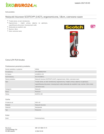 Izabelin 2017-03-03 Karta produktu: Nożyczki biurowe SCOTCH® (1427), ergonomiczne, 18cm, czerwono-szare Trwałe ostrze, ze stali nierdzewnej Ergonomiczny i miękki uchwyt, odporny na pęknięcia, wyprofilowany dla prawo i leworęcznych osób Doskonałe do wszelkich cięć Rozmiar: 18cm Kolor czerwono-szary Cena 6,94 PLN brutto Podstawowe parametry produktu Numer produktu w systemie 20266 Nr dostawcy 3M-XX004827034 Nr Celcen 18-00922-135 Kod kreskowy 051135208311 Nazwa produktu Nożyczki biurowe SCOTCH® (1427), ergonomiczne, 18cm, czerwono-szare Opis Trwałe ostrze, ze stali nierdzewnej; ergonomiczny i miękki uchwyt, odporny na pęknięcia, wyprofilowany dla prawo i leworęcznych osób; doskonałe do wszelkich cięć; rozmiar: 18cm; kolor czerwono-szary Kategoria Nożyczki Klasa Premium Marka SCOTCH-3M Cecha W ofercie od 2013-10 Produkt Nożyczki biurowe Materiał Stal/plastik Typ Klasyczne Kolor Kolor Czerwony/szary Eko biuro ul Krasińskiego 23a 05-080 Izabelin NIP: 527-000-75-75 22 864 54 84 Izabelin 2017-03-03 Karta katalogowa produktu cd. Nożyczki biurowe SCOTCH® (1427), ergonomiczne, 18cm, czerwono-szare Wymiary Rozmiar 18cm Wspólny słownik zamówień CPV 39241200-5 Nożyczki Certyfikaty Hit Hit Nowy produkt w ofercie Standard Serdecznie zapraszamy do współpracy Eko biuro zespół. Eko biuro ul Krasińskiego 23a 05-080 Izabelin NIP: 527-000-75-75 22 864 54 84