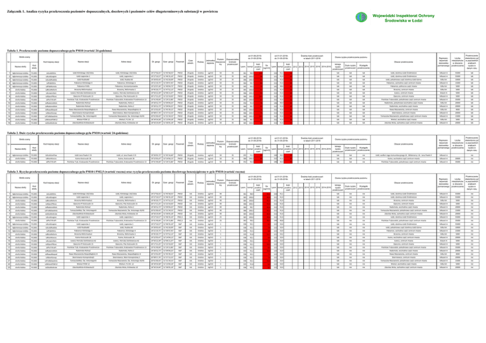 Załącznik 1. Analiza ryzyka przekroczenia poziomów dopuszczalnych, docelowych i poziomów celów długoterminowych substancji w powietrzu Wojewódzki Inspektorat Ochrony Środowiska w Łodzi Tabela 1. Przekroczenie poziomu dopuszczalnego pyłu PM10 (wartość 24-godzinna) od 01-06-2015r. do 31-05-2016r. Strefa oceny Lp. Kod krajowy stacji Nazwa stacji Adres stacji Dł. geogr. Szer. geogr. Średnia iIość przekroczeń w latach 2011-2016 od 01-01-2016r. do 31-05-2016r. Ocena ryzyka przekroczenia poziomu Przekroczenie Liczba stwierdzono już mieszkańców w poprzednich w obszarze analizach przekroczenia ryzyka w danym roku Obszar przekroczenia Reprezentatywność stanowiska pomiarowego tak Łódź, dzielnica Łódź-Śródmieście kilkaset m 55000 tak tak Łódź, dzielnica Łódź-Śródmieście kilkaset m 55000 tak tak tak Łódź, południowa część dzielnicy Łódź-Górna kilka km 10000 tak tak tak tak Pabianice, zachodnia część centrum miasta kilkaset m 15000 tak 42 tak tak tak Pabianice, północna część miasta kilka km 5000 tak 41,4 59 tak tak tak Brzeziny, centrum miasta kilka km 5000 tak 152 41,6 49 tak tak tak Łowicz, centrum miasta kilaset m 5000 tak 165 152 41,6 93 tak tak tak Opoczno, centrum miasta kilkaset m 5000 tak 100,0 87 152 41,6 52 tak tak tak Piotrków Trybunalski, południowa część centrum miasta kilkaset m 35000 tak 350 95,9 76 146 40,0 43 tak tak tak Radomsko, południowo-wschodnia część miasta kilka km 20000 tak 35 364 99,7 92 152 41,6 49 tak tak tak Radomsko, wschodnia część miasta kilkaset m 20000 tak 50 35 365 100,0 76 152 41,6 43 tak tak tak Rawa Mazowiecka, centrum miasta kilka km 4000 tak ug/m3 50 35 366 100,3 75 152 41,6 42 tak tak tak Skierniewice, centrum miasta kilkaset m 20000 tak średnia ug/m3 50 35 366 100,3 101 152 41,6 56 tak tak tak Tomaszów Mazowiecki, południowa część centrum miasta kilkaset m 15000 tak 24-godz. średnia ug/m3 50 35 364 99,7 67 152 41,6 38 tak tak tak Wieluń, wschodnia część miasta kilka km 5000 tak PM10 24-godz. średnia ug/m3 50 35 365 100,0 95 152 41,6 57 tak tak tak Zduńska Wola, zachodnia część centrum miasta kilkaset m 20000 tak Parametr Czas uśredn. Rodzaj Obszar przekroczenia Reprezentatywność stanowiska pomiarowego Parametr Czas uśredn. Rodzaj Poziom Dopuszczalna Jednostka dopuszcza krotność stężenia lny przekroczeń ilość ilość Istnieje Sa Duże ryzyko Wystąpiło l.pom. kompl. przekrol.pom. kompl. przekro- 2012 2013 2014 2015 2016 2014-2016 ryzyko [ug/m3] przekroczeń przekroczenie czeń czeń przekroczeń Nazwa strefy Kod strefy 1 Aglomeracja Łódzka PL1001 LdLodzKilins Łódź-Kilińskiego 102/102a Łódź, Kilińskiego 102/102a 19°27'56,41'' 51°45'58,55'' PM10 24-godz. średnia ug/m3 50 35 361 98,9 110 150 41,1 54 tak tak 2 Aglomeracja Łódzka PL1001 LdLodzLegion Łódź-Legionów 1 Łódź, Legionów 1 19°27'10,57'' 51°46'35,10'' PM10 24-godz. średnia ug/m3 50 35 365 100,0 98 151 41,4 49 tak tak 3 Aglomeracja Łódzka PL1001 LdLodzRudzka Łódź-Rudzka60 Łódź, Rudzka 60 19°26'05,43'' 51°42'20,09'' PM10 24-godz. średnia ug/m3 50 35 366 100,3 85 152 41,6 49 tak 4 Aglomeracja Łódzka PL1001 LdPabiKilins Pabianice-Kilińskiego 4 Pabianice, Kilińskiego 4 19°21'19,75'' 51°39'47,45'' PM10 24-godz. średnia ug/m3 50 35 364 99,7 84 152 41,6 49 5 Aglomeracja Łódzka PL1001 LdPabiKonsta Pabianice-Polfa Pabianice, Konstantynowska 19°22'07,26'' 51°40'04,73'' PM10 24-godz. średnia ug/m3 50 35 345 94,5 70 141 38,6 6 strefa łódzka PL1002 LdBrzeReform Brzeziny-Reformacka1 Brzeziny, Reformacka 1 19°45'20,77'' 51°47'52,13'' PM10 24-godz. średnia ug/m3 50 35 365 100,0 97 151 7 strefa łódzka PL1002 LdLowiczSien Łowicz-Henryka Sienkiewicza 62 Łowicz, Henryka Sienkiewicza 62 19°56'22,39'' 52°06'21,07'' PM10 24-godz. średnia ug/m3 50 35 366 100,3 93 8 strefa łódzka PL1002 LdOpocPlKosc Opoczno-Pl Kościuszki 15 Opoczno, Plac Kościuszki 15 20°17'21,25'' 51°22'33,03'' PM10 24-godz. średnia ug/m3 50 35 366 100,3 9 strefa łódzka PL1002 LdPioTrKraPr Piotrków Tryb.-Krakowskie Przedmieście Piotrków Trybunalski, Krakowskie Przedmieście 13 19°41'49,04'' 51°24'15,86'' PM10 24-godz. średnia ug/m3 50 35 365 10 strefa łódzka PL1002 LdRadomsRoln Radomsko-Rolna2 Radomsko, Rolna 2 19°26'52,73'' 51°04'04,25'' PM10 24-godz. średnia ug/m3 50 35 11 strefa łódzka PL1002 LdRadomsRoln Radomsko-Rolna2 Radomsko, Rolna 2 19°26'52,73'' 51°04'04,25'' PM10 24-godz. średnia ug/m3 50 12 strefa łódzka PL1002 LdRawaNiepod Rawa Mazowiecka-Niepodległości 8 Rawa Mazowiecka, Niepodległości 8 20°15'02,05'' 51°45'39,15'' PM10 24-godz. średnia ug/m3 13 strefa łódzka PL1002 LdSkierKonop Skierniewice-Konopnickiej5 Skierniewice, Marii Konopnickiej 5 20°08'57,76'' 51°57'15,53'' PM10 24-godz. średnia 14 strefa łódzka PL1002 LdToMaSwAnto TomaszówMaz.-Św. Antoniego43 Tomaszów Mazowiecki, Św. Antoniego 43/45 20°01'00,43'' 51°31'34,53'' PM10 24-godz. 15 strefa łódzka PL1002 LdWieluPOW12 Wieluń-POW 12 Wieluń, P.O.W. 12 18°34'54,58'' 51°13'04,18'' PM10 16 strefa łódzka PL1002 LdZduWoKrole ZduńskaWola-Królewska10 Zduńska Wola, Królewska 10 18°56'24,44'' 51°36'05,18'' Dł. geogr. Szer. geogr. Tabela 2. Duże ryzyko przekroczenia poziomu dopuszczalnego pyłu PM10 (wartość 24-godzinna) od 01-06-2015r. do 31-05-2016r. Strefa oceny Lp. Kod krajowy stacji Nazwa stacji Adres stacji Poziom Dopuszczalna Jednostka dopuszcza krotność stężenia lny przekroczeń Średnia iIość przekroczeń w latach 2011-2016 od 01-01-2016r. do 31-05-2016r. Ocena ryzyka przekroczenia poziomu ilość ilość Istnieje Sa Duże ryzyko Wystąpiło l.pom. kompl. przekrol.pom. kompl. przekro- 2012 2013 2014 2015 2016 2014-2016 ryzyko [ug/m3] przekroczeń przekroczenie czeń czeń przekroczeń Przekroczenie Liczba stwierdzono już mieszkańców w poprzednich w obszarze analizach przekroczenia ryzyka w danym roku Nazwa strefy Kod strefy 1 Aglomeracja Łódzka PL1001 LdLodzJanPaw Ł