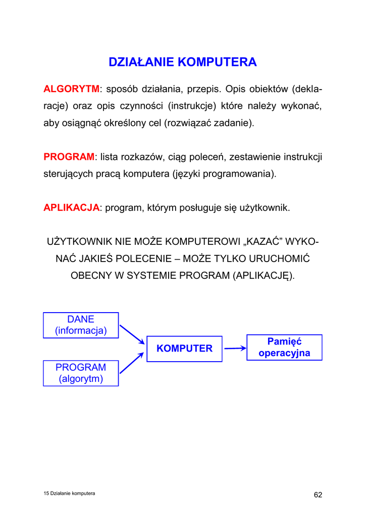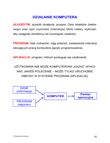 DZIAŁANIE KOMPUTERA ALGORYTM: sposób działania, przepis. Opis obiektów (deklaracje) oraz opis czynności (instrukcje) które należy wykonać, aby osiągnąć określony cel (rozwiązać zadanie). PROGRAM: lista rozkazów, ciąg poleceń, zestawienie instrukcji sterujących pracą komputera (języki programowania). APLIKACJA: program, którym posługuje się użytkownik. UŻYTKOWNIK NIE MOŻE KOMPUTEROWI „KAZAĆ” WYKONAĆ JAKIEŚ POLECENIE – MOŻE TYLKO URUCHOMIĆ OBECNY W SYSTEMIE PROGRAM (APLIKACJĘ). DANE (informacja) KOMPUTER Pamięć operacyjna PROGRAM (algorytm) 15 Działanie komputera 62 Architektura komputera von Neumanna DANE Urządzenia wejścia PROGRAM Pamięć operacyjna Urządzenia wyjścia WYNIKI Pamięć zewnętrzna Jednostka sterująca PROCESOR Jednostka centralna CPU (Central procesor unit) Pamięć zewnętrzna Urządzenia wejścia Pamięć operacyjna Urządzenia wyjścia Rejestr rozkazów Układ sterowania Arytmometr PROCESOR Akumulator Jednostka centralna CPU (Central procesor unit) 15 Działanie komputera 63 KOMPUTER – jednostka centralna i urządzenia zewnętrzne DANE PROGRAM WEJŚCIE PAMIĘĆ OPERACYJNA PROCESOR Układ sterowania Rejestry (licznik rozkazów, rejestr rozkazów) Arytmometr Akumulator JEDNOSTKA CENTRALNA WYJŚCIE 15 Działanie komputera 64