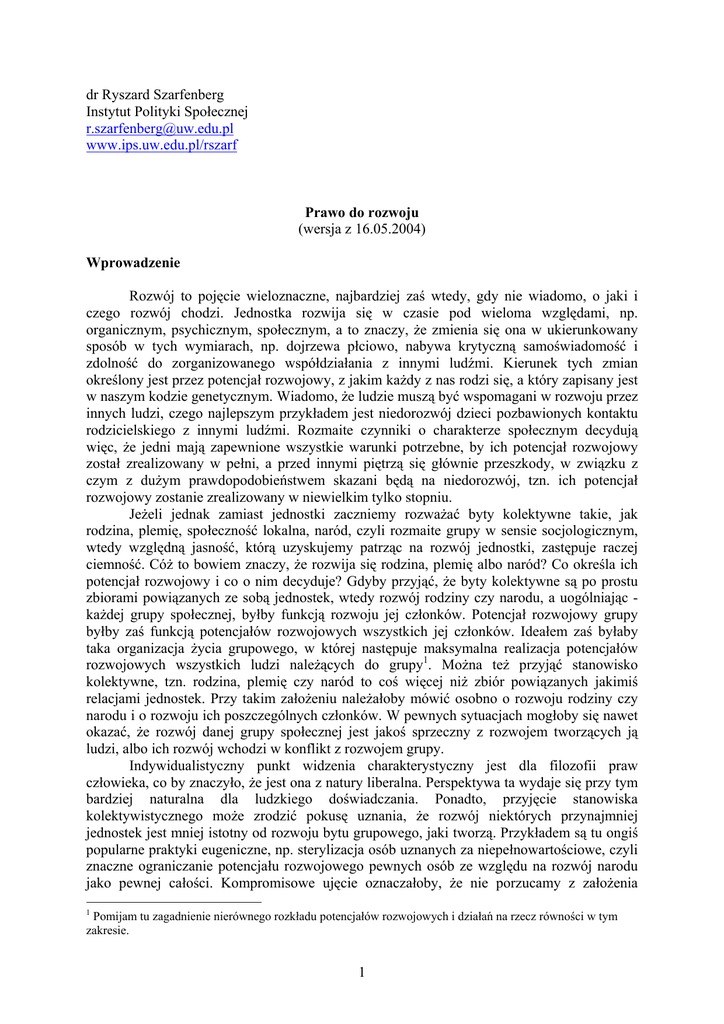 Prawo do rozwoju - dr hab. Ryszard Szarfenberg