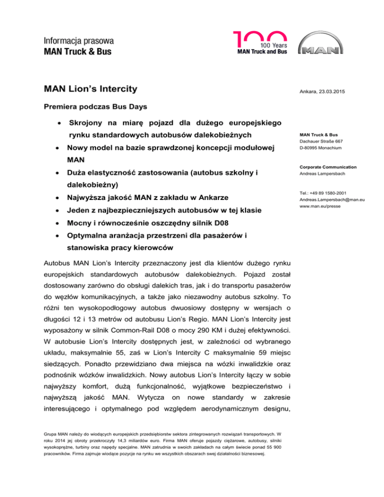 MAN Lion’s Intercity Ankara, 23.03.2015 Premiera podczas Bus Days Skrojony na miarę pojazd dla dużego europejskiego rynku standardowych autobusów dalekobieżnych MAN Truck & Bus Dachauer Straße 667 Nowy model na bazie sprawdzonej koncepcji modułowej D-80995 Monachium MAN Corporate Communication Duża elastyczność zastosowania (autobus szkolny i Andreas Lampersbach dalekobieżny) Tel.: +49 89 1580-2001 Najwyższa jakość MAN z zakładu w Ankarze Jeden z najbezpieczniejszych autobusów w tej klasie Mocny i równocześnie oszczędny silnik D08 Optymalna aranżacja przestrzeni dla pasażerów i [email protected] www.man.eu/presse stanowiska pracy kierowców Autobus MAN Lion’s Intercity przeznaczony jest dla klientów dużego rynku europejskich standardowych autobusów dalekobieżnych. Pojazd został dostosowany zarówno do obsługi dalekich tras, jak i do transportu pasażerów do węzłów komunikacyjnych, a także jako niezawodny autobus szkolny. To różni ten wysokopodłogowy autobus dwuosiowy dostępny w wersjach o długości 12 i 13 metrów od autobusu Lion’s Regio. MAN Lion’s Intercity jest wyposażony w silnik Common-Rail D08 o mocy 290 KM i dużej efektywności. W autobusie Lion’s Intercity dostępnych jest, w zależności od wybranego układu, maksymalnie 55, zaś w Lion’s Intercity C maksymalnie 59 miejsc siedzących. Ponadto przewidziano dwa miejsca na wózki inwalidzkie oraz podnośnik wózków inwalidzkich. Nowy autobus Lion’s Intercity łączy w sobie najwyższy komfort, dużą funkcjonalność, wyjątkowe bezpieczeństwo i najwyższą jakość MAN. Wytycza on nowe standardy w zakresie interesującego i optymalnego pod względem aerodynamicznym designu, Grupa MAN należy do wiodących europejskich przedsiębiorstw sektora zintegrowanych rozwiązań transportowych. W roku 2014 jej obroty przekroczyły 14,3 miliardów euro. Firma MAN oferuje pojazdy ciężarowe, autobusy, silniki wysokoprężne, turbiny oraz napędy specjalne. MAN zatrudnia w swoich zakładach na całym świecie ponad 55 900 pracowników. Firma zajmuje wiodące pozycje na rynku we wszystkich obszarach swej działalności biznesowej. -2- doskonałych właściwości jazdy, a przede wszystkim w zakresie doskonałych parametrów zużycia paliwa i niskich kosztów cyklu życia (Life-Cycle-Costs). Nowy model na bazie sprawdzonej koncepcji modułowej MAN Autobus MAN Lion’s Intercity został całkowicie od nowa zaprojektowany na podstawie sprawdzonego modelu MAN, w celu jak najlepszego spełnienia oczekiwań klientów w segmencie standardowych autobusów dalekobieżnych. Konstruktorzy koncentrowali się na zapewnieniu jak najniższych kosztów eksploatacji. W tym kontekście istotną rolę odgrywa lekka konstrukcja, dogodne warunki przeprowadzania przeglądów i napraw oraz niskie zużycie paliwa dzięki zastosowaniu silnika MAN Common-Rail D08 o mocy 290 KM. MAN Lion’s Intercity: optymalne wyposażenie Autobus MAN Lion’s Intercity został pod każdym względem optymalnie zaprojektowany zarówno jako autobus dalekobieżny jak i szkolny. Jego pragmatyczny design wyraźnie nawiązuje do rodziny autobusów MAN. Stanowisko pracy kierowców autobusu Lion’s Intercity przeznaczonego do realizacji połączeń liniowych charakteryzuje się prostą obsługą i dużą przestrzenią. W ramach bogatego wyposażenia specjalnego producent przewidział dla każdego zastosowania: wyjątkowo dużo schowków i skrytek ergonomicznie wyprofilowany fotel kierowcy system Multi Media Coach (MMC) z nawigacją kierownicę wielofunkcyjną gniazdko 12 i 24 V ogrzewane lusterka zewnętrzne elektryczne rolety od strony kierowcy pilot do obsługi drzwi lodówkę z przodu o pojemności 41 litrów miejsce i możliwość podłączenia kasy liczącej/drukarki biletów dodatkowe schowki przy stanowisku kierowcy siedzenie dla osoby towarzyszącej kierowcy reflektory przeciwmgielne ogrzewane lusterka zewnętrzne kamera do jazdy wstecz Strona 2/9 -3- kamera do monitoringu 2. drzwi W wersji seryjnej dostępne są światła do jazdy dziennej. W pomieszczeniu dla pasażerów można odpowiednio do przeznaczenia autobusu zainstalować optymalną klimatyzację i zasłony. Opcjonalnie możliwe są okna z podwójnymi szybami. Ogrzewanie i klimatyzacja posiadają odrębną regulację dla stanowiska kierowcy i pomieszczenia dla pasażerów. W wersji seryjnej pojazd jest wyposażony w okna uchylne, opcjonalnie dostępna jest klimatyzacja na dachu o dużej wydajności. Wyposażenie seryjne obejmuje ogrzewanie przy zastosowaniu dmuchawy, opcjonalnie można zamówić ogrzewanie konwektorowe. Pojazd oferuje 55 miejsc siedzących i 29 miejsc stojących (Lion’s Intercity) lub 59 miejsc siedzących i 25 stojących (Lion’s Intercity C). Miejsca siedzące montowane na podestach to model Intercity Lite (dostawca Kiel). Autobus Lion’s Intercity posiada maksymalnie 15/14 (odpowiednio z lewej/prawej strony) rzędów siedzeń, zaś model Lion’s Intercity C maksymalnie 16/15 rzędów. Dzięki zastosowaniu optymalnie elastycznego systemu modułowego klient może zaprojektować pojazd, uwzględniając specyfikę jego przeznaczenia, na przykład montując maksymalną liczbę siedzeń lub stosując zdejmowany podest, tak by zapewnić miejsce dla maksymalnie dwóch wózków inwalidzkich lub pasażerów podróżujących na stojąco. Dzięki zdejmowanemu podestowi można także przewozić wózki dziecięce. Autobus ma wygodne wejście przez dwoje pojedynczych, przeszklonych, otwieranych pneumatycznie na zewnątrz drzwi; Drzwi tylne dostępne są w wersji pojedynczej lub podwójnej. Drzwi obsługiwane są przyciskami lub opcjonalnie przy pomocy pilota. Wejście z trzema stopniami jest proste i bezpieczne, dostosowane specjalnie do potrzeb autobusu szkolnego. Ponadto znajdujący się przy tylnych drzwiach podnośnik zapewnia swobodny, pozbawiony barier dostęp do pojazdu. Przestrzeń pasażerska jest jasna i estetycznie zaprojektowana. Podłoga w korytarz