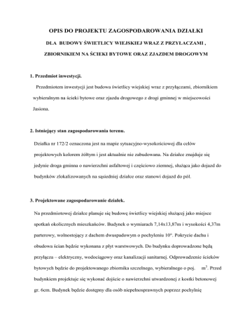 OPIS DO PROJEKTU ZAGOSPODAROWANIA DZIAŁKI DLA BUDOWY ŚWIETLICY WIEJSKIEJ WRAZ Z PRZYŁACZAMI , ZBIORNIKIEM NA ŚCIEKI BYTOWE ORAZ ZJAZDEM DROGOWYM 1. Przedmiot inwestycji. Przedmiotem inwestycji jest budowa świetlicy wiejskiej wraz z przyłączami, zbiornikiem wybieralnym na ścieki bytowe oraz zjazdu drogowego z drogi gminnej w miejscowości Jasiona. 2. Istniejący stan zagospodarowania terenu. Działka nr 172/2 oznaczona jest na mapie sytuacyjno-wysokościowej dla celów projektowych kolorem żółtym i jest aktualnie nie zabudowana. Na działce znajduje się jedynie droga gminna o nawierzchni asfaltowej i częściowo ziemnej, służąca jako dojazd do budynków zlokalizowanych na sąsiedniej działce oraz stanowi dojazd do pól. 3. Projektowane zagospodarowanie działek. Na przedmiotowej działce planuje się budowę świetlicy wiejskiej służącej jako miejsce spotkań okolicznych mieszkańców. Budynek o wymiarach 7,14x13,87m i wysokości 4,37m parterowy, wolnostojący z dachem dwuspadowym o pochyleniu 10°. Pokrycie dachu i obudowa ścian będzie wykonana z płyt warstwowych. Do budynku doprowadzone będą przyłącza – elektryczny, wodociągowy oraz kanalizacji sanitarnej. Odprowadzenie ścieków bytowych będzie do projektowanego zbiornika szczelnego, wybieralnego o poj. m3. Przed budynkiem projektuje się wykonać dojście o nawierzchni utwardzonej z kostki betonowej gr. 6cm. Budynek będzie dostępny dla osób niepełnosprawnych poprzez pochylnię zlokalizowaną przy głównym wejściu. Projektuje się również wykonanie miejsc postojowych dla samochodów osobowych w ilości 4 miejsc o wymiarach 2,4x5,0m. Nawierzchnia miejsc postojowych będzie utwardzona z kruszywa łamanego. Na działce wydzielono miejsce do gromadzenia odpadów stałych w kontenerze wolnostojącym. Przedmiotowa działka wykazuje dość duże pochylenie terenu stąd też przyszła inwestycja będzie wymagać niwelacji terenu oraz budowę skarp. Usytuowanie budynku, przyłączy oraz miejsc parkingowych pokazano na mapie do celów projektowych w skali 1:500. 4. Bilans terenu. Działka posiada powierzchnię ogólną 1700m2. Na powierzchnię wymienioną składają się następujące obiekty: Powierzchnia w m2 Procent pow. działki Razem powierzchnia działki 1700,0 Istniejace drogi 400,0 23,5 Projektowane budynki 99,0 5,8 Proj. dojścia, dojazdy i naw. utwardzone 143,0 8,4 Razem budynki, dojścia i naw. utwardzone 642,0 37,8 Wskaźnik wielkości powierzchni zabudowy Pow. biologicznie czynna 5,8 1058,0 5. Ochrona zabytków Przedmiotowa działka nie jest wpisana do rejestru zabytków. 6. Budynek nie podlega wpływom eksploatacji górniczej. 62,2 7. Ochrona przeciwpożarowa Projekt budowlany zgodnie z Rozporządzeniem Ministra Spraw Wewnętrznych i Administracji z dnia 16 czerwca 2003 r. (Dz.Ust. Nr.121 poz. 1137) podlega sprawdzeniu pod względem ochrony p. pożarowej. 8. Dane charakteryzujące wpływ obiektu na środowisko naturalne. a) emisja zanieczyszczeń Nie przewiduje się żadnych źródeł emisji zanieczyszczeń b) emisja hałasu, wibracji i promieniowania Projektowany obiekt nie będzie emitował wibracji ani promieniowania a poziom hałasu będzie mieścił się w normach. c) wpływ na środowisko naturalne Nie przewiduje się zagrożeń środowiska przy eksploatacji przedmiotowego obiektu. Przewidywany pobór wody pitnej będzie wynosił 1,00m3/dobę. Ścieki o charakterze komunalnym odpływać będą do projektowanego zbiornika szczelnego, wybieralnego a następnie odbierane będą i odwożone do oczyszczalni ścieków przez wyspecjalizowaną firmę w ilości porównywalnej do ilości pobranej wody. Odpady stałe komunalne gromadzone będą w pojemnikach i odwożone na gminne wysypisko śmieci. . Obiekt ogrzewany będzie energią elektryczną, stąd też nie będą przy tym emitowane żadne zanieczyszczenia. Projektowana budowa nie pogorszy warunków ochrony środowiska i sanitarnych. Wody opadowe odprowadzane będą na działkę inwestora. Glebę urodzajną z wykopów pod budynkiem należy rozplanować na terenie działki. 9. Charakterystyka geologiczna. Projektowany obiekt należy do I kategorii geotechnicznej. Podczas badań gruntowych stwierdzono występowanie gliny przewarstwionej piaskami gliniastymi. W przypadku wystąpienia innych warstw gruntów należy skontaktować się z projektantem. Odbiorowi przez projektanta podlegają również wykopy pod fundamenty. ----------------------------------