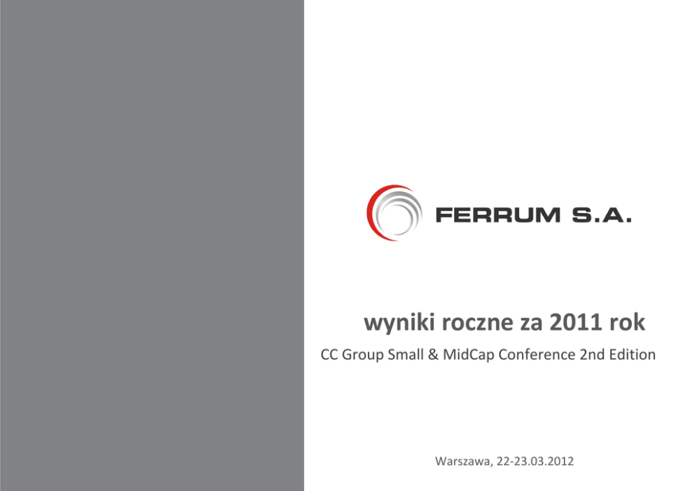wyniki roczne za 2011 rok CC Group Small & MidCap Conference 2nd Edition Warszawa, 22‐23.03.2012 dane rynkowe spółka Ferrum S.A. liczba akcji 24.543.252 akcje zwykłe na okaziciela kapitalizacja 277,1 mln zł /20 marca 2012 r., kurs 11,29 zł/ free float 32,9% indeks, sektor WIG, sWIG80, metalowy rynek notowań Podstawowy 5 PLUS ticker FER Zarząd Spółki Grzegorz Szymczyk – Prezes Zarządu Jarosław Zuzelski – Wiceprezes Zarządu strona www www.ferrum.com.pl kontakt IR 2 highlights 4Q 2011 ◦ ◦ ◦ ◦ ◦ ◦ ◦ rekordowa sprzedaż w 4Q 2011: 109,1 mln zł /+29,8% rdr/, skokowy wzrost przychodów ze sprzedaży towarów i materiałów dzięki realizacji kontraktów dla Gaz‐System wzrost skali działalności wpływa na wyższą absorpcję kosztów stałych i poprawę marży w 4Q 2011 nowa inwestycja ‐ uruchomienie kolejnej linii do izolacji rur, linia do epoksydowania rur pozwoli na znaczące ograniczenie kosztu usług obcych dzięki wydłużeniu łańcucha wartości dodanej oraz obsługę zwiększonych zamówień od Gaz‐Systemu obniżenie bazy kosztów stałych w spółce ZKS Ferrum /głównie wynagrodzenia i koszt usług obcych/ przyczyniło się między innymi do wypracowania dodatniego wyniku netto w ZKS za cały 2011 r. /w 2010 strata netto na poziomie ‐13 mln zł/ planowane dalsze inwestycje modernizacyjne w ZKS Ferrum nakierowane na usprawnienie procesu produkcyjnego, skrócenie tzw. lead time i poszerzenie asortymentu wyrobów realizacja programu skupu akcji własnych – skupione akcje reprezentujące 5,15% kapitału w 1H 2012 planowane zakończenie rozliczeń instrumentów walutowych dotychczas obciążających wynik /w 2011 rozliczone 5,7 mln EUR, którego koszt wyniósł ‐5,3 mln zł/ 3 podsumowanie informacji o Grupie Ferrum rynki operacyjne ◦ Polska /80%/ ◦ dominujące zagraniczne: Niemcy, Węgry, Austria, Dania, Szwecja FERRUM S.A. ◦ rury spiralnie spawane ◦ rury zgrzewane ◦ rury wzdłużnie spawane ◦ izolacje ◦ profile 100% segment rur i profili Ferrum Marketing Sp. z o.o. ◦ działalność marketingowa i promocyjna ZKS Ferrum S.A. ◦ zbiorniki ◦ piece ◦ konstrukcje dla energetyki ◦ konstrukcje stalowe odbiorcy ‐ branże ◦ ciepłownictwo i energetyka ◦ petrochemia ◦ gazownictwo ◦ budownictwo infrastrukturalne segment marketingu segment konstrukcji spawanych Ferrum – krajowy lider w produkcji rur do przesyłu mediów 100% ◦ ◦ około 50% udział Ferrum S.A. w krajowym rynku produkcji rur stalowych ze szwem ponad 80% udział Ferrum S.A. w krajowym rynku produkcji rur stalowych ze szwem do przesyłu mediów 4 dobre perspektywy dla branży ◦ ◦ ◦ wahania cen stali pod wpływem czynników makroekonomicznych, głównie popytu w sektorze budownictwa w Chinach i sytuacji finansów publicznych krajów strefy euro w 2012 oczekiwana jest stabilizacja ceny stali na świecie i w Europie stopniowy wzrost produkcji rur stalowych w Polsce od kryzysowego 2009 r. 2800 483 2600 380 417 401 409 384 391 347 2400 2200 2000 1800 1600 1400 2004 2005 2006 2007 2008 2009 produkcja rur stalowych w Polsce (tys. t) źródło: GUS 2010 2011 1200 01‐2010 16‐2010 31‐2010 46‐2010 10‐2011 25‐2011 40‐2011 04‐2012 ceny blachy gorącowalcowanej St3S (zł/t) źródło: PUDS, na osi poziomej zaznaczony numer tygodnia w danym roku 5 przychody ze sprzedaży Grupy Ferrum ◦ +29,8% ◦ 109,1 94,6 84,0 72,0 79,7 80,1 66,8 51,3 8,4% 11,4% 11,5% ◦ 8,4% 8,0% 2,6% ◦ ‐2,2% ‐13,3% 1Q 2010 2Q 2010 3Q 2010 4Q 2010 1Q 2011 2Q 2011 3Q 2011 przychody /mln zł/ marża brutto ze sprzedaży 4Q 2011 rekordowy w historii kwartał – realizacja znaczących zleceń dla Gaz System poprawa koniunktury w branży w począwszy od 2011 umożliwiła sprzedaż części zapasów po wyższych cenach ‐ odwrócenie odpisów aktualizujących zapasy wyrobów gotowych utworzonych na koniec 2010 – dodatni wpływ na marżę brutto ze sprzedaży +9,3 mln zł w skali 2011 roku osiągnięcie wyniku brutto ze sprzedaży na poziomie 9,2 mln zł w 4Q 2011 i 28,5 mln zł w całym 2011 zmniejszenie udziału eksportu w sprzedaży w 2011 do 24% na skutek pozyskania większych zamówień na rynku krajowym /w 2010 34% sprzedaży skierowano na eksport/ struktura sprzedaży Grupy według branż odbiorców 2011 w tys. zł przychody ze sprzedaży wynik brutto ze sprzedaży marża brutto ze sprzedaży % 4Q 2011 4Q 2010 zmiana rdr 1Q 2011 109,1 84,0 +25,1 94,6 9,2 ‐11,2 +20,4 10,9 8,4% ‐13,3% +21,7 p.p. 11,5% gazownictwo 60% pozostałe 4% geotermia 2% budownictwo 3% segment wod‐kan 4% składy 6% ciepłownictwo 21% 6 segment rur* +37,2% 107,7 ◦ 89,7 78,5 66,6 13,2% 7,8% 45,1 4,6% 63,5 74,5 osiągnięcie 107,6 mln zł sprzedaży w segmencie rur /+37,2% rdr/ 76,9 14,3% 9,8% 9,4% ‐3,1% ‐11,8% 1Q 2010 2Q 2010 3Q 2010 4Q 2010 1Q 2011 sprzedaż segmentu rur /mln PLN/ 2Q 2011 3Q 2011 4Q 2011 marża EBITDA /%/ ◦ 79,1 73,7 62,9 57,6 54,5 61,8 49,9 40,8 23,6 17,8 1Q 2010 21,4 17,0 2Q 2010 3Q 2010 4Q 2010 sprzedaż rur wartościowo /mln zł/ ◦ spadek sprzedaży rur wyprodukowanych w Ferrum wynika z koncentracji Grupy na realizacji zamówień dla Gaz‐Systemu ‐ przy wykorzystaniu dostaw rur surowych od zewnętrznych dostawców wykorzystanie mocy produkcyjnych w segmencie rur na poziomie 74% w 2011 względem 86% w 2010 24,7 1Q 2011 17,0 19,2 2Q 2011 3Q 2011 15,1 4Q 2011 sprzedaż rur ilościowo /tys. t/ * przychody zaprezentowane bez wyłączeń pomiędzy segmentami; wyłączenia nie przekraczają 1,5% sumy przychodów poszczególnych segmentów 7 segment konstrukcji spawanych* ◦ +7,0% 6,9 6,3 5,9 5,8 6,7 6,3 3,6 ‐14,5% ◦ 5,6 49,1% 17,4% 3,4% ‐3,2% ‐14,2% 1Q 2011 2Q 2011 3Q 2011 ‐80,8% stabilna sprzedaż realizowana w segmencie konstrukcji spawanych w ostatnich kwartałach istotna poprawa rentowności EBITDA w 4Q 2011 względem 4Q 2010 w wyniku przeprowadzonej restrukturyzacji ◦ ograniczenie kosztów wynagrodzeń i usług obcych ◦ renegocjacja warunków
