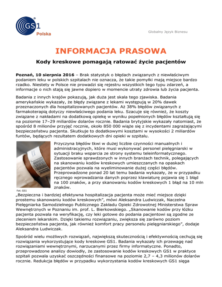 Globalny Język Biznesu INFORMACJA PRASOWA Kody kreskowe pomagają ratować życie pacjentów Poznań, 10 sierpnia 2016 – Brak statystyk o błędach związanych z niewłaściwym podaniem leku w polskich szpitalach nie oznacza, że takie pomyłki mają miejsce bardzo rzadko. Niestety w Polsce nie prowadzi się rejestru wszystkich tego typu zdarzeń, a informacje o nich stają się jawne dopiero w momencie utraty zdrowia lub życia pacjenta. Badania z innych krajów pokazują, jak duża jest skala tego zjawiska. Badania amerykańskie wykazały, że błędy związane z lekami występują w 20% dawek przeznaczonych dla hospitalizowanych pacjentów. Aż 38% błędów związanych z farmakoterapią dotyczy niewłaściwego podania leku. Szacuje się również, że koszty związane z nakładami na dodatkową opiekę w wyniku popełnionych błędów kształtują się na poziomie 17–29 miliardów dolarów rocznie. Badania brytyjskie wykazały natomiast, że spośród 8 milionów przyjęć rocznie, około 850 000 wiąże się z incydentami zagrażającymi bezpieczeństwu pacjenta. Skutkuje to dodatkowymi kosztami w wysokości 2 miliardów funtów, będących rezultatem dodatkowych dni opieki w szpitalu. Przyczyna błędów tkwi w dużej liczbie czynności manualnych i administracyjnych, które musi wykonywać personel pielęgniarski w sytuacji braku wsparcia ze strony systemu teleinformatycznego. Zastosowanie sprawdzonych w innych branżach technik, polegających na skanowaniu kodów kreskowych umieszczanych na opaskach pacjentów pozwala na wyeliminowanie dużej części błędów. Przeprowadzone ponad 20 lat temu badania wykazały, że w przypadku ręcznego wprowadzania danych poprzez klawiaturę pojawia się 1 błąd na 100 znaków, a przy skanowaniu kodów kreskowych 1 błąd na 10 mln znaków. Fot. GS1 „Bezpieczna i bardziej efektywna hospitalizacja pacjenta może mieć miejsce dzięki prostemu skanowaniu kodów kreskowych”, mówi Aleksandra Ludwiczak, Naczelna Pielęgniarka Samodzielnego Publicznego Zakładu Opieki Zdrowotnej Ministerstwa Spraw Wewnętrznych w Poznaniu im. prof. L. Bierkowskiego. „Skanowanie kodów przy łóżku pacjenta pozwala na weryfikację, czy leki gotowe do podania pacjentowi są zgodne ze zleceniem lekarskim. Dzięki takiemu rozwiązaniu, zwiększa się zarówno poziom bezpieczeństwa pacjenta, jak również komfort pracy personelu pielęgniarskiego”, dodaje Aleksandra Ludwiczak. Spośród wielu możliwych rozwiązań, największą skutecznością i efektywnością cechują się rozwiązania wykorzystujące kody kreskowe GS1. Badania wykazały ich przewagę nad rozwiązaniami wewnętrznymi, narzucanymi przez firmy informatyczne. Ponadto, przeprowadzone analizy dowiodły, że zastosowanie kodów kreskowych GS1 w praktyce szpitali pozwala uzyskać oszczędności finansowe na poziomie 2,7 – 4,3 milionów dolarów rocznie. Redukcja błędów w przypadku wykorzystania kodów kreskowych GS1 sięga natomiast 30%. W Polsce wdrażaniu takich rozwiązań sprzyja Ustawa o działalności leczniczej, która nakłada na szpitale obowiązek wprowadzenia kodowanych identyfikatorów dla pacjentów. Dodatkowo, wszystkie opakowania produktów leczniczych w Polsce są oznaczone kodami kreskowymi zgodnie z Ustawą prawo farmaceutyczne. Stwarza to fundament do wdrażania sprawdzonych w innych branżach metod automatyzacji i elektronizacji czynności w szpitalu, ukierunkowanych w tym wypadku na bezpieczną hospitalizację. Niestety w polskich szpitalach mamy cały czas bardzo mało wdrożeń rozwiązań bazujących na kodach kreskowych, które od kilkudziesięciu lat są efektywnie wykorzystywane w handlu i przemyśle. ### Kontakt: Anna Gawrońska-Błaszczyk Główny Specjalista – Ochrona zdrowia Instytut Logistyki i Magazynowania [email protected] Ilona Kużaj-Aydar PR Manager Instytut Logistyki i Magazynowania [email protected] GS1 Polska – Zarządza Systemem GS1 w Polsce. Jako jedyna upoważniona instytucja przyjmuje polskie firmy i instytucje do Systemu GS1 i nadaje im uprawnienia do stosowania kodów kreskowych GS1. Wspiera uczestników systemu w efektywnym wdrażaniu standardów GS1, stanowiących zbiór wielobranżowych rozwiązań i narzędzi identyfikacyjnych i komunikacyjnych. Opracowuje rozwiązania krajowe oraz bierze aktywny udział w rozwijaniu globalnych standardów i nowych zastosowań. Więcej informacji www.gs1pl.org Instytut Logistyki I Magazynowania - Realizuje prace badawczo-rozwojowe i usługi doradcze podnoszące efektywność funkcjonowania przedsiębiorstw i całych łańcuchów dostaw. Pełniąc przez 25 lat rolę organizacji krajowej GS1 wdrażał do praktyki gospodarczej globalne standardy GS1. W ramach projektów rządowych rozwija administrację elektroniczną w Polsce. Aktywnie działa w europejskiej przestrzeni badawczej będąc koordynatorem i partnerem projektów z zakresu ICT i logistyki. Więcej informacji www.ilim.poznan.pl 2