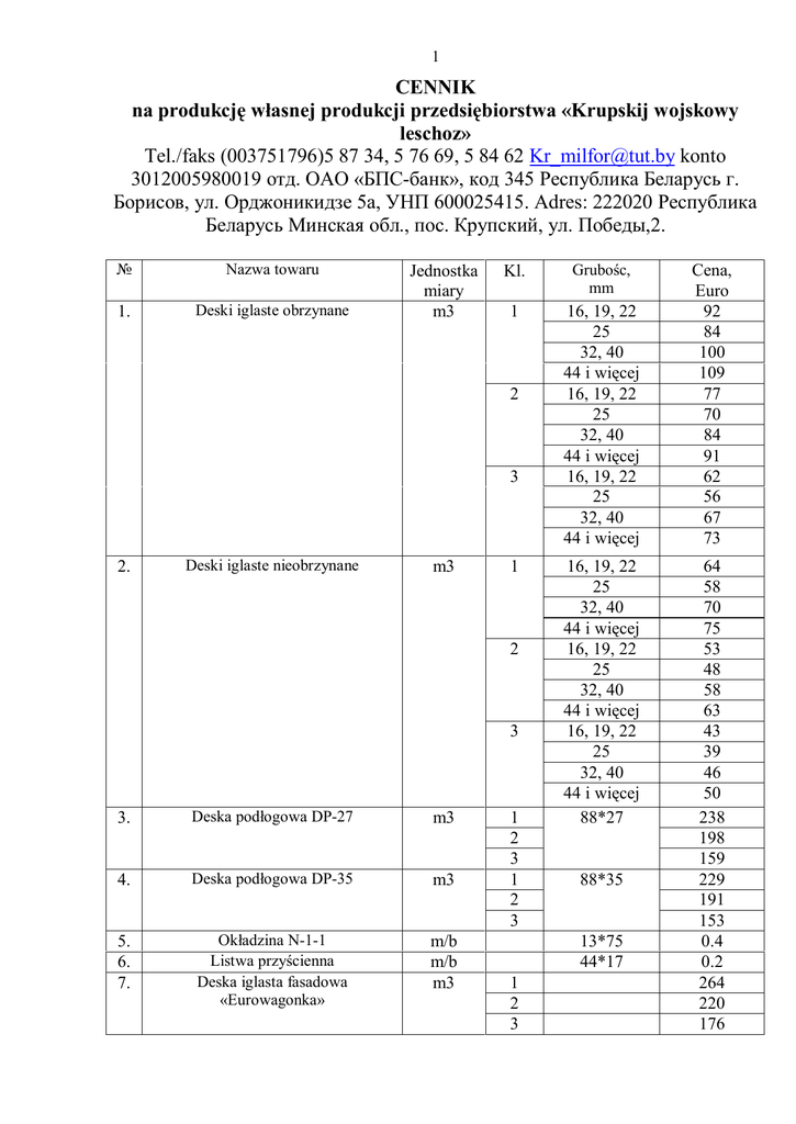 1 CENNIK na produkcję własnej produkcji przedsiębiorstwa «Krupskij wojskowy leschoz» Tel./faks (003751796)5 87 34, 5 76 69, 5 84 62 [email protected] konto 3012005980019 отд. ОАО «БПС-банк», код 345 Республика Беларусь г. Борисов, ул. Орджоникидзе 5а, УНП 600025415. Adres: 222020 Республика Беларусь Минская обл., пос. Крупский, ул. Победы,2. № Nazwa towaru 1. Deski iglaste obrzynane Jednostka miary m3 Kl. Grubośc, mm 1 16, 19, 22 25 32, 40 44 i więcej 16, 19, 22 25 32, 40 44 i więcej 16, 19, 22 25 32, 40 44 i więcej 2 3 2. Deski iglaste nieobrzynane m3 1 2 3 3. Deska podłogowa DP-27 m3 4. Deska podłogowa DP-35 m3 5. 6. 7. Okładzina N-1-1 Listwa przyścienna Deska iglasta fasadowa «Eurowagonka» m/b m/b m3 1 2 3 1 2 3 16, 19, 22 25 32, 40 44 i więcej 16, 19, 22 25 32, 40 44 i więcej 16, 19, 22 25 32, 40 44 i więcej 88*27 88*35 13*75 44*17 1 2 3 Cena, Euro 92 84 100 109 77 70 84 91 62 56 67 73 64 58 70 75 53 48 58 63 43 39 46 50 238 198 159 229 191 153 0.4 0.2 264 220 176 2 Deska iglasta fasadowa «Blok-Haus» m3 Deski tarasowe 9. Klejona strugana belka 10. 11. Klejona pokładowa deska podłogowa Okładzina klejona 12. Brykiety drzewne «Pinikiej» 13. 14. Dom z bierwion 15. Dom z belki 16. Dom z bierwion strugany 17. Dom z belki strugany Szczapa paliwowa 18. 19. Altana «Tieriemok», «Komfort» m3 m3 m3 m/b 8. m3 m3 m3 m3 m3 szt. 1 2 3 32*120 264 220 176 112 451 372 0.75 110 106 146 151 205 19 423 1 Ceny w magazynach na produkcję przedsiębiorstw «Krupskij wojskowy leschoz» i «Iwacewiczskij wojskowy leschoz» № Nazwa towaru 1. Belki iglaste Jednostka miary m3 2. Deski iglaste obrzynane m3 3. Deski iglaste obrzynane m3 4. 5. Belki dębowe obrzynane Deski dębowe obrzynane m3 m3 6. Deski dębowe obrzynane m3 7. 8. 9. Belki iglaste obrzynane m3 m3 m3 Belki iglaste obrzynane jednostronne Deski iglaste obrzynane Kl. 3 2 1 3 2 1 3 2 1 1 3 2 1 3 2 1 1 2 2 1 Grubośc, mm 50-100 19-25 28-45 19-28 30-45 50-100 50-100 28-45 Cena, USD 105 140 160 100 135 140 105 135 145 565 350 420 555 280 430 580 205 195 175 180 Comiesięczna objętość produkowanych na eksport desek iglastych obrzynanych – 150-200 m3 na każdym przedsiębiorstwie. W drugim półroczu 2009 r. każde przedsiębiorstwo jest w gotowości eksportować po 1000 m3 bilansu brzozowego (średnica 6-24 cm) po 25 Euro i po 1000 m3 bilansu iglastego (średnica 624 cm) po 30 Euro z załadowaniem do wagonu na stacji odjazdu. Telefony kontaktowe: 1. «Krupskij wojskowy leschoz»: Inżynier główny Dmitrij Drangowskij tel. 00375164523480 faks 00375164523545 kom. 00375296437582 2. «Iwacewiczskij wojskowy leschoz» Kierownik Leonid Łazuk tel. 00375179658462 faks 00375179658734 kom. 00375296189773