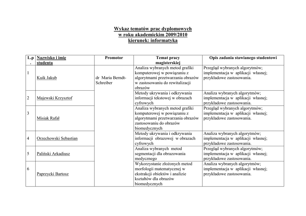 Wykaz tematów prac dyplomowych w roku akademickim 2009/2010