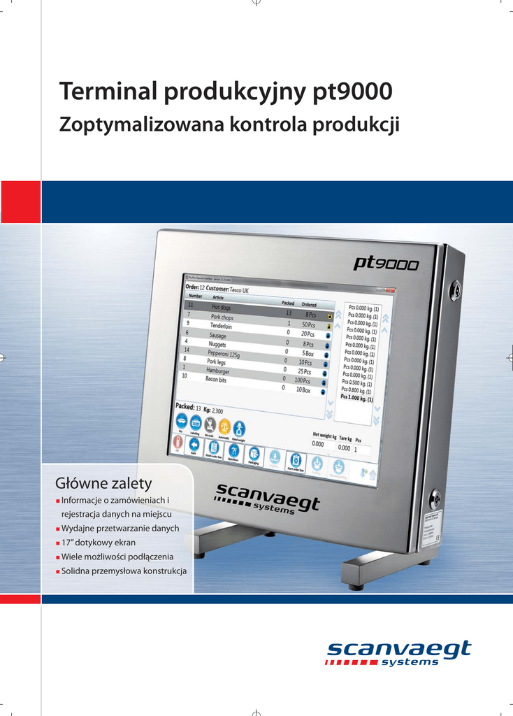 Terminal produkcyjny pt9000 Zoptymalizowana kontrola produkcji Główne zalety n Informacje o zamówieniach i rejestracja danych na miejscu n Wydajne przetwarzanie danych n 17” dotykowy n Wiele ekran możliwości podłączenia n Solidna przemysłowa konstrukcja Elastyczność i prosta obsługa Wydajny i wszechstronny komputer przemysłowy Terminal produkcyjny pt9000 firmy Scanvaegt to wydajny, wszechstronny komputer przemysłowy z 17” ekranem dotykowym i dyskiem twardym SSD. pt9000 charakteryzuje się przyjazną dla użytkownika, funkcjonalną formą. Duży ekran dotykowy zapewnia prostą obsługę sprzętu. Terminal można także wyposażyć w zewnętrzną klawiaturę pt9000 działa pod kontrolą systemu Windows 7 Embedded Std. Ma wiele zastosowań. Realizuje takie zadania, jak zar ządzanie produkcją, wysyłka, gromadzenie danych czy monitorowane. stawianą niżej na osobnej półce. Dostępny jest również przechylny wspornik do montażu na ścianie. Wymiary Dzięki wyposażeniu w szybki procesor, 4 GB RAM, 120 GB dysk twardy SSD, wiele typów wejść/wyjść, w tym LAN, USB i RS232, pt9000 jest wydajnym i wszechstronnym terminalem. 450 125 Terminal został zaprojektowany specjalnie do zastosowań przemysłowych. Jest wyposażony w wodoszczelną obudowę ze stali nierdzewnej o stopniu ochrony IP65. Może pracować we wszystkich środowiskach przemysłowych, dobrze znosi gruntowne czyszczenie. Multi cable input 6 M 100 420 4x 100 Dane techniczne System Procesor Intel Gen4 Celeron 2980U Pamięć 4 Gb DDR3-1600 SO-DIMM Chipset Nie dot. Grafika Intel HD Graphics Chipset LAN 2 × Intel i210-AT Gigabit Ethernet Układy Złącza szeregowe 4 × RS232 / system łatwego podłączania wejść/wyjść Złącza USB 2 × USB 2.0 i 2 × USB 3.0 LAN 2 × RJ45 do GbE Złącza GPIO 4 cyfrowe przekaźniki wejścia i 4 cyfrowe przekaźniki wyjścia 5 V / 12 V / 24 V Typ Dysk 120Gb SATA SSD ML Cechy fizyczne i Obudowa Stal nierdzewna środowisko Wymiary Wys. × szer. × dł.: 420 × 450 × 125 mm Masa 18 kg Stopień ochrony IP65 Temp. środ. rob. -20 ~+30 °C Temp. przechowywania -40 ~+65 °C Dotykowy Wyświetlacz 17” moduł TFT LCD wyświetlacz Rozdzielczość SXGA (1280 × 1024) Kontrast 800:1 (czytelny w słońcu) Ekran dotykowy 17”, rezystancyjny Napięcie 100-240 VAC, 50/60 Hz Zużycie 72 W Zasilacz Scanvaegt Systems Sp. z o.o. l ul. Chorwacka 10 l PL-70-841 Szczecin l Polska l [email protected] Z zastrzeżeniem możliwości zmian v5/2016.04 Zasilanie wyświetlacza Pamięć l www.scanvaegt.pl l Tel. +48 8814 20574