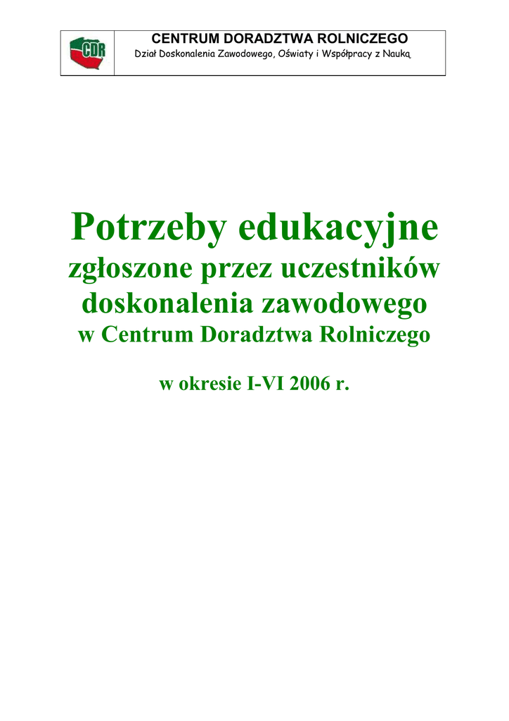 CENTRUM DORADZTWA ROLNICZEGO Dział Doskonalenia Zawodowego, Oświaty i Współpracy z Nauką Potrzeby edukacyjne zgłoszone przez uczestników doskonalenia zawodowego w Centrum Doradztwa Rolniczego w okresie I-VI 2006 r. CENTRUM DORADZTWA ROLNICZEGO Dział Doskonalenia Zawodowego, Oświaty i Współpracy z Nauką mgr inŜ. Maria Majewska DIAGNOZOWANIE POTRZEB EDUKACYJNYCH KLIENTÓW CENTRUM DORADZTWA ROLNICZEGO W Dziale Doskonalenia Zawodowego, Oświaty i Współpracy z Nauką CDR realizowane są następujące zadania w zakresie doskonalenia zawodowego, wynikające z ustawy o jednostkach doradztwa rolniczego i określone w regulaminie organizacyjnym: • organizacja i koordynacja doskonalenia zawodowego: – kadr doradczych jednostek doradztwa rolniczego, – nauczycieli szkół rolniczych w zakresie określonym w ustawie; • analiza potrzeb edukacyjnych kadr doradczych oraz nauczycieli szkół rolniczych; • przygotowywanie jednolitych zasad konstruowania programów doskonalenia zawodowego i dokumentowania prowadzonych form doskonalenia zawodowego oraz upowszechnianie ich w jednostkach doradczych, a takŜe formalna ocena programów szkoleń; • współudział w przygotowaniu i realizacji projektów przedsięwzięć wspierających rozwój zawodowy kadry doradczej oraz nauczycieli szkół rolniczych w zakresie zrównowaŜonego rozwoju obszarów wiejskich; • opracowywanie i rozpowszechnianie informacji wspierających rozwój zawodowy pracowników doradztwa rolniczego. Badanie potrzeb edukacyjnych klientów zewnętrznych CDR realizowane jest od 2006 roku w kształcie, który jest opisany w PROCEDURZE P-06 ZARZĄDZANIE USŁUGAMI EDUKACYJNYMI. Diagnozowane są potrzeby następujących grup klientów: pracownicy wojewódzkich ośrodków doradztwa rolniczego, nauczyciele szkół prowadzących kształcenie w zawodach sektora rolno-Ŝywnościowego. W badaniach stosowany jest jednolity kwestionariusz ankiety dla uczestników usług edukacyjnych, który daje moŜliwość określenia zakresów tematycznych oraz wyboru formy ich realizacji. Celem badań jest zebranie danych, dotyczących potrzeb podstawowych grup klientów zewnętrznych CDR, słuŜących do planowania pracy w komórkach organizacyjnych CDR i dostosowania oferty edukacyjnej CDR do potrzeb klientów. Zakładane korzyści wynikające z realizacji badań diagnostycznych są następujące: 2 CENTRUM DORADZTWA ROLNICZEGO Dział Doskonalenia Zawodowego, Oświaty i Współpracy z Nauką Skoordynowanie prac prowadzonych w CDR związanych z diagnozowaniem potrzeb klientów zewnętrznych. Dostęp wszystkich pracowników CDR do szczegółowych danych dotyczących potrzeb poszczególnych grup klientów. Diagnozowanie potrzeb klientów zewnętrznych CODN zgodnie z przyjętą procedurą, w sposób systemowy. Wykorzystanie zdobytych materiałów do przygotowania jednolitego systemu doskonalenia zawodowego pracowników jednostek doradztwa rolniczego. UmoŜliwienie, poprzez umieszczenie w Internecie– na stronie Działu DZOiWzN, wykorzystania informacji o potrzebach edukacyjnych takŜe przez innych organizatorów doskonalenia zawodowego doradców rolniczych i nauczycieli szkół rolniczych. Badania diagnostyczne potrzeb są przeprowadzane po zakończeniu kaŜdej formy edukacyjnej, a analizy wyników – w odstępach półrocznych. Materiały źródłowe są dostępne w działach, które były organizatorami poszczególnych form. Zestawienia potrzeb uczestników form edukacyjnych przedstawiane są dyrekcji CDR oraz kierownikom komórek organizacyjnych CDR, a takŜe umieszczane w Internecie. Informacja o formach edukacyjnych przeprowadzonych w I-VI 2006 r. Rodzaj formy edukacyjnej L.p. Liczba form edukacyjnych 4 Liczba uczestników 1. Kurs 2. Seminarium 13 550 3. Szkolenie 2 105 4. Warsztaty 1 20 20 950 Razem 275 Większość organizowanych form edukacyjnych (85%) była skierowana do pracowników ośrodków doradztwa rolniczego. Nauczyciele szkół sektora rolno- Ŝywnościowego stanowili mniej niŜ 8% uczestników. Szczegółowe analizy wyników badań diagnostycznych sporządzone w Dziale Doskonalenia Zawodowego, Oświaty i Współpracy z Nauką CDR w Brwinowie przedstawiono poniŜej. 3 CENTRUM DORADZTWA ROLNICZEGO Dział Doskonalenia Zawodowego, Oświaty i Współpracy z Nauką mgr inŜ. Jolanta Borczyńska-śbikowska POTRZEBY EDUKACYJNE PRACOWNIKÓW JEDNOSTEK DORADZTWA ROLNICZEGO Wyniki badań ankietowych przeprowadzonych po zakończeniu form edukacyjnych organizowanych przez Centrum Doradztwa Rolniczego w Brwinowie oraz Oddziały w Krakowie, Poznaniu i Radomiu dla pracowników jednostek doradztwa rolniczego w okresie I. – VI. 2006r. Tabela 1 Przeprowadzone formy edukacyjne L.p. Rodzaj formy Liczba form edukacyjnej edukacyjnych Liczba uczestników 5. Kurs 3 249 6. Seminarium 11 501 7. Szkolenie 2 105 8. Warsztaty 1 20 17 875 Razem Tabela 2 Szczegółowe zestawienie przeprowadzonych form edukacyjnych Lp. 1. 2. 3. 4. Rodzaj i nazwa formy edukacyjnej Seminarium „Energetyczne wykorzystanie biomasy oraz biopaliw” Szkolenie doradców: „Program rolnośrodowiskowy – Seminarium „Promocja i ochrona produktów regionalnych i tradycyjnych” Kurs – II Edycja WdraŜanie systemu HACCP w zakładach sektora Ŝywnościowego na obszarach wiejskich 6-7.03. 27-28.03. Liczba uczestników 43 41 31.01- 1.02. 62 CDR w Brwinowie 30-31. 03 72 CDR w Brwinowie 9-11.01. 30 CDR O/Kraków Termin Organizator CDR w Brwinowie 4 CENTRUM DORADZTWA ROLNICZEGO Dział Doskonalenia Zawodowego, Oświaty i Współpracy z Nauką Lp. 5. 6. 7. 8. 9. 10. 11. 12. 13. Rodzaj i nazwa formy edukacyjnej Kurs intranetowy samokształcenie kierowane Edycja IV „Leaderatorium – platforma intranetowa” Warsztaty „Dopłaty bezpośrednie, ONW – wykorzystanie GPS” Seminarium „Metoda LEADER – nowe wyzwania dla doradców w okresie planowania 2007 2013” Kurs intranetowy samokształcenie kierowane Edycja V Leaderatorium „Leaderatorium – platforma intranetowa” Seminarium