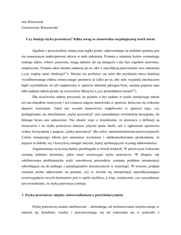 Jan Winczorek Uniwersytet Warszawski Czy istnieje etyka prawnicza? Kilka uwag ze stanowiska socjologicznej teorii norm Zgodnie z powszechnie znaną tezą logiki pytań, odpowiadając na niektóre pytania jest się zmuszonym zaakceptować ukryte w nich założenia. Pytania o istnienie bytów rozmaitego rodzaju także, wbrew pozorom, mogą należeć do tej kategorii i nie być zupełnie niewinne, empiryczne. Pytania takie można zadawać po to, aby z satysfakcją potwierdzić owe założenia („czy rządzą nami złodzieje?”). Można też posłużyć się nimi dla uzyskania nieco bardziej wyrafinowanego efektu retorycznego: postawić je tylko po to, aby móc wyjaśnić słuchaczom bądź czytelnikom, że ich wątpliwości w sprawie istnienia jakiegoś bytu, zasiane poprzez sam fakt zadania takich pytań, są oczywiście fałszywe („czy postradałem rozum?”). Dla uczciwości należy przyznać, że pytanie o byt zadane w tytule niniejszego tekstu też ma charakter retoryczny i też oznacza zajęcie stanowiska w sprawie, którą ma się rzekomo dopiero roztrząsać. Tekst ten wyraża mianowicie wątpliwości w sprawie tego, czy posługiwanie się określeniem „etyka prawnicza” jest uzasadnione swoistością desygnatu, do którego bywa ono odnoszone. Nie chodzi więc o twierdzenie, że prawnicy z definicji są nieuczciwi i że etyka prawnicza stanowi jedynie puste hasło, ani o zgłoszenie sprzeciwu wobec korzystania z pojęcia „etyka prawnicza” dla celów mnemotechniczno-perswazyjnych. Celem niniejszego tekstu jest natomiast wyrażenie i udokumentowanie przekonania, że pojęcie to dałoby się z korzyścią zastąpić innymi, lepiej spełniającymi wymóg adekwatności. Argumentacja za tą tezą będzie przebiegała w trzech krokach. W pierwszym wskazane zostaną niektóre dylematy, jakie musi rozstrzygać etyka prawnicza. W drugim, tak zdefiniowana problematyka etyki zawodowej prawników zostanie poddana interpretacji odwołującej się do jednego z paradygmatów teoretycznych w socjologii. W trzecim, podjęta zostanie próba odpowiedzi na pytanie, czy w świetle tej interpretacji satysfakcjonujące rozstrzygnięcie owych dylematów jest w ogóle możliwe, a więc, ostatecznie, czy uzasadnione jest twierdzenie, że etyka prawnicza istnieje. 1. Etyka prawnicza: między uniwersalizmem a partykularyzmem Etykę prawniczą można zdefiniować – abstrahując od zróżnicowania teoretycznego w ramach tej dziedziny wiedzy i powstrzymując się od wdawania się w polemiki z którymkolwiek z twórców oryginalnych koncepcji w tej sferze – jako obszar szczególnej refleksji, służącej artykułowaniu wzorców właściwego postępowania przez osoby pełniące zawody prawnicze. Można też sądzić, że realizując to zadanie, etyka prawnicza musi czynić zadość konkurującym ze sobą roszczeniom i wymaganiom . Nie ulega przecież wątpliwości, 1 że etyka prawnicza jest powiązana z ogólniejszą refleksją etyczną nad moralnością i niejako przejmuje jej rozmaite własności czy ograniczenia. Jako taka posiada też – wypływające z różnych źródeł i artykułowane na różne sposoby – roszczenie do uniwersalności. Z drugiej strony, etyka prawnicza opiera się na przekonaniu, że możliwe jest rozstrzyganie partykularnych problemów prawników lub ocenianie partykularnych rozstrzygnięć partykularnych problemów, dokonywanych przez prawników. Ta służebna rola etyki prawniczej i jej niejako następczy charakter wobec zagadnień rodzących się w praktyce (charakterystyczna zresztą dla każdej etyki stosowanej), stanowi istotne ograniczenie możliwości implementacji dorobku etyki ogólnej dla celów prawniczej deontologii zawodowej. Ujmując rzecz nieco mniej abstrakcyjnie, potrzebę uzgodnienia roszczenia do uniwersalności oraz konieczności zajmowania się ściśle określonymi zagadnieniami daje się dostrzec na przynajmniej czterech względnie niezależnych planach. Pierwszy z nich dotyczy zakresu twierdzeń formułowanych w ramach etyki prawniczej i, w konsekwencji, ich swoistości. Występuje w niej mianowicie napięcie między uniwersalnością zasad etycznych a specyficznymi problemami zawodowymi prawników, rzekomo występującymi tylko w ramach tego zawodu. Etyka prawnicza zawiera jednocześnie roszczenie do posługiwania się rozumowaniami etycznymi o wysokim poziomie abstrakcji i szerokim zakresie stosowalności, a z drugiej strony, do rozstrzygania specyficznych etycznych problemów prawników, które, rzekomo, nie występują poza praktyką tego zawodu. W skrajnych interpretacjach, może to prowadzić do wniosku, że etyka prawnicza jest jedynie podzbiorem ogólniejszej etyki, formułującej zalecenia w sprawie właściwego postępowania ludzi i dostarczającej podstaw do jego oceny za sprawą abstrakcyjnych i generalnych teorii, albo przeciwnie, do przekonania, że problemy te są na tyle specyficzne, że dają się rozwiązać jedynie przy odwołaniu do specyficznych, czysto technicznych reguł deontologii zawodowej, a więc nie są uniwersalnie „etyczne”. Prowadzi to do oczywistej wątpliwości w sprawie adekwatności określenia „etyka prawnicza”. Na ile „etyka prawnicza” jest „prawnicza” i na ile jest „etyką”? Jeśli prawnikom stawia się (posługując się różnymi pojęciami) wymóg szczególnego zainteresowania 1 P. Skuczyński, Status etyki prawniczej, Warszawa 2010, s. 142 i n. interesami klienta czy podsądnego – a więc akcentuje się specyficzną więź między stronami relacji prawnych – to mutatis mutandis można to samo powiedzieć o każdym innym zawodzie. Zawody te będzie od zawodów prawniczych różnił jedynie zakres i treść tego obowiązku, a nie sam fakt jego istnienia. W przypadku takich profesji jak prawnicze, zawodu lekarza czy rozmaitego rodzaju doradców, zakres i treść będą nieco szersze i słabiej dookreślone. W przypadku zaś innych zawodów, zazwyczaj, węższe, ale o bardziej precyzyj