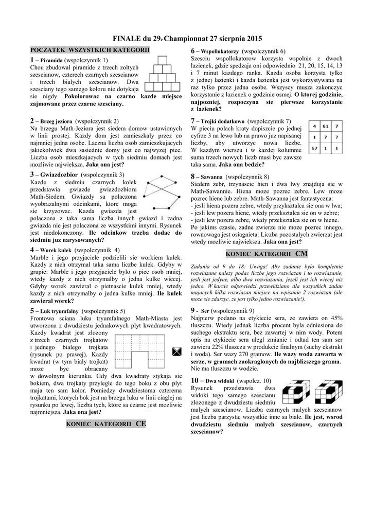 FINALE du 29e Championnat 27 sierpnia 2015 POCZATEK WSZYSTKICH KATEGORII 6 – Wspollokatorzy (wspolczynnik 6) 1 – Piramida (wspolczynnik 1) Chou zbudowal piramide z trzech zoltych szescianow, czterech czarnych szescianow i trzech bialych szescianow. Dwa szesciany tego samego koloru nie dotykaja sie nigdy. Pokolorowac na czarno kazde miejsce zajmowane przez czarne szesciany. Szesciu wspollokatorow korzysta wspolnie z dwoch lazienek, gdzie spedzaja oni odpowiednio 21, 20, 15, 14, 13 i 7 minut kazdego ranka. Kazda osoba korzysta tylko z jednej lazienki i kazda lazienka jest wykorzystywana na raz tylko przez jedna osobe. Wszyscy musza zakonczyc korzystanie z lazienek o godzinie osmej. O ktorej godzinie, najpozniej, rozpoczyna sie pierwsze korzystanie z lazienek? 2 – Brzeg jeziora (wspolczynnik 2) 7 – Trojki dodatkowo (wspolczynnik 7) Na brzegu Math-Jeziora jest siedem domow ustawionych w linii prostej. Kazdy dom jest zamieszkaly przez co najmniej jedna osobe. Laczna liczba osob zamieszkujacych jakiekolwiek dwa sasiednie domy jest co najwyzej piec. Liczba osob mieszkajacych w tych siedmiu domach jest mozliwie najwieksza. Jaka ona jest? W pieciu polach kraty dopiszcie po jednej cyfrze 3 na lewo lub na prawo juz napisanej liczby, aby utworzyc nowa liczbe. W kazdym wierszu i w kazdej kolumnie suma trzech nowych liczb musi byc zawsze taka sama. Jaka ona bedzie? 3 – Gwiazdozbior (wspolczynnik 3) 8 – Sawanna (wspolczynnik 8) Kazde z siedmiu czarnych kolek przedstawia gwiazde gwiazdozbioru Math-Siedem. Gwiazdy sa polaczona wyobrazalnymi odcinkami, ktore moga sie krzyzowac. Kazda gwiazda jest polaczona z taka sama liczba innych gwiazd i zadna gwiazda nie jest polaczona ze wszystkimi innymi. Rysunek jest niedokonczony. Ile odcinkow trzeba dodac do siedmiu juz narysowanych? Siedem zebr, trzynascie hien i dwa lwy znajduja sie w Math-Sawannie. Hiena moze pozrec zebre. Lew moze pozrec hiene lub zebre. Math-Sawanna jest fantastyczna: - jesli hiena pozera zebre, wtedy przyksztalca sie ona w lwa; - jesli lew pozera hiene, wtedy przeksztalca sie on w zebre; - jesli lew pozera zebre, wtedy przeksztalca sie on w hiene. Po jakims czasie, zadne zwierze nie moze pozrec innego, rownowaga jest osiagnieta. Liczba pozostalych zwierzat jest wtedy mozliwie najwieksza. Jaka ona jest? 4 – Worek kulek (wspolczynnik 4) KONIEC KATEGORII CM Marble i jego przyjaciele podzielili sie workiem kulek. Kazdy z nich otrzymal taka sama liczbe kulek. Gdyby w grupie: Marble i jego przyjaciele bylo o piec osob mniej, wtedy kazdy z nich otrzymalby o jedna kulke wiecej. Gdyby worek zawieral o pietnascie kulek mniej, wtedy kazdy z nich otrzymalby o jedna kulke mniej. Ile kulek zawieral worek? Zadania od 9 do 18: Uwaga! Aby zadanie bylo kompletnie rozwiazane nalezy podac liczbe jego rozwiazan i to rozwiazanie, jesli jest jedyne, albo dwa rozwiazania, jezeli jest ich wiecej niz jedno. W karcie odpowiedzi przewidziano dla wszystkich zadan majacych kilka rozwiazan miejsce na wpisanie 2 rozwiazan (ale moze sie zdarzyc, ze jest tylko jedno rozwiazanie!). 5 – Luk tryumfalny (wspolczynnik 5) 9- Frontowa sciana luku tryumfalnego Math-Miasta jest utworzona z dwudziestu jednakowych plyt kwadratowych. Kazdy kwadrat jest zlozony z trzech czarnych trojkatow i jednego bialego trojkata (rysunek po prawej). Kazdy kwadrat (w tym bialy trojkat) moze byc obracany w dowolnym kierunku. Gdy dwa kwadraty stykaja sie bokiem, dwa trojkaty przylegle do tego boku z obu plyt maja ten sam kolor. Pomiedzy dwudziestoma czterema trojkatami, ktorych bok jest na brzegu luku w linii ciaglej na rysunku po lewej, liczba tych, ktore sa czarne jest mozliwie najmniejsza. Jaka ona jest? KONIEC KATEGORII CE Ser (wspolczynnik 9) Najpierw podano na etykiecie sera, ze zawiera on 45% tluszczu. Wtedy jednak liczba procent byla odniesiona do suchego ekstraktu sera, bez zawartej w nim wody. Potem opis na etykiecie sera ulegl zmianie i odtad ten sam ser zawiera 22% tluszczu w produkcie finalnym (suchy ekstrakt i woda). Ser wazy 270 gramow. Ile wazy woda zawarta w serze, w gramach zaokraglonych do najblizszego grama. Nie ma tluszczu w wodzie. 10 – Dwa widoki (wspolcz. 10) Rysunek przedstawia dwa widoki tego samego szescianu zlozonego z dwudziestu siedmiu malych szescianow. Liczba czarnych malych szescianow jest liczba parzysta; wszystkie inne sa biale. Ile jest, wsrod dwudziestu siedmiu malych szescianow, czarnych szescianow? 15 – Podzial 29 Championnatu (wspolczynnik 16) 11 – Orzeszki (wspolczynnik 11) Piec wiewiorek zgromadzilo lacznie 100 orzeszkow. Kazda z nich zarzadza jednym schowkiem umieszczonym na innym drzewie. Poniewaz orzeszki moga ulec zawilgoceniu, wiewiorki maja strategie, aby je wietrzyc. Na poczatku kazda wiewiorka zabiera wszystkie orzeszki ze schowka, ktorym zarzadza. Nastepnie albo kladzie wszystkie swoje orzeszki w jednym innym schowku albo rozdziela je w sprawiedliwy sposob (w tej samej liczbie) do wielu innych schowkow. Strzalki na rysunku przedstawiaja wszystkie przeniesienia orzeszkow z jednego do innego schowka. Zadna wiewiorka nic nie robi (nie manipuluje) z orzeszkami zlozonymi w jej schowku. W koncu liczba orzeszkow w kazdym schowku jest taka sama jak na poczatku. Jaka jest ta na dole, po lewej, na rysunku? KONIEC KATEGORII C1 12 – Odgadnij liczbe (wspolcz. 13) Magiczna operacja na liczbie, nie konczacej sie cyfra 0 polega na dodaniu do niej liczby z nia symetrycznej w odczycie, tzn. liczby otrzymanej po przeczytaniu liczby wyjsciowej od prawej do lewej. Na przyklad operacja magiczna na liczbie 2015 dalaby liczbe 7117. Wybieracie pierwsza liczbe. Wykonujecie magiczna operacje na tej pierwszej liczbie i otrzymujecie druga liczbe, potem magiczna operacje na tej drugiej liczbie i otrzymujecie trzecia liczbe i tak dalej. Szosta liczba, ktora otrzymacie jest 17347. Jaka byla pierwsza liczba, ktora wybraliscie? 13 – Tort (wspolczynnik 12) Tort, widziany z gory, jest kolem o promieniu 13 centymetrow. Albert kroi go na cztery czesci wzdluz dwoch 