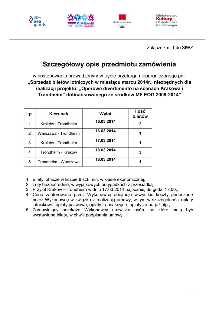 Załącznik nr 1 do SIWZ Szczegółowy opis przedmiotu zamówienia w postępowaniu prowadzonym w trybie przetargu nieograniczonego pn.: „Sprzedaż biletów lotniczych w miesiącu marcu 2014r., niezbędnych dla realizacji projektu: „Operowe divertimento na scenach Krakowa i Trondheim” dofinansowanego ze środków MF EOG 2009-2014” Lp. Kierunek 1 Kraków - Trondheim 2 Warszawa - Trondheim 3 Kraków - Trondheim 4 Trondheim - Kraków 5 Trondheim - Warszawa Wylot 16.03.2014 16.03.2014 17.03.2014 18.03.2014 18.03.2014 Ilość biletów 2 1 1 3 1 1. 2. 3. 4. Bilety lotnicze w liczbie 8 szt. min. w klasie ekonomicznej, Loty bezpośrednie, w wyjątkowych przypadkach z przesiadką, Przylot Kraków –Trondheim w dniu 17.03.2014 najpóźniej do godz. 17.00., Cena zaoferowana przez Wykonawcę obejmuje wszystkie koszty ponoszone przez Wykonawcę w związku z realizacją umowy, w tym w szczególności opłaty lotniskowe, opłaty paliwowe, opłaty transakcyjne, opłaty za bagaż, itp., 5. Zamawiający przekaże Wykonawcy nazwiska osób, na które mają być wystawione bilety, w chwili podpisania umowy. 1