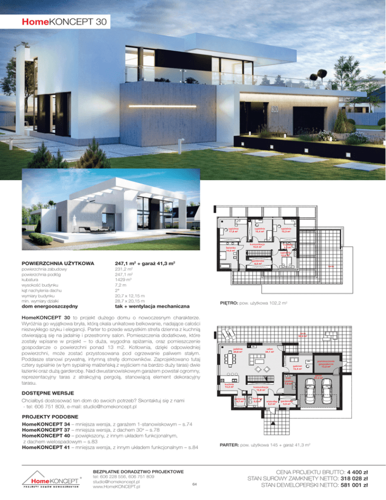 HomeKONCEPT 30 sypialnia 17,8 m² łazienka 14,0 m² POWIERZCHNIA UŻYTKOWA sypialnia 15,3 m² komunikacja 15,6 m² łazienka 3,3 m² sypialnia 12,8 m² garderoba 8,0 m² 247,1 m2 + garaż 41,3 m2 powierzchnia zabudowy 231,2 m2 powierzchnia podłóg 247,1 m2 kubatura1429 m3 wysokość budynku 7,2 m kąt nachylenia dachu 2° wymiary budynku 20,7 x 12,15 m min. wymiary działki 28,7 x 20,15 m dom energooszczędny sypialnia 15,4 m² taras PIĘTRO: pow. użytkowa 102,2 m2 tak + wentylacja mechaniczna HomeKONCEPT 30 to projekt dużego domu o nowoczesnym charakterze. Wyróżnia go wyjątkowa bryła, którą okala unikatowe belkowanie, nadające całości niezwykłego szyku i elegancji. Parter to przede wszystkim strefa dzienna z kuchnią otwierającą się na jadalnię i przestronny salon. Pomieszczenia dodatkowe, które zostały wpisane w projekt – to duża, wygodna spiżarnia, oraz pomieszczenie gospodarcze o powierzchni ponad 13 m2. Kotłownia, dzięki odpowiedniej powierzchni, może zostać przystosowana pod ogrzewanie paliwem stałym. Poddasze stanowi prywatną, intymną strefę domowników. Zaprojektowano tutaj cztery sypialnie (w tym sypialnię małżeńską z wyjściem na bardzo duży taras) dwie łazienki oraz dużą garderobę. Nad dwustanowiskowym garażem powstał ogromny, reprezentacyjny taras z atrakcyjną pergolą, stanowiącą element dekoracyjny tarasu. taras 90,6 m² gabinet 15,4 m² kuchnia 14,2 m² komunikacja 15,8 m² DOSTĘPNE WERSJE spiżarnia 4,7 m² Chciałbyś dostosować ten dom do swoich potrzeb? Skontaktuj się z nami - tel: 606 751 809, e-mail: [email protected] salon 34,1 m² jadalnia 23,6 m² łazienka 6,0 m² wiatrołap 5,2 m² kotł. +pralnia 7,0 m² pomieszczenie gospodarcze 13,2 m² garaż 41,3 m² garderoba 5,9 m² PROJEKTY PODOBNE HomeKONCEPT 34 – mniejsza wersja, z garażem 1-stanowiskowym – s.74 HomeKONCEPT 37 – mniejsza wersja, z dachem 30° – s.78 HomeKONCEPT 40 – powiększony, z innym układem funkcjonalnym, z dachem wielospadowym – s.83 HomeKONCEPT 41 – mniejsza wersja, z innym układem funkcjonalnym – s.84 ® BEZPŁATNE DORADZTWO PROJEKTOWE tel: 606 228 556, 606 751 809 [email protected] www.HomeKONCEPT.pl 64 PARTER: pow. użytkowa 145 + garaż 41,3 m2 CENA PROJEKTU BRUTTO: 4 400 zł STAN SUROWY ZAMKNIĘTY NETTO: 318 028 zł STAN DEWELOPERSKI NETTO: 581 001 zł