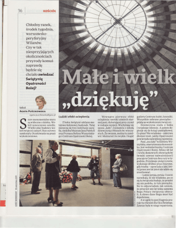 36 l Kośclót Chłodnyranek, środektygodnia, warszawsko- peryferyjny Wilanów. Czy w tak niesprzyjających okolicznościach przyrodykomuś naprawdę będziesię chciałozwiedzać świątynię opatrzności Bożej? Acnrn Puśclxowsxn [email protected] zaremonumentalne mury z daleka. Wosąwidoczne kółnowoczesne osiedle' Wielki placbudowywokółświątyni zamarł. Stansurowy zamknięty. oczekiwanie naprace wvkończeniowe. N z kuł s @ 'z B -o Ez EV -s -0 -C' N kubki,koszulki. Centrum: Wewnątrzpierwszy efekt gadżety ocieplenia: szerokiuśmiech star. Wszystkiezebranepieniądzeprzyczymś pójdąnawykończenie świątyni. Z bokuświątyni szk]ano-me.szejpani,dyżurującej Dziewczynasiada z boku Wychylając się talowo-betonowy budynek.fu taj wrodzajurecepcji. rozmawiaz młodą i wypisujeintencje.A potemdomieszczą siętrzyinstfiucje:para- spoza,,lady'', wieczy. pisujesiędoksięgipamiątkowej. fia,siedzibaMuzeumJanaPawła II dziewczyną o Mszachśw. można tu zamó. Copisze?Niewiadomo- zakrywa orazPr}rmasa Stefana Wyszyńskie- stych.Zeowszem, jakbyopatrzności goi Centrumopatrzności kupić dłońmitreść' Bożej. wić.Możnateżite zwykłe.I powierzała największą tajemnicę. Wy. Pani,,zza lady''toElżbieta emerytowana ekonomist. szyńska, Centrum ka.Jestwolontariuszką Bożej. Mimo ó8lat opatrzności i wielu domowychobowiązków (wnukizawszenajważniejsze! pracujew Centrumdwarazyw tygodniu.Przyjmujepielgrzymów, wykonujedrobnepracebiurowe, gdytrzeba- opowiada o idei,któjakoś nieudało się rejprzezzoo|at zrealizować. _ Ludziepytają, pytają. Czasem po co narzekają, żeniewiadomo, żeprojekt siętaświątyniabuduje, sięnie podoba,żetylepieniędzy. jak umiem, No to odpowiadam, zeprzeciezzoolattemusamemu obieca. Bogu Polacy świątynię ]i. A słowodaneBogumusibyć dopełnione. AwogóletopaniEugeniapra. cujetu równieżdlaOjcaSwiętego. Zawszebyław niegowpatrzona. Ludzki efekt ocieplenia sozil xośclót śwl4rvru|A oPATRzNoŚcl 37 tu wielcyPolacy,i żetak bardzo nosząiez całejPolskizvtyczajni chciałby zasłużyć natomiejsce..' Kowalscy'Czasemopowiadają Przy relikwiach bł. Jana ichhistorie,innymrazempoproPawłaII Mateuszdo dziadka:- stu je zostawiają,i wychodzą tak Powinni tu przyjść wszyscyci, z niewielkiegopokojujakoś dopieronakorytaktórzy nie czująsiędumni,żesą szybko..:źeby rzu wytrzećwilgotneoczy' Polakami... Monika Słęcka,archiwist. Konieczwiedzania. Wybijakolejnagodzina.PrzedPanteonem ka muzeum,zbierawszystkie znówkilkaosób.W ciągukażdego te skarby,dlawielujakrodzinne za. dniaprzyjeżdża tu odkilkudzie- relikwie.Każdypieczołowicie i opisuje. sięciudokilkusetpielgrzymów. bezpiecza - NawetnajmniejszyekspoPamiątki z serca Dwarazy nawetbyław Watyka- onieWielkichPolaków. Sylwia Kabala Choćwiększość natmawartość... nie. Raz,gdyJanPawełII prze- Właśnie: turystów czy wkopule I znówbudynekCen. z nich _ niematerialną- mówi, chodziłmiędzypielgrzymami, pielgrzymów7Dziadek świątyni: Bożej. pokazującniepozornyznaczek trum opatrzności jednympalcemchciaładotknąć z wnukiem odpowia- -Tomiejsce ofiarodawczyni Tlm razemwolontariusz-,,Solidarności''' iert ludziom jegosutanny.Takjak siędotyka dająchórem:-Ijedno, kaHannaMigda-Pawlak,miałaznaczekprzypięty'gdy potrzebne prowadzinataras,z któ- udałasięna audiencjędo Jana świętych: z nieśmiałością i wiarą. i drugie!ChcemypoznaćZ LEWE'! Papieżstałwtedytyłem,wokół współczesn4Warsza- Co gotlzinę widaćcałą Pawła.Papieżdotknąłznaczka regoświetnie sięcodzien. tłumyludzi. Pani Hanna, i powiedział,,Modlę wę, ale chcemyteżsię Panteon świątynię. - Nie wiem, iak to wyczuł, tumodlić. llttielkich zdięciaPo. nie za"Solidarnośćo'. m.in.zbierała alewtejsamejchwili odwróciłsię Dziadek, pan Sta- Po|aków laków,z którychstworzo. i'.' uścisnął mi rękę- opowiada nisław- emerytspod og|ądajągrupy noportretJanaPawła II. Potrzeba miejsca i czasu pie|gnyrmów - Papież tworzył z niekończącym sięwzruszeniem...Pszczyny,i dwudziestoI epilog.Pani rzecznikCen- Pracujęwięctu,wpewnymsen. letni Mateusz,student PO PNAWEJ: opatrzności BożejSylwia nas, naszą tożsamość, trum Monfta Slęcka pierwszegoroku uni- zbierapamiątki więcobrazjestpięknym Kabała.Prawecka zaprasza dokosiejakbymspłacała dług. Rzutokiemdownętrzaksięgiwersytetumedycznego,po Ojcu symbolemnaszegona- pułyświ4tyni'Schody'schody, pamiątkowej.,,Dziękuję Ci,Boże, idązapaniąprzewodnik świętym rodu - mówi, pokazu. schody'W końcuszczyt.Widać jąc na fasadęświątyni. panoramę za rodzinę,za dzieci i wnuki'', do podziemiświątyni.i Prymasie Warszawy,a zdajesię zaodzyskanąprzez Pol- Modlą się przy grobie Tysiąc|ecia obraz PapieżaPo]aka - całejPolski.W górzezłotykrzyit. ,,Dziękuję jest zbudowanyze 1o5 Błogosławi skęniepodległość''. Małei wielkie ks. Janaod Biedronki, DnuclE Wilanów Warszawę, Z PRAWEJ! z miasti wsi. ks.prałata Peszkowskie.Wolontariusrka tys.zdjęćprzysyłanych całykraj. ''dziękuję''' go,którycudemuniknąłE|żbieta: przezPolakówtużprzed Pani Sylwia,jak na dobrego Panteon dumy Katynia,KrzysztofaSku- -Splacam dlug beatyfikacją. rzecznikaprzystało, z zaangażojakwspaniale € Wybijapełnagodzina.W po- biszewskiego, za lrzech ojorświętemu W końcu Muzeum waniemopowiada, za lat czekalnistoikilka pań,maJżeń- księży, którzyzginęlipod będziewyglądać |ana PawłaII i Pryma. świątynia stwoPajewskichz Krakorva(ideę Smoleńskiem: Krósa Tysiąclecia.Biuro kilka.Zetodumanarodu,i wotum. z Jońca, słowa. świątyni bardzopopierają, mają la i Kraśnika' raczej_ bo ekspozycja'za kilka I...chybawierzywewłasne = tylko nadzieję,żewybudujesię Przygrobieostatniegoprezylat,będziewysoko,w pierście. - Niemogłabymtupracować, szybciejniż SagradaFamilia). dentaRPnauchodźstwie Nacodzień ct Ryszar- niu okalającym kopułęświątyni.gdybymniewierzyła. 0 Na razie,muzeumzbieraekspo- widzęsetkiludzi,którzytu przy. Jesti dwóchpanów-