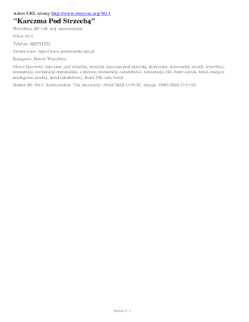 Adres URL strony http://www.eturysta.org/3611 "Karczma Pod Strzechą" Wierzbica, 05-140, woj. mazowieckie Ulica: 63 a Telefon: 602551522 Strona www: http://www.podstrzecha.net.pl Kategorie: Hotele Wierzbica Słowa kluczowe: karczma, pod strzechą, strzecha, karczma pod strzechą, dzierżenin, dzierzenin, serock, wierzbica, restauracja, restauracja staropolska, z drzewa, restauracja całodobowa, restauracja 24h, hotel serock, hotel, miejsca noclegowe, nocleg, hotel całodobowy, hotel 24h, sala wesel Numer ID: 3611, liczba odsłon: 710, aktywacja: 19/03/2010 13:51:07, edycja: 19/03/2010 13:51:07 Strona 1 / 1