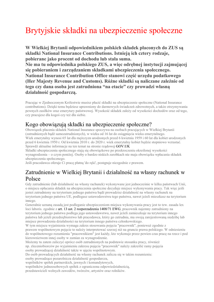 W Wielkiej Brytanii odpowiednikiem polskich składek płaconych do ZUS są