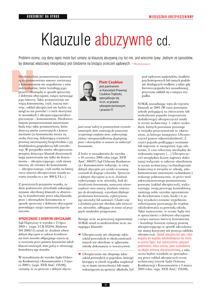 KONSUMENT NA RYNKU MIESIĘCZNIK UBEZPIECZENIOWY Klauzule abuzywne cd. Problem oceny, czy dany zapis może być uznany za klauzulę abuzywną czy też nie, jest wiecznie żywy. Jednym ze sposobów, by dokonać właściwej interpretacji jest śledzenie na bieżąco orzeczeń sądowych. – PIOTR CZUBLUN N Niedozwolone postanowienia umowne są to postanowienia umowy zawieranej z konsumentem nie uzgodnione z nim indywidualnie, które kształtują jego prawa i obowiązki w sposób sprzeczny z dobrymi obyczajami, rażąco naruszając jego interesy. Takie postanowienia nie wiążą konsumenta, czyli, inaczej mówiąc, zakład ubezpieczeń nie będzie się mógł na nie powołać i z nich skorzystać w stosunkach z ubezpieczającym/ubezpieczonym – konsumentem. Niedozwolonymi postanowieniami umownymi będą więc takie postanowienia, które dotyczą umów zawieranych z konsumentami (za konsumenta uważa się osobę fizyczną, dokonującą czynności prawnej niezwiązanej bezpośrednio z jej działalnością gospodarczą lub zawodową). W przypadku umów ubezpieczenia przepisy dotyczące klauzul abuzywnych mają zastosowanie nie tylko do konsumenta – ubezpieczającego, czyli strony umowy, ale również do konsumenta – ubezpieczonego, czyli osoby, na której rzecz umowa ubezpieczenia została zawarta (wynika to z art. 808 § 5 k.c.). Z powyższych przepisów wynika, że dwie podstawowe przesłanki nakazujące uznanie określonej klauzuli za abuzywną, to kształtowanie przez taką klauzulę praw i obowiązków konsumenta w sposób sprzeczny z dobrymi obyczajami powodujące rażące naruszenie jego interesów. SPRZECZNOŚĆ Z DOBRYMI OBYCZAJAMI Sąd Najwyższy w wyroku z 13 lipca 2005 r. (sygn. I CK 832/04; Biuletyn SN 2005/11) uznał, że działanie wbrew dobrym obyczajom w zakresie kształtowania treści stosunku obligacyjnego wyraża się w tworzeniu przez partnera konsumenta takich klauzul umownych, które godzą w równowagę kontraktową tego stosunku. W uzasadnieniu do wyroku Sądu Ochrony Konkurencji i Konsumentów z 5 marca 2009 r. (sygn. XVII AmC 155/08), czytamy, że za sprzeczne z dobrymi obycza- Piotr Czublun jest partnerem w Kancelarii Prawnej Czublun Trębicki, specjalizuje się m.in. w prawie ubezpieczeniowym i prawie IT. jami uznać należy te postanowienia wzorców umownych, które zmierzają do naruszenia wzajemnego zaufania stron, wykorzystują istotną i nieusprawiedliwioną dysproporcję praw i obowiązków w umowie na niekorzyść konsumenta. Z kolei w uzasadnieniu do wyroku z 10 czerwca 2008 roku (sygn. XVII AmC 300/07) Sąd Ochrony Konkurencji i Konsumentów wskazuje, że istotą dobrych obyczajów jest szeroko rozumiany szacunek do drugiego człowieka. Sprzeczne z dobrymi obyczajami są m.in. działania wykorzystujące m.in. niewiedzę, brak doświadczenia konsumenta, naruszenie równorzędności stron umowy, działania zmierzające do dezinformacji, wywołania błędnego przekonania konsumenta, wykorzystania jego niewiedzy lub naiwności. Chodzi więc o działania potocznie określane jako nieuczciwe, nierzetelne, odbiegające in minus od przyjętych standardów postępowania. Bazując m.in. na powyższej argumentacji SOKiK uznał za niedozwolone m.in. następujące klauzule: Æ Ubezpieczenie nie obejmuje także szkód powstałych w okolicznościach innych niż określone w zgłaszaniu szkody dokonanym w towarzystwie. Æ Ubezpieczenie nie obejmuje także szkód powstałych w pojeździe, którego kierujący w chwili wypadku znajdował się w stanie nietrzeźwości lub stanie wskazującym na spożycie alkoholu, był 42 pod wpływem narkotyków, środków psychotropowych lub innych podobnie działających środków, a także gdy kierowca pojazdu bez uzasadnionej przyczyny oddalił się z miejsca wypadku. SOKiK uzasadniając wpis do rejestru klauzuli nr 2001 (W razie powstania szkody polegającej na zniszczeniu lub uszkodzeniu pojazdu (wyposażenia dodatkowego) ubezpieczyciel ustala w ocenie technicznej: 1. zakres uszkodzeń, których powstanie pozostaje w związku przyczynowym ze zdarzeniem, za którego następstwo Ubezpieczyciel ponosi odpowiedzialność, 2. części pojazdu podlegające wymianie lub naprawie w następstwie tego zdarzenia, 3. czas robocizny niezbędny do wykonania naprawy (…) Ubezpieczyciel uwzględnia koszty naprawy dokonanej wyłącznie w zakresie określonym w ocenie technicznej i technologicznie koniecznej w związku ze szkodą, udokumentowane imiennymi rachunkami.) wskazuje jednoznacznie, że przez treść zakwestionowanego postanowienia pozwany (zakład ubezpieczeń), wykorzystując swoją przewagę kontraktową, zastrzega sobie szerokie uprawnienia do decydowania o tym, kiedy i w jakiej wysokości zostanie wypełnione zobowiązanie pozwanego do wypłaty odszkodowania za powstałą szkodę. Takie zastrzeżenie, w ocenie Sądu stoi w sprzeczności z dobrymi obyczajami i rażąco narusza interesy konsumenta – kształtuje bowiem sytuację prawną ubezpieczającego w sposób zdecydowanie mniej korzystny niż pozycja zakładu ubezpieczeń. Zakład ubezpieczeń jako zobowiązany do wypłaty odszkodowania nie może, w ocenie Sądu, być jednocześnie jedynym podmiotem, który ocenia, jakie uszkodzenia są objęte ochroną ubezpieczeniową, a taka ocena będzie wynikała ze sporządzonej przez zakład ubezpieczeń oceny technicznej (wyrok Sądu Ochrony Konkurencji i Konsumentów z 5 marca 2009 roku; sygn. XVII AmC 155/08). KONSUMENT NA RYNKU GRUDZIEŃ 2010 Biorąc pod uwagę przedstawioną wyżej argumentację, należy przyjąć, że sprzeczność z dobrymi obyczajami to nic innego, jak działanie odbiegające od powszechnie przyjętych zasad uczciwości i rzetelności. Zakład ubezpieczeń nie powinien nakładać na swoich klientów obowiązków, których realizacja nie jest konieczna do wyegzekwowania przez klienta jego uprawnień (np. żądanie zbyt dużej liczby dokumentów przy likwidacji szkody) lub też posługiwać się językiem, który będ