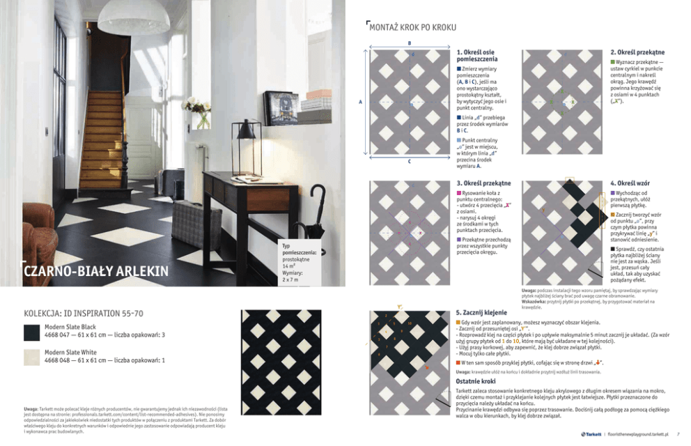 MONTAŻ KROK PO KROKU B 1. Określ osie pomieszczenia d A ■ Zmierz wymiary pomieszczenia (A, B i C), jeśli ma ono wystarczająco prostokątny kształt, by wytyczyć jego osie i punkt centralny. o X X d Xx CZARNO-BIAŁY ARLEKIN 9 4 8 3 7 Modern Slate White 4668 048 — 61 x 61 cm — liczba opakowań: 1 6 10 5 4. Określ wzór ■ Rysowanie koła z punktu centralnego: - utwórz 4 przecięcia „X” z osiami. - narysuj 4 okręgi ze środkami w tych punktach przecięcia. ■ Wychodząc od przekątnych, ułóż pierwszą płytkę. ■ Przekątne przechodzą przez wszystkie punkty przecięcia okręgu. y o ■ Zacznij tworzyć wzór od punktu „o”, przy czym płytka powinna przykrywać linię „y” i stanowić odniesienie. ■ Sprawdź, czy ostatnia płytka najbliżej ściany nie jest za wąska. Jeśli jest, przesuń cały układ, tak aby uzyskać pożądany efekt. 5. Zacznij klejenie 2 1 Xx 3. Określ przekątne Uwaga: podczas instalacji tego wzoru pamiętaj, by sprawdzając wymiary płytek najbliżej ściany brać pod uwagę czarne obramowanie. Wskazówka: przytnij płytki po przekątnej, by przygotować materiał na krawędzie. Y’ KOLEKCJA: ID INSPIRATION 55-70 Modern Slate Black 4668 047 — 61 x 61 cm — liczba opakowań: 3 o Typ pomieszczenia: prostokątne 14 m² Wymiary: 2 x 7 m X ■ Punkt centralny „o” jest w miejscu, w którym linia „d” przecina środek wymiaru A. C Xx o ■ Wyznacz przekątne — ustaw cyrkiel w punkcie centralnym i nakreśl okrąg. Jego krawędź powinna krzyżować się z osiami w 4 punktach („X”). X ■ Linia „d” przebiega przez środek wymiarów B i C. Xx 2. Określ przekątne d ■ Gdy wzór jest zaplanowany, możesz wyznaczyć obszar klejenia. - Zacznij od przesuniętej osi „Y’”. - Rozprowadź klej na części płytek i po upływie maksymalnie 5 minut zacznij je układać. (Za wzór użyj grupy płytek od 1 do 10, które mają być układane w tej kolejności). - Użyj prasy korkowej, aby zapewnić, że klej dobrze związał płytki. - Mocuj tylko całe płytki. ■ W ten sam sposób przyklej płytki, cofając się w stronę drzwi „ ”. Uwaga: krawędzie ułóż na końcu i dokładnie przytnij wzdłuż linii trasowania. Ostatnie kroki Uwaga: Tarkett może polecać kleje różnych producentów, nie gwarantujemy jednak ich niezawodności (lista jest dostępna na stronie: professionals.tarkett.com/content/list-recommended-adhesives). Nie ponosimy odpowiedzialności za jakiekolwiek niedostatki tych produktów w połączeniu z produktami Tarkett. Za dobór właściwego kleju do konkretnych warunków i odpowiednie jego zastosowanie odpowiadają producent kleju i wykonawca prac budowlanych. Tarkett zaleca stosowanie konkretnego kleju akrylowego z długim okresem wiązania na mokro, dzięki czemu montaż i przyklejanie kolejnych płytek jest łatwiejsze. Płytki przeznaczone do przycięcia należy układać na końcu. Przycinanie krawędzi odbywa się poprzez trasowanie. Dociśnij całą podłogę za pomocą ciężkiego walca w obu kierunkach, by klej dobrze związał. flooristhenewplayground.tarkett.pl 7