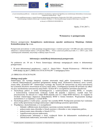 „Czysta komunikacja publiczna – zwiększenie ększenie mobilno mobilności mieszkańców ców Aglomeracji Opolskiej oraz modernizacja infrastruktury towarzyszącej towarzysz transportowi publicznemu – etap I” Projekt współfinansowanego w ramach Programu Operacyjnego Infrastruktura I Środowisko 2014-2020, 2020, oś priorytetowa: VI Rozwój niskoemisyjnego transportu zbiorowego w miastach, Działanie: 6.1 Rozwój publicznego transportu zbiorowego w miastach. nr decyzji: nr POIS.06.01.00-00-0003/16, Opole, 27.01.2017 r. Wykonawcy w postępowaniu post Dotyczy postępowania: Kompleksowa modernizacja zajezdni zajezdni autobusowej Miejskiego Zakładu Zakła Komunikacyjnego Sp. z o.o. Postępowanie prowadzone w trybie przetargu nieograniczonego o wartości powyżej 5 225 000 euro jako zamówienie sektorowe z zastosowaniem ustawy z 29 stycznia 2004 r. – Prawo zamówień publicznych (Dz. U. z 2015 r. poz. 2164 z późniejszymi zmianami), ), nazywanej w dalszej części Prawem. Informacja o modyfikacji mod dokumentacji postępowania Na podstawie art. 38 ust. 4 Prawa Zamawiający Zamawiaj dokonuje następujących ących zmian w dokumentacji postępowania: 1. W treści dokumentacji projektowej jektowej – część A – Stacja Paliw – Projekt Wykonawczy ykonawczy – PW0146-AD0300 dodaje się pkt 8 „OBSŁUGA OBSŁUGA STACJI PALIW” PALIW o następującej treści: „8. OBSŁUGA STACJI PALIW. Obsługa stacji paliw Zamawiający cy nie wymaga integracji systemu sterowania stacji paliw (tymczasowej i docelowej) z obecnie funkcjonującym cym systemem (programem) obsługi stacji. Wykonawca dostarczy nowy system, system zwany dalej „Systemem SP”. Zamawiający Zamawiaj wymaga, aby System SP zastosowany na stacji tymczasowej był systemem docelowo stosowanym na nowej stacji paliw, paliw, a konfiguracja Systemu SP powinna się si odbyć raz przy uruchomieniu tymczasowej stacji Paliw. Paliw System SP w szczególności ści powinien umożliwiać: • Dystrybucję paliwa w trybie bezobsługowym z wykorzystaniem czytnika RFID, w związku zwi z koniecznością wykonywania rozlicze rozliczeń wydań dla pojazdu du i kierowcy, czytnik musi być by przystosowany do odczytu nr z chipa RFID pojazdu oraz nr z chipa RFID kierowcy. kierowcy Ze względu na trwałość Zamawiający cy dopuszcza identyfikatory RFID w formie breloków.. Wyposażenie Wyposa każdego dystrybutora w co najmniej 1 czytnik RFID. • Dystrybucję paliwa w trybie pracy prac „ręcznej” bez czytnika RFID. Przełączenie ączenie powinno być wykonane przez osobę uprawnionąą (wymaga autoryzacji i odpowiedniego poziomu uprawnień). uprawnie • Współpracę z dystrybutorami, a w szczególności: szczególno − blokada i odblokowanie dystrybutora z poziomu systemu (modułu systemu), − pokazywanie stanu zbiornika w litrach, poziom w zbiorniku w mm, temperaturę temperatur paliwa, − pokazywanie stanu zbiornika w litrach (15°C), ( − sygnalizowanie procesu tankowania, − przekazywanie informacji o ilości ilo ci wydanych litrów do dokumentów rozchodowych po zakończeniu czeniu tankowania, zerowanie licznika. KOMPLEKSOWA MODERNIZACJA ZAJEZDNI AUTOBUSOWEJ MIEJSKIEGO ZAKŁADU KOMUNIKACYJNEGO SP. Z O. O. 1 „Czysta komunikacja publiczna – zwiększenie ększenie mobilno mobilności mieszkańców ców Aglomeracji Opolskiej oraz modernizacja infrastruktury towarzyszącej towarzysz transportowi publicznemu – etap I” Projekt współfinansowanego w ramach Programu Operacyjnego Infrastruktura I Środowisko 2014-2020, 2020, oś priorytetowa: VI Rozwój niskoemisyjnego transportu zbiorowego w miastach, Działanie: 6.1 Rozwój publicznego transportu zbiorowego w miastach. nr decyzji: nr POIS.06.01.00-00-0003/16, • • • • • • Prowadzenie gospodarki magazynowej, magazynowej związanej zanej z obrotem paliwa w temperaturze referencyjnej (15°C), która w szczególności powinna umożliwiać: − wystawianie dokumentów przychodowych, z określeniem leniem temperatury paliwa paliwa, − wystawianie dokumentów rozchodowych, − odczyt stanu zbiorników (na (na podstawie przychodów i rozchodów liczonych w temp. referencyjnej 15°C), − możliwość wyboru przy rozchodach jednostki organizacyjnej, pojazdu i kierowcy, kierowcy − przeprowadzenie inwentaryzacji. inwentaryzacji Wykonywanie zestawień w zadanym okresie, okresie a w szczególności: − dokumentów przychodowych, przychodowych − dokumentów rozchodowych z możliwością mo wyfiltrowania danych dla jednostki organizacyjnej, osoby wystawiającej, dystrybutora, kierowcy, pojazdu lub wybranego pojazdu i kierowcy (przy wyborze pojazdu powinna pojawiać pojawia się informacja cja o nr bocznym i rejestracyjnym), rejestracyjnym − stanu zbiornika na zadany dzień dzie (15°C), − przychodów i rozchodów na zadany dzień dzie (15°C), − porównanie wnanie stanu zbiorników liczone księgowo (15°C)) ze stanem zbiorników z urządzeń urz pomiarowych. Zapis zestawień i wydruków dokumentów do pdf, csv. csv Generowanie pliku csv z danymi o rozchodach dla wybranego typu dokumentu rozchodowego o zawartości: identyfikator dokumentu (WW, WZ);; data wystawienia dokumentu; nr dokumentu; wydział (jednostka organizacyjna), symbol pojazdu (nr w systemie), nr rejestracyjny pojazdu; nr kierowcy w systemie; imięę nazwisko kierowcy; nr (symbol) towaru; nazwa towaru; ilość (l). Integrację z systemem ERP VeritumXL w zakresie importu danych o kierowcach i pojazdach z systemu „VeritumXL”,, w tym numer RFID kierowcy i numer RFID pojazdu. Uporządkowanie dkowanie danych w słowniki, ddane słownikowe (katalogi), co najmniej:: − kontrahenci, − towary, − jednostki organizacyjne ( wydziały), − typy pojazdów (np. autobus, ciężarowy, ci gospodarczy), − pojazdy (możliwość ż ść przypisania RFID pojazdu, określenie lenie jednostki organizacyjnej organizacyjnej, do której jest przypisany pojazd, pojazd określenie typu pojazdu,, nr boczny, nr w syste