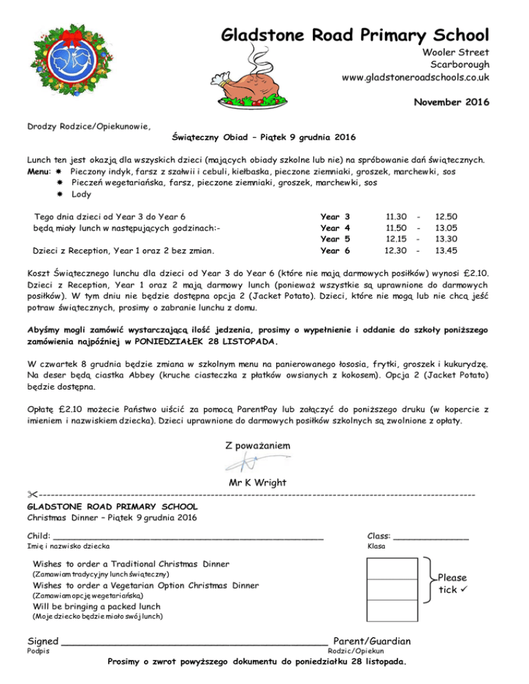 Gladstone Road Primary School Wooler Street Scarborough www.gladstoneroadschools.co.uk November 2016 Drodzy Rodzice/Opiekunowie, Świąteczny Obiad – Piątek 9 grudnia 2016 Lunch ten jest okazją dla wszyskich dzieci (mających obiady szkolne lub nie) na spróbowanie dań świątecznych. Menu: Pieczony indyk, farsz z szałwii i cebuli, kiełbaska, pieczone ziemniaki, groszek, marchewki, sos Pieczeń wegetariańska, farsz, pieczone ziemniaki, groszek, marchewki, sos Lody Tego dnia dzieci od Year 3 do Year 6 będą miały lunch w następujących godzinach:- Year Year Year Year Dzieci z Reception, Year 1 oraz 2 bez zmian. 3 4 5 6 11.30 11.50 12.15 12.30 - 12.50 13.05 13.30 13.45 Koszt Świątecznego lunchu dla dzieci od Year 3 do Year 6 (które nie mają darmowych posiłków) wynosi £2.10. Dzieci z Reception, Year 1 oraz 2 mają darmowy lunch (ponieważ wszystkie są uprawnione do darmowych posiłków). W tym dniu nie będzie dostępna opcja 2 (Jacket Potato). Dzieci, które nie mogą lub nie chcą jeść potraw świątecznych, prosimy o zabranie lunchu z domu. Abyśmy mogli zamówić wystarczającą ilość jedzenia, prosimy o wypełnienie i oddanie do szkoły poniższego zamówienia najpóźniej w PONIEDZIAŁEK 28 LISTOPADA. W czwartek 8 grudnia będzie zmiana w szkolnym menu na panierowanego łososia, frytki, groszek i kukurydzę. Na deser będą ciastka Abbey (kruche ciasteczka z płatków owsianych z kokosem). Opcja 2 (Jacket Potato) będzie dostępna. Opłatę £2.10 możecie Państwo uiścić za pomocą ParentPay lub załączyć do poniższego druku (w kopercie z imieniem i nazwiskiem dziecka). Dzieci uprawnione do darmowych posiłków szkolnych są zwolnione z opłaty. Z poważaniem Mr K Wright -----------------------------------------------------------------------------------------------------------GLADSTONE ROAD PRIMARY SCHOOL Christmas Dinner – Piątek 9 grudnia 2016 Child: _________________________________________________ Class: ______________ Imię i nazwisko dziecka Klasa Wishes to order a Traditional Christmas Dinner (Zamawiam tradycyjny lunch świąteczny) Please tick Wishes to order a Vegetarian Option Christmas Dinner (Zamawiam opcję wegetariańską) Will be bringing a packed lunch (Moje dziecko będzie miało swój lunch) Signed ____________________________________________ Parent/Guardian Podpis Rodzic/Opiekun Prosimy o zwrot powyższego dokumentu do poniedział ku 28 listopada.
