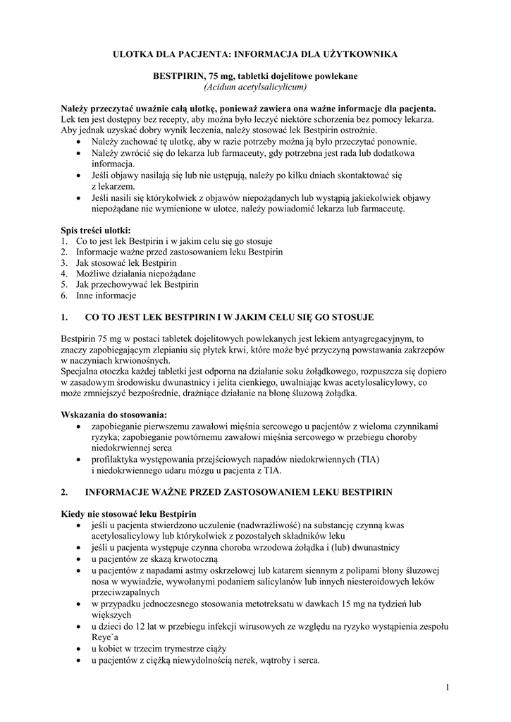 ULOTKA DLA PACJENTA: INFORMACJA DLA UŻYTKOWNIKA BESTPIRIN, 75 mg, tabletki dojelitowe powlekane (Acidum acetylsalicylicum) Należy przeczytać uważnie całą ulotkę, ponieważ zawiera ona ważne informacje dla pacjenta. Lek ten jest dostępny bez recepty, aby można było leczyć niektóre schorzenia bez pomocy lekarza. Aby jednak uzyskać dobry wynik leczenia, należy stosować lek Bestpirin ostrożnie. Należy zachować tę ulotkę, aby w razie potrzeby można ją było przeczytać ponownie. Należy zwrócić się do lekarza lub farmaceuty, gdy potrzebna jest rada lub dodatkowa informacja. Jeśli objawy nasilają się lub nie ustępują, należy po kilku dniach skontaktować się z lekarzem. Jeśli nasili się którykolwiek z objawów niepożądanych lub wystąpią jakiekolwiek objawy niepożądane nie wymienione w ulotce, należy powiadomić lekarza lub farmaceutę. Spis treści ulotki: 1. Co to jest lek Bestpirin i w jakim celu się go stosuje 2. Informacje ważne przed zastosowaniem leku Bestpirin 3. Jak stosować lek Bestpirin 4. Możliwe działania niepożądane 5. Jak przechowywać lek Bestpirin 6. Inne informacje 1. CO TO JEST LEK BESTPIRIN I W JAKIM CELU SIĘ GO STOSUJE Bestpirin 75 mg w postaci tabletek dojelitowych powlekanych jest lekiem antyagregacyjnym, to znaczy zapobiegającym zlepianiu się płytek krwi, które może być przyczyną powstawania zakrzepów w naczyniach krwionośnych. Specjalna otoczka każdej tabletki jest odporna na działanie soku żołądkowego, rozpuszcza się dopiero w zasadowym środowisku dwunastnicy i jelita cienkiego, uwalniając kwas acetylosalicylowy, co może zmniejszyć bezpośrednie, drażniące działanie na błonę śluzową żołądka. Wskazania do stosowania: zapobieganie pierwszemu zawałowi mięśnia sercowego u pacjentów z wieloma czynnikami ryzyka; zapobieganie powtórnemu zawałowi mięśnia sercowego w przebiegu choroby niedokrwiennej serca profilaktyka występowania przejściowych napadów niedokrwiennych (TIA) i niedokrwiennego udaru mózgu u pacjenta z TIA. 2. INFORMACJE WAŻNE PRZED ZASTOSOWANIEM LEKU BESTPIRIN Kiedy nie stosować leku Bestpirin jeśli u pacjenta stwierdzono uczulenie (nadwrażliwość) na substancję czynną kwas acetylosalicylowy lub którykolwiek z pozostałych składników leku jeśli u pacjenta występuje czynna choroba wrzodowa żołądka i (lub) dwunastnicy u pacjentów ze skazą krwotoczną u pacjentów z napadami astmy oskrzelowej lub katarem siennym z polipami błony śluzowej nosa w wywiadzie, wywołanymi podaniem salicylanów lub innych niesteroidowych leków przeciwzapalnych w przypadku jednoczesnego stosowania metotreksatu w dawkach 15 mg na tydzień lub większych u dzieci do 12 lat w przebiegu infekcji wirusowych ze względu na ryzyko wystąpienia zespołu Reye`a u kobiet w trzecim trymestrze ciąży u pacjentów z ciężką niewydolnością nerek, wątroby i serca. 1 Kiedy zachować szczególną ostrożność stosując lek Bestpirin Kwas acetylosalicylowy należy stosować ostrożnie u pacjentów z chorobą wrzodową żołądka i (lub) dwunastnicy w wywiadzie, u pacjentów jednocześnie stosujących leki przeciwzakrzepowe, z zaburzoną czynnością nerek lub wątroby, z nadciśnieniem tętniczym, u pacjentów odwodnionych, a także u kobiet w pierwszym i drugim trymestrze ciąży oraz w okresie karmienia piersią. Należy zachować ostrożność stosując kwas acetylosalicylowy u pacjentów z niedoborem dehydrogenazy glukozo-6-fosforanowej oraz nadwrażliwością na leki przeciwzapalne i przeciwreumatyczne. Kwas acetylosalicylowy ze względu na działanie antyagregacyjne może powodować wydłużenia czasu krwawienia w czasie i po zabiegach chirurgicznych (włącznie z niewielkimi zabiegami, np. ekstrakcja zęba). Kwas acetylosalicylowy może powodować skurcz oskrzeli i wywołać napad astmy lub inne reakcje nadwrażliwości, szczególnie u pacjentów z astmą oskrzelową, przewlekłymi schorzeniami układu oddechowego, katarem siennym lub polipami błony śluzowej nosa. Ostrzeżenie to odnosi się także do pacjentów wykazujących reakcje alergiczne (np. odczyny skórne, świąd, pokrzywka) na inne substancje. Kwas acetylosalicylowy stosowany nawet w małych dawkach zmniejsza wydalanie kwasu moczowego z organizmu. U pacjentów ze zmniejszonym wydalaniem kwasu moczowego kwas acetylosalicylowy może wywołać napad dny moczanowej. Bardzo rzadko wystąpić może zaleganie jednej lub więcej tabletek w żołądku u pacjentów z utrudnionym opróżnianiem żołądka. Zalegające w żołądku tabletki mogą tworzyć konglomerat, wskutek zlepienia się otoczek. Powoduje to uczucie pełności w nadbrzuszu, a nawet odruchowe wymioty. W niektórych przypadkach konieczne może być płukanie żołądka obojętnym lub lekko zasadowym roztworem. Stosowanie leku Bestpirin z innymi lekami Leki przeciwwskazane do jednoczesnego stosowania z kwasem acetylosalicylowym: metotreksat w dawkach 15 mg na tydzień lub większych Zwiększenie toksycznego działania metotreksatu na szpik (zmniejszony klirens nerkowy metotreksatu podczas jednoczesnego stosowania z lekami przeciwzapalnymi – w tym z kwasem acetylosalicylowym – oraz wypieranie przez salicylany metotreksatu z połączeń z białkami osocza). Interakcje wymagające zachowania szczególnej ostrożności: metotreksat w dawkach 15 mg na tydzień lub większych Zwiększenie toksycznego działania metotreksatu na szpik (zmniejszony klirens nerkowy metotreksatu podczas jednoczesnego stosowania z lekami przeciwzapalnymi – w tym z kwasem acetylosalicylowym – oraz wypieranie przez salicylany metotreksatu z połączeń z białkami osocza. ibuprofen Jednoczesne stosowanie ibuprofenu antagonizuje nieodwracalne hamowanie agregacji płytek krwi przez kwas acetylosalicylowy. U pacjentów ze zwiększonym ryzykiem incydentów sercowo-naczyniowych leczenie ibuprofenem może zmniejszać działanie kardioprotekcyjne kwasu acetylosalicylowego. leki przeciwzakrzepow