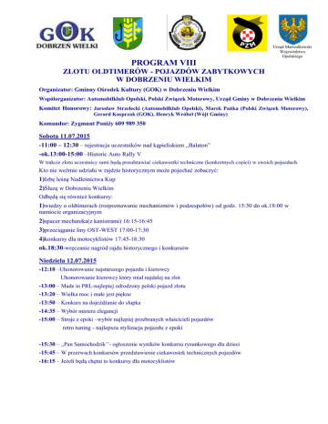 Urząd Marszałkowski Województwa Opolskiego PROGRAM VIII ZLOTU OLDTIMERÓW - POJAZDÓW ZABYTKOWYCH W DOBRZENIU WIELKIM Organizator: Gminny Ośrodek Kultury (GOK) w Dobrzeniu Wielkim Współorganizator: Automobilklub Opolski, Polski Związek Motorowy, Urząd Gminy w Dobrzeniu Wielkim Komitet Honorowy: Jarosław Strzelecki (Automobilklub Opolski), Marek Pańka (Polski Związek Motorowy), Gerard Kasprzak (GOK), Henryk Wróbel (Wójt Gminy) Komandor: Zygmunt Poniży 609 989 350 Sobota 11.07.2015 -11:00 – 12:30 – rejestracja uczestników nad kąpieliskiem ,,Balaton” -ok.13:00-15:00 –Historic Auto Rally V W trakcie zlotu uczestnicy sami będą przedstawiać ciekawostki techniczne (konkretnych części) w swoich pojazdach. Kto nie weźmie udziału w rajdzie historycznym może pojechać zobaczyć: 1)Izbę leśną Nadleśnictwa Kup 2)Śluzę w Dobrzeniu Wielkim Odbędą się również konkursy: 1)wiedzy o oldtimerach (rozpoznawanie mechanizmów i podzespołów) od godz. 15:30 do ok.18:00 w namiocie organizacyjnym 2)spacer mechanika(z kanistrami) 16:15-16:45 3)przeciąganie liny OST-WEST 17:00-17:30 4)konkursy dla motocyklistów 17:45-18:30 ok.18:30-wręczanie nagród rajdu historycznego i konkursów Niedziela 12.07.2015 -12:10 –Uhonorowanie najstarszego pojazdu i kierowcy Uhonorowanie kierowcy który miał najdalej na zlot -13:00 – Made in PRL-najlepiej odrodzony polski pojazd zlotu -13:20 – Wielka moc i małe jest piękne -13:50 – Konkurs na dojeżdżanie do słupka -14:35 – Wybór mistera elegancji -15:00 – Stroje z epoki –wybór najlepiej przebranych właścicieli pojazdów retro tuning - najlepsza stylizacja pojazdu z epoki -15:30 – ,,Pan Samochodzik’’- ogłoszenie wyników konkursu rysunkowego dla dzieci -15:45 – W przerwach konkursów przedstawienie ciekawostek technicznych pojazdów -16:15 – Jeżeli będą chętni to konkursy dla motocyklistów