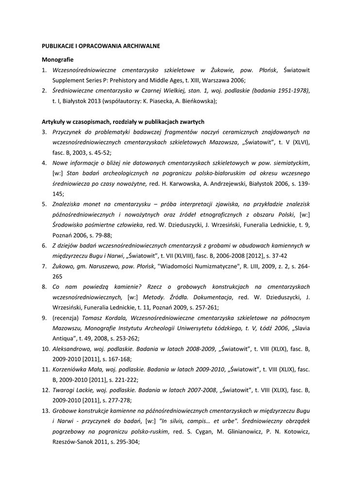 PUBLIKACJE I OPRACOWANIA ARCHIWALNE Monografie 1. Wczesnośredniowieczne cmentarzysko szkieletowe w Żukowie, pow. Płońsk, Światowit Supplement Series P: Prehistory and Middle Ages, t. XIII, Warszawa 2006; 2. Średniowieczne cmentarzysko w Czarnej Wielkiej, stan. 1, woj. podlaskie (badania 1951-1978), t. I, Białystok 2013 (współautorzy: K. Piasecka, A. Bieńkowska); Artykuły w czasopismach, rozdziały w publikacjach zwartych 3. Przyczynek do problematyki badawczej fragmentów naczyń ceramicznych znajdowanych na wczesnośredniowiecznych cmentarzyskach szkieletowych Mazowsza, „Światowit”, t. V (XLVI), fasc. B, 2003, s. 45-52; 4. Nowe informacje o bliżej nie datowanych cmentarzyskach szkieletowych w pow. siemiatyckim, [w:] Stan badań archeologicznych na pograniczu polsko-białoruskim od okresu wczesnego średniowiecza po czasy nowożytne, red. H. Karwowska, A. Andrzejewski, Białystok 2006, s. 139145; 5. Znaleziska monet na cmentarzysku – próba interpretacji zjawiska, na przykładzie znalezisk późnośredniowiecznych i nowożytnych oraz źródeł etnograficznych z obszaru Polski, [w:] Środowisko pośmiertne człowieka, red. W. Dzieduszycki, J. Wrzesiński, Funeralia Lednickie, t. 9, Poznań 2006, s. 79-88; 6. Z dziejów badań wczesnośredniowiecznych cmentarzysk z grobami w obudowach kamiennych w międzyrzeczu Bugu i Narwi, „Światowit”, t. VII (XLVIII), fasc. B, 2006-2008 [2012], s. 37-42 7. Żukowo, gm. Naruszewo, pow. Płońsk, "Wiadomości Numizmatyczne", R. LIII, 2009, z. 2, s. 264265 8. Co nam powiedzą kamienie? Rzecz o grobowych konstrukcjach na cmentarzyskach wczesnośredniowiecznych, [w:] Metody. Źródła. Dokumentacja, red. W. Dzieduszycki, J. Wrzesiński, Funeralia Lednickie, t. 11, Poznań 2009, s. 257-261; 9. (recenzja) Tomasz Kordala, Wczesnośredniowieczne cmentarzyska szkieletowe na północnym Mazowszu, Monografie Instytutu Archeologii Uniwersytetu Łódzkiego, t. V, Łódź 2006, „Slavia Antiqua”, t. 49, 2008, s. 253-262; 10. Aleksandrowo, woj. podlaskie. Badania w latach 2008-2009, „Światowit”, t. VIII (XLIX), fasc. B, 2009-2010 [2011], s. 167-168; 11. Korzeniówka Mała, woj. podlaskie. Badania w latach 2009-2010, „Światowit”, t. VIII (XLIX), fasc. B, 2009-2010 [2011], s. 221-222; 12. Twarogi Lackie, woj. podlaskie. Badania w latach 2007-2008, „Światowit”, t. VIII (XLIX), fasc. B, 2009-2010 [2011], s. 277-278; 13. Grobowe konstrukcje kamienne na późnośredniowiecznych cmentarzyskach w międzyrzeczu Bugu i Narwi - przyczynek do badań, [w:] "In silvis, campis… et urbe". Średniowieczny obrządek pogrzebowy na pograniczu polsko-ruskim, red. S. Cygan, M. Glinianowicz, P. N. Kotowicz, Rzeszów-Sanok 2011, s. 295-304; 14. Źródła archeologiczne w badaniach nad zróżnicowaniem społeczności lokalnych w późnośredniowiecznej ziemi drohickiej, [w:] Obraz struktury społecznej w świetle źródeł archeologicznych w pradziejach i średniowieczu, red. M. Rybicka, Rzeszów 2011, s. 169-177; 15. Bi-ritual burials in the central Bug river basin during the Middle Ages, [w:] Rome, Constantinople and Newly-Converted Europe. Archaeological and Historical Evidence, t. 1, red. M. Salamon, M. Wołoszyn, A. Musin, P. Špehar, U źródeł Europy Środkowo-wschodniej / Frühzeit Ostmitteleuropas t. 1, cz. 1, Kraków-Leipzig-Rzeszów-Warszawa 2012, s. 603-612 16. Twarogi Lackie, woj. podlaskie. Badania w 2011 r., „Światowit”, t. IX (L), fasc. B, 2011 [2012], s. 359-362; 17. Uwagi o funkcji i symbolice konstrukcji wczesnośredniowiecznych grobów w obudowach kamiennych, „Acta Archaeologica Lodziensia” 2014, t. 60, s. 87-101 18. Rodzaje grobów, [w:] Cmentarzysko w Czarnej Wielkiej st. 1 w świetle badań z lat 1951-1978, t. 2, red. H. Karwowska, Białystok 2014, s. 9-25 19. Układ pochówków, [w:] Cmentarzysko w Czarnej Wielkiej st. 1 w świetle badań z lat 1951-1978, t. 2, red. H. Karwowska, Białystok 2014, s. 27-39 20. Metalowe ozdoby i części stroju, [w:] Cmentarzysko w Czarnej Wielkiej st. 1 w świetle badań z lat 1951-1978, t. 2, red. H. Karwowska, Białystok 2014, s. 161-194 21. Narzędzia i uzbrojenie, [w:] Cmentarzysko w Czarnej Wielkiej st. 1 w świetle badań z lat 19511978, t. 2, red. H. Karwowska, Białystok 2014, s. 195-203 22. Pozostałe zabytki ruchome, [w:] Cmentarzysko w Czarnej Wielkiej st. 1 w świetle badań z lat 1951-1978, t. 2, red. H. Karwowska, Białystok 2014, s. 205-213 23. Analiza chronologiczno-przestrzenna cmentarzyska, [w:] Cmentarzysko w Czarnej Wielkiej st. 1 w świetle badań z lat 1951-1978, t. 2, red. H. Karwowska, Białystok 2014, s. 215-226 24. Uwagi końcowe, [w:] Cmentarzysko w Czarnej Wielkiej st. 1 w świetle badań z lat 1951-1978, t. 2, red. H. Karwowska, Białystok 2014, s. 227-228 25. Mielnik, woj. podlaskie. Badania w 2012 r., „Światowit”, t. X (LI), fasc. B (współautor G. Śnieżko; w druku); 26. Średniowieczne cmentarzysko w Rogawce w pow. siemiatyckim w świetle badań Siergieja Dubinskiego w 1910 roku, „Światowit”, t. X (LI), fasc. B (w druku); 27. Early mediaeval barrows in stone constructions in the area between the Central Bug and the Upper Narew rivers, „Archaeologia Polona” (w druku); Opracowania archiwalne 28. Sprawozdanie z badań wykopaliskowych w Niemirowie, gm. Mielnik, pow. Siemiatycze, woj. podlaskie, stan. IV, w 2006 r., Warszawa 2006, ss. 29 + ryc. (współautor E. Kowalczyk-Heyman; kps w archiwum Wojewódzkiego Urzędu Ochrony Zabytków w Białymstoku); 29. Sprawozdanie z badań wykopaliskowych w Niemirowie, gm. Mielnik, pow. Siemiatycze, woj. podlaskie, stan. IV, w 2007 r., Warszawa 2008, ss. 34 + ryc. (współautor E. Kowalczyk-Heyman; kps w archiwum WUOZ w Białymstoku); 30. Sprawozdanie z badań wykopaliskowych w Twarogach Lackich, gm. Perlejewo, pow. Siemiatycze, woj. podlaskie, stan. „Cmentarzysko Jaćwingów”, w 2007 r., Warszawa 2008, ss. 27 + ryc. (współautor E. Kowalczyk-Heyman; kps w archiwum WUOZ w Białymstoku); 31. Sprawozda