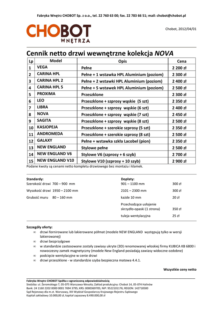 Fabryka Wnętrz CHOBOT Sp. z o.o., tel. 22 760 63 00; fax. 22 783 66 51; mail: [email protected] Chobot, 2012/04/01 Cennik netto drzwi wewnętrzne kolekcja NOVA Lp 1 2 3 4 5 6 7 8 9 10 11 12 13 14 15 Model Opis VEGA CARINA HPL CARINA HPL 2 CARINA HPL 5 PROXIMA LEO LIBRA NOVA SAGITA KASJOPEJA ANDROMEDA GALAXY NEW ENGLAND NEW ENGLAND V6 NEW ENGLAND V10 Pełne Pełne + 1 wstawka HPL Aluminium (poziom) Pełne + 2 wstawki HPL Aluminium (poziom) Pełne + 5 wstawek HPL Aluminium (poziom) Przeszklone Przeszklone + szprosy wąskie (5 szt) Przeszklone + szprosy wąskie (6 szt) Przeszklone + szprosy wąskie (7 szt) Przeszklone + szprosy wąskie (8 szt) Przeszklone + szerokie szprosy (5 szt) Przeszklone + szerokie szprosy (8 szt) Pełne + wstawka szkła Lacobel (pion) Stylowe pełne Stylowe V6 (szprosy + 6 szyb) Stylowe V10 (szprosy + 10 szyb) Cena 2 200 zł 2 300 zł 2 400 zł 2 500 zł 2 300 zł 2 350 zł 2 400 zł 2 450 zł 2 500 zł 2 350 zł 2 500 zł 2 350 zł 2 500 zł 2 700 zł 2 900 zł Podane kwoty są cenami netto kompletu drzwiowego bez montażu i klamek. Standardy: Szerokość drzwi 700 – 900 mm Dopłaty: 901 – 1100 mm 300 zł Wysokość drzwi 1950 – 2100 mm 2101 – 2300 mm 300 zł Grubość muru każde 10 mm 20 zł Przechodzące usłojenie skrzydło-opaski (1 strona) 350 zł tuleja wentylacyjna 25 zł 80 – 160 mm Szczegóły oferty: • drzwi fornirowane lub lakierowane półmat (modele NEW ENGLAND występują tylko w wersji lakierowanej) • drzwi bezprzylgowe • w standardzie zastosowane zostały zawiasy ukryte (3D) renomowanej włoskiej firmy KUBICA KB 6800 i nowoczesny zamek magnetyczny (modele New England posiadają zawiasy widoczne ozdobne) • podcięcie wentylacyjne w cenie drzwi • drzwi przeszklone - w standardzie szyba bezpieczna matowa 4.4.1. Wszystkie ceny netto _________________________________________________________________________________________________________________ Fabryka Wnętrz CHOBOT Spółka z ograniczoną odpowiedzialnością Siedziba: ul. Żeromskiego 7, 05-075 Warszawa-Wesoła; Zakład produkcyjny: Chobot 14, 05-074 Halinów Bank: 24 1160 2202 0000 0001 7694 3795; KRS: 0000369705; NIP: 9522101176; REGON: 142718500 Sąd Rejonowy dla m.st. Warszawy, XIII Wydział Gospodarczy Krajowego Rejestru Sądowego Kapitał zakładowy 10.000,00 zł, kapitał zapasowy 8.490.000,00 zł