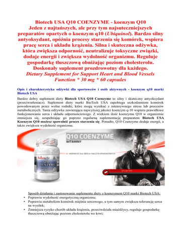 Biotech USA Q10 COENZYME - koenzym Q10 Jeden z najtańszych, ale przy tym najsuteczniejszych preparatów opartych o koenzym q10 (Ubiquinol). Bardzo silny antyoksydant, opóźnia procesy starzenia się komórek, wspiera pracę serca i układu krążenia. Silna i skuteczna odżywka, która zwiększa odporność, neutralizuje toksyczne związki, dodaje energii i zwiększa wydolność organizmu. Reguluje gospodarkę tłuszczową obniżając poziom cholesterolu. Doskonały suplement prozdrowotny dla każdego. Dietary Supplement for Support Heart and Blood Vessels Function * 30 mg * 60 capsules Opis i charakterystyka odżywki dla sportowców i osób aktywnych - koenzym q10 marki Biotech USA Bardzo dobry suplement diety Biotech USA Q10 Coenzyme to silny i skuteczny antyoksydant (przeciwutleniacz). Suplement diety marki BioTech USA zapobiega uszkodzeniom komórek powodowanym przez wolne rodniki, które mogą wynikać z intensywnego stresu lub procesów metabolicznych. Tania odżywka zawierająca najwyższej jakości koenzym q-10 wspiera prawidłowe funkcjonowanie serca i układu odpornościowego. Z wiekiem ilość koenzymu Q10 w organizmie zmniejsza się, uzupełniając go poprzez regularną suplementację preparatem Biotech USA Koenzym Q10 możesz spowolnić proces starzenia się. Ponadto, Q10 Coenzyme dodaje energii, a także zwiększa wydolność organizmu. Sposób działania i zastosowanie suplementu diety z koenzymem Q10 marki Biotech USA: • Poprawia wydolność energetyczną organizmu; • Poprawia metabolizm komórek mięśnia sercowego, a tym samym zwiększa tolerancję serca na wysiłek; • Zmniejsza ryzyko chorób układu krążenia, przeciwdziała miażdżycy, reguluje gospodarkę tłuszczową obniżając poziom cholesterolu we krwi; • Stosowany pomocniczo w leczeniu nadciśnienia; • Stosowany w diecie osób uprawiających sport wyczynowy. Koenzym Q10 zawarty w Biotech USA Q10 Coenzyme dodaje energii, a także pomaga zwiększyć wydolność organizmu. Dostarczanie energii naszym komórkom jest możliwe dzięki koenzymowi Q10, zwanego również ubichinonem. Substancja ta jest obecna w każdej naszej komórce, pomaga składnikom odżywczym przekształcić się w nośnik energii - ATP (adenozynotrifosforan). Koenzym Q10 jest produkowany przez nasz organizm, jednak warto pamiętać, że endogenna produkcja koenzymu Q10 zmniejsza się wraz z upływem lat (począwszy od 30-35 r.ż.), dlatego warto też wtedy pomyśleć o suplementacji koenzymem Q10 - pomocny tutaj będzie tani suplement diety Biotech USA Q10 Coenzyme, który zawiera najwyższej jakości koenzym Q-10. Suplementacja preparatem o silnych właściwościach antyoksydacyjnych Q10 Coenzyme polecane jest również wszystkim sportowcom, osobom aktywnym oraz narażonych na stres. Antyuleniacz Biotech USA Q10 Coenzyme niweluje skutki stresu, zwalcza wolne rodniki, zwiększa wydolność organizmu oraz działa korzystnie na układ immunologiczny. • • • • • • Wskazania do stosowania suplementu Biotech USA Q10 Coenzyme, czyli dla kogo jest dedykowany preparat: osoby po 30 roku życia, sportowcy i osoby aktywne, osoby narażone na stres, w przypadku zwiększonej aktywności psycho-fizycznej, w przypadku niezrównoważonej diety, pomocniczo przy problemach z ciśnieniem i profilaktycznie jako przeciwdziałanie chorobom serca i układu krążenia. Dawkowanie oraz sposób użycia koenzym Q10 od Biotech USA: 1-2 kapsułki dziennie. Należy obficie popić wodą. Skład koenzymu Co Q10 Biotech USA: Zawartość odżywki: 1 kapsułka: Koenzym Q10 30 mg Profesjonaliści polecają www.kulturystyka.sklep.pl, ponieważ jest to najtańszy sklep internetowy z oryginalnymi odżywkami i suplami z Ameryki, m. in. marki BioTech USA. Pamiętaj, że tylko hurtownia z odżywkami w Gliwicach na Śląsku gwarantuje tak niskie ceny, a przy tym najwyższą jakość obsługi i gratisy do zamówienia. Producent suplementu diety o silnych właściwościach antyoksydacyjnych - Q10 Coenzyme: BioTech USA Zobacz wszystkie suplementy diety z kategorii: najtańszy koenzym Q10 w sieci - idealne uzupełnienie diety każdej aktywnej osoby. W naszym sklepie internetowym znajdziesz koenzym Q10 w najniższych cenach - taniej niż w aptece! www.kulturystyka.sklep.pl