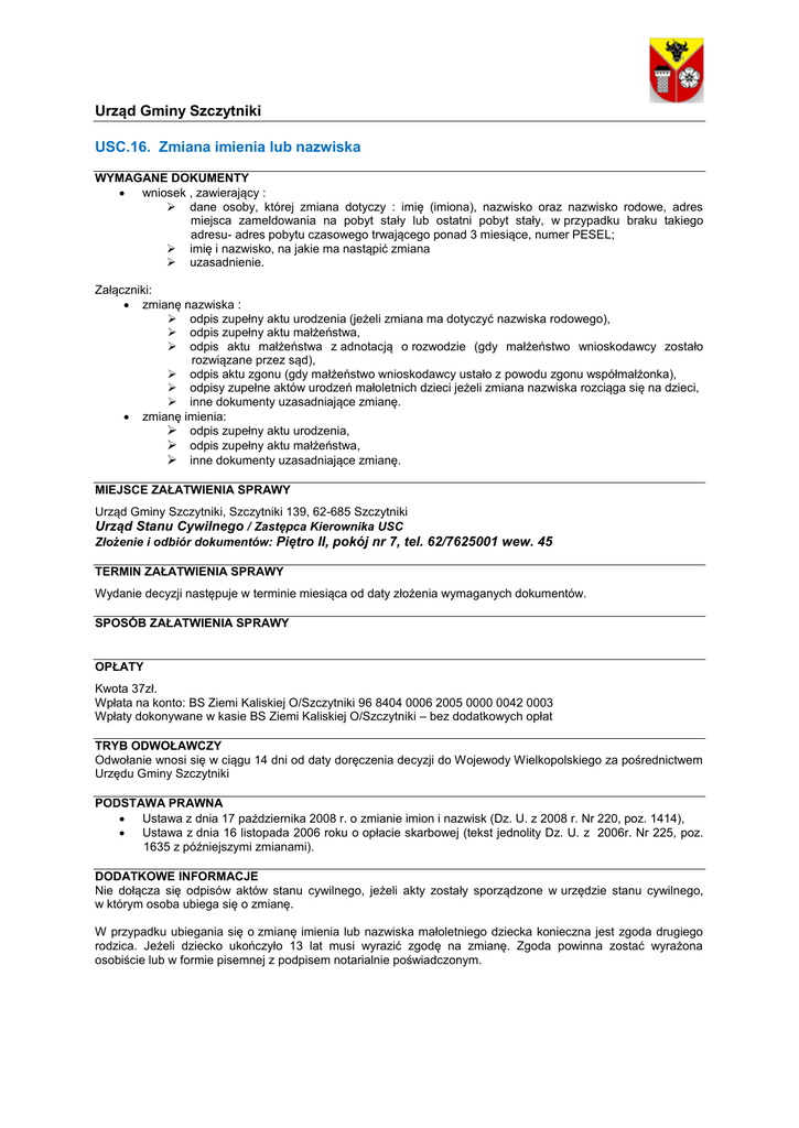 Urząd Gminy Szczytniki USC.16. Zmiana imienia lub nazwiska