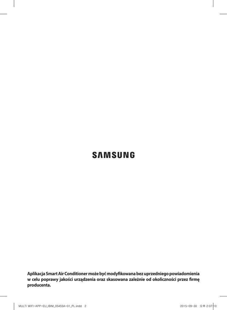 Aplikacja Smart Air Conditioner może być modyfikowana bez uprzedniego powiadomienia w celu poprawy jakości urządzenia oraz skasowana zależnie od okoliczności przez firmę producenta. MULTI WIFI-APP-EU_IBIM_05455A-01_PL.indd 2 2015-09-30 오후 2:07:10 Aplikacja Smart AC MIM-H03N Zestaw Multi Wi-Fi instrukcja obsługi i instalacji imagine the possibilities Dziękujemy za zakup produktu firmy Samsung. TR HU NL PL DB68-05455A-01 MULTI WIFI-APP-EU_IBIM_05455A-01_PL.indd 3 2015-09-30 오후 2:07:10 Produkt Smart Air Conditioner obsługuje usługę Samsung Smart Home. Spis streści Sprawdź przed instalacją zestawu Wi-Fi . . . . . . . . . . . . . . . . . . . . . . . . . . . . . . . . . . . . . . . . . . . . . . . . . . . . . . . . . . . . . . . . . . . . . . . . . . . . . . . . . . . . . . . . . 4 Elementy . . . . . . . . . . . . . . . . . . . . . . . . . . . . . . . . . . . . . . . . . . . . . . . . . . . . . . . . . . . . . . . . . . . . . . . . . . . . . . . . . . . . . . . . . . . . . . . . . . . . . . . . . . . . . . . . . . . . . . . 4 Wymiary zewnętrzne . . . . . . . . . . . . . . . . . . . . . . . . . . . . . . . . . . . . . . . . . . . . . . . . . . . . . . . . . . . . . . . . . . . . . . . . . . . . . . . . . . . . . . . . . . . . . . . . . . . . . . . . . . . 4 Jak zainstalować zestaw Wi-Fi? . . . . . . . . . . . . . . . . . . . . . . . . . . . . . . . . . . . . . . . . . . . . . . . . . . . . . . . . . . . . . . . . . . . . . . . . . . . . . . . . . . . . . . . . . . . . . . . . . 5 Instalacja zestawu Wi-Fi . . . . . . . . . . . . . . . . . . . . . . . . . . . . . . . . . . . . . . . . . . . . . . . . . . . . . . . . . . . . . . . . . . . . . . . . . . . . . . . . . . . . . . . . . . . . . . . . . . . . . . . . . 5 Ustawianie indywidualnego trybu pracy jednostki wewnętrznej . . . . . . . . . . . . . . . . . . . . . . . . . . . . . . . . . . . . . . . . . . . . . . . . . . . . . . . . . . . . . . . 10 Sprawdzanie zestawu Wi-Fi . . . . . . . . . . . . . . . . . . . . . . . . . . . . . . . . . . . . . . . . . . . . . . . . . . . . . . . . . . . . . . . . . . . . . . . . . . . . . . . . . . . . . . . . . . . . . . . . . . . . 12 Aktywacja danych użytkownika . . . . . . . . . . . . . . . . . . . . . . . . . . . . . . . . . . . . . . . . . . . . . . . . . . . . . . . . . . . . . . . . . . . . . . . . . . . . . . . . . . . . . . . . . . . . . . . 13 Aktualizowanie zestawu Wi-Fi za pomocą karty SD . . . . . . . . . . . . . . . . . . . . . . . . . . . . . . . . . . . . . . . . . . . . . . . . . . . . . . . . . . . . . . . . . . . . . . . . . . . . 13 Konfiguracja sieci . . . . . . . . . . . . . . . . . . . . . . . . . . . . . . . . . . . . . . . . . . . . . . . . . . . . . . . . . . . . . . . . . . . . . . . . . . . . . . . . . . . . . . . . . . . . . . . . . . . . . . . . . . . . . 14 Specyfikacja routera przewodowego/bezprzewodowego do użytku z klimatyzatorem Smart Air Conditioner firmy Samsung . . . 14 Uruchamianie aplikacji Samsung Smart Home . . . . . . . . . . . . . . . . . . . . . . . . . . . . . . . . . . . . . . . . . . . . . . . . . . . . . . . . . . . . . . . . . . . . . . . . . . . . . . . . . 15 Pobieranie aplikacji Samsung Smart Home . . . . . . . . . . . . . . . . . . . . . . . . . . . . . . . . . . . . . . . . . . . . . . . . . . . . . . . . . . . . . . . . . . . . . . . . . . . . . . . . . . . . 15 Włączanie aplikacji Samsung Smart Home . . . . . . . . . . . . . . . . . . . . . . . . . . . . . . . . . . . . . . . . . . . . . . . . . . . . . . . . . . . . . . . . . . . . . . . . . . . . . . . . . . . . . 16 Rejestracja produktu . . . . . . . . . . . . . . . . . . . . . . . . . . . . . . . . . . . . . . . . . . . . . . . . . . . . . . . . . . . . . . . . . . . . . . . . . . . . . . . . . . . . . . . . . . . . . . . . . . . . . . . . . . 17 Opis ekranów i głównych funkcji . . . . . . . . . . . . . . . . . . . . . . . . . . . . . . . . . . . . . . . . . . . . . . . . . . . . . . . . . . . . . . . . . . . . . . . . . . . . . . . . . . . . . . . . . . . . . . 19 Uruchamianie aplikacji System Air Conditioner . . . . . . . . . . . . . . . . . . . . . . . . . . . . . . . . . . . . . . . . . . . . . . . . . . . . . . . . . . . . . . . . . . . . . . . . . . . . . . . . 22 Sterowanie urządzeniem w aplikacji Samsung Smart Home . . . . . . . . . . . . . . . . . . . . . . . . . . . . . . . . . . . . . . . . . . . . . . . . . . . . . . . . . . . . . . . . . . . 22 Ekran z listą jednostek wewnętrznych . . . . . . . . . . . . . . . . . . . . . . . . . . . . . . . . . . . . . . . . . . . . . . . . . . . . . . . . . . . . . . . . . . . . . . . . . . . . . . . . . . . . . . . . . 23 Ekran sterowania . . . . . . . . . . . . . . . . . . . . . . . . . . . . . . . . . . . . . . . . . . . . . . . . . . . . . . . . . . . . . . . . . . . . . . . . . . . . . . . . . . . . . . . . . . . . . . . . . . . . . . . . . . . . . . 25 Konfiguracja grupy . . . . . . . . . . . . . . . . . . . . . . . . . . . . . . . . . . . . . . . . . . . . . . . . . . . . . . . . . . . . . . . . . . . . . . . . . . . . . . . . . . . . . . . . . . . . . . . . . . . . . . . . . . . . 27 Edycja listy jednostek wewnętrznych . . . . . . . . . . . . . . . . . . . . . . . . . . . . . . . . . . . . . . . . . . . . . . . . . . . . . . . . . . . . . . . . . . . . . . . . . . . . . . . . . . . . . . . . . . 30 Harmonogram . . . . . . . . . . . . . . . . . . . . . . . . . . . . . . . . . . . . . . . . . . . . . . . . . . . . . . . . . . . . . . . . . . . . . . . . . . . . . . . . . . . . . . . . . . . . . . . . . . . . . . . . . . . . . . . . 31 Monitorowanie zużycia energii . . . . . . . . . . . . . . . . . . . . . . . . . . . . . . . . . . . . . . . . . . . . . . . . . . . . . . . . . . . . . . . . . . . . . . . . . . . . . . . . . . . . . . . . . . . . . . . . 33 Settings (Ustawienia) . . . . . . . . . . . . . . . . . . . . . . . . . . . . . . . . . . . . . . . . . . . . . . . . . . . . . . . . . . . . . . . . . .