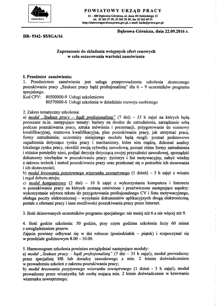 POWIATOWY URZĄD PRACY 41 - 300 Dąbrowa Górnicza, ul. Jana III Sobieskiego 12 tel. 32 262 37 39,32 262 29 39; fax 32 262 69 51 http://dabrowagornicza.praca.gov.pl, e-mail: [email protected] Dąbrowa Górnicza, dnia 22.09.2016 r. DR- 9342- 85/IGA/16 Zaproszenie do składania wstępnych ofert cenowych w celu oszacowania wartości zamówienia I. Przedmiot zamówienia: 1. Przedmiotem zamówienia jest usługa przeprowadzenia szkolenia skutecznego poszukiwania pracy „Szukasz pracy bądź profesjonalistą” dla 6 - 9 uczestników programu specjalnego. Kod CPV: 80500000-9 Usługi szkoleniowe 80570000-0 Usługi szkolenia w dziedzinie rozwoju osobistego 2. Zakres tematyczny szkolenia: a) moduł „Szukasz pracy - bądź profesjonalistą” (7 dni) - 35 h zajęć na których będą poruszane m.in. następujące tematy: bariery na drodze do zatrudnienia, zarządzanie sobą podczas poszukiwania pracy, sztuka mówienia i prezentacji, przygotowanie do rozmowy kwalifikacyjnej, rozmowa kwalifikacyjna, plan poszukiwania pracy, jak utrzymać pracę, formy zatrudnienia; uczestnicy niniejszego modułu będą mogli: poznać podstawowe zagadnienia dotyczące rynku pracy i mechanizmy, które nim rządzą, dokonać analizy lokalnego rynku pracy, określić swoją sylwetkę zawodową, poznać różne formy zatrudnienia i różnice pomiędzy nimi, podjąć decyzję dotyczącą swojej przyszłości zawodowej, sporządzić dokumenty niezbędne w poszukiwaniu pracy: życiorys i list motywacyjny, nabyć wiedzę z zakresu technik i metod poszukiwania praży oraz przekonać się o potrzebie ich stosowania i ich skuteczności; b) moduł kreowania pozytywnego wizerunku zewnętrznego (1 dzień) —5 h zajęć z wizażu i reguł doboru stroju; c) moduł komputerowy (2 dni) - 10 h zajęć z wykorzystania komputera i Internetu w poszukiwaniu pracy na których zostaną omówione i przećwiczone następujące aspekty: wykorzystanie edytora tekstu do przygotowania profesjonalnego CV i listu motywacyjnego, obsługa poczty elektronicznej - wysyłanie dokumentów aplikacyjnych drogą elektroniczną, portale z ofertami pracy i inne możliwości poszukiwania pracy przez Internet. 3. Ilość skierowanych uczestników programu specjalnego: nie mniej niż 6 a nie więcej niż 9. 4. Ilość godzin szkolenia: 50 godzin, przy czym godzina szkolenia liczy 60 minut z uwzględnieniem przerw. Zajęcia powinny odbywać się w dni robocze (poniedziałek - piątek) i rozpoczynać się w przedziale godzinowym 8.00 - 10.00. 5. Harmonogram szkolenia powinien uwzględniać następujące moduły: a) moduł „Szukasz pracy - bądź profesjonalistą” (7 dni - 35 h zajęć), moduł prowadzony przez specjalistę HR lub doradcę zawodowego z min. 2 letnim doświadczeniem w prowadzeniu szkoleń z zakresu poszukiwania pracy; b) moduł kreowania pozytywnego wizerunku zewnętrznego (1 dzień - 5 h zajęć), moduł prowadzony przez wizażystkę lub osobę mającą min. 2 letnie doświadczenie w kreowaniu wizerunku zewnętrznego; c) moduł komputerowy (2 dni - 10 h zajęć), moduł prowadzony przez osobę mającą min. 2 letnie doświadczenie w prowadzeniu szkoleń z podstaw obsługi komputera i Internetu. 6. Miejsce organizacji szkolenia: Dąbrowa Górnicza dzielnica Centrum. 7. Wykonawca zobowiązany będzie: 1) zapewnienia uczestnikom szkolenia w trakcie jego trwania warunków pracy zgodnych z przepisami bezpieczeństwa i higieny pracy; 2) zorganizowania zajęć w sali, o wielkości dostosowanej do liczby skierowanych uczestników. Sala musi być odpowiednio wyposażona w miejsca siedzące dla 6 - 9 uczestników, twarde blaty lub stoły/ławki umożliwiające im wygodne notowanie, 6 - 9 indywidualnych stanowisk komputerowych posiadających dostęp do Internetu, dostęp do światła dziennego z możliwością zaciemnienia i zapewnienia oświetlenia sztucznego oraz dostęp do zaplecza sanitarnego, ponadto sale muszą być wyposażone w niezbędne pomoce dydaktyczne, w tym sprzęt audiowizualny i flipchart z kompletem stosownych przyborów piśmienniczych; 3) zapewnienia uczestniczkom koniecznych materiałów szkoleniowych + notes + długopis. Materiały szkoleniowe + notes + długopis powinny być przekazane uczestniczkom w pierwszym dniu szkolenia; 4) zapewnienia cateringu dla każdego uczestnika szkolenia w ilości zapewniającej dostęp do niego przez cały okres trwania szkolenia. Dzienny catering obejmuje: dobrej jakości kawę, herbatę wraz z dodatkami - cukier, mleczko, mleko, cytryna, drobne art. spożywcze np. paluszki, krakersy, kruche ciasteczka, babeczki, rurki w ilości min. 100 gr. na osobę każdego dnia szkolenia, zimne napoje np. woda mineralna niegazowana, soki; 5) przygotowania harmonogramu szkolenia i dostarczenia go do Zamawiającego, 6) natychmiastowego powiadomienia telefonicznie oraz na piśmie Zamawiającego 0 zmianach harmonogramu w przypadku ich wystąpienia, 7) do indywidualizacji procesu szkolenia poprzez prowadzenie systematycznej oceny postępów uczestników i udzielania im pomocy jeśli okaże się potrzebna z uwagi na trudności w nauce; 8) przekazania potwierdzenia uczestnictwa w szkoleniu na dokumencie zwanym imiennym wykazem osób, w ciągu 2 dni od daty jego rozpoczęcia; 9) bieżącego (maksymalnie w ciągu 1 dnia) informowania Zamawiającego o: a) rezygnacji z uczestnictwa w szkoleniu w trakcie jego trwania, b) nieobecności na zajęciach szkoleniowych, c) wszelkich problemach związanych z realizacją niniejszego zamówienia, 10) ubezpieczenia uczestników szkolenia od następstw nieszczęśliwych wypadków wskazanych przez Zamawiającego (na imiennym wykazie osób) a także uczestników, którzy w trakcie szkolenia podejmą zatrudnienie, inną pracę zarobkową lub działalność gospodarczą, od dnia podjęcia zatrudnienia, innej pracy zarobkowej lub działalność gospodarczej do dnia zakończenia szkolenia. Koszty ww. ubezpieczenia pokrywa Zamawiający na podstawie odrębnie wystawionej faktury; 11) wystawie