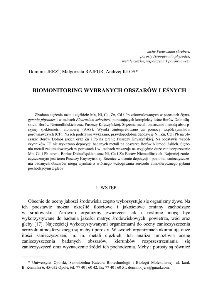 mchy Pleurozium shreberi, porosty Hypogymnia physodes, metale ciężkie, współczynnik porównawczy Dominik JERZ1, Małgorzata RAJFUR, Andrzej KŁOS* BIOMONITORING WYBRANYCH OBSZARÓW LEŚNYCH Zbadano stężenia metali ciężkich: Mn, Ni, Cu, Zn, Cd i Pb zakumulowanych w porostach Hypogymnia physodes i w mchach Pleurozium schreberi, porastających kompleksy leśne Borów Dolnośląskich, Borów Niemodlińskich oraz Puszczy Knyszyńskiej. Stężenia metali oznaczano metodą absorpcyjnej spektometrii atomowej (AAS). Wyniki zinterpretowano za pomocą współczynników porównawczych (CF). Na ich podstawie wykazano, prawdopodobną depozycję Ni, Zn, Cd i Pb na obszarze Borów Dolnośląskich oraz Zn i Pb na terenie Puszczy Knyszyńskiej. Na podstawie współczynników CF nie wykazano depozycji badanych metali na obszarze Borów Niemodlińskich. Stężenia metali zakumulowanych w porostach i w mchach wskazują na względnie duże zanieczyszczenie Mn, Cd i Pb terenu Borów Dolnośląskich oraz Ni, Cu i Zn Borów Niemodlińskich. Najmniej zanieczyszczonym jest teren Puszczy Knyszyńskiej. Różnice w ocenie depozycji i poziomu zanieczyszczenia badanych obszarów mogą wynikać z wtórnego wzbogacania aerozolu atmosferycznego pyłami pochodzącymi z gleby. 1. WSTĘP Obecnie do oceny jakości środowiska często wykorzystuje się organizmy żywe. Na ich podstawie można określić ilościowe i jakościowe zmiany zachodzące w środowisku. Zarówno organizmy zwierzęce jak i roślinne mogą być wykorzystywane do badania jakości matryc środowiskowych: powietrza, wód oraz gleby [17]. Najczęściej wykorzystywanymi organizmami do oceny zanieczyszczenia aerozolu atmosferycznego są mchy i porosty. W swoich organizmach akumulują duże ilości zanieczyszczeń, m. in. metali ciężkich. Ich analiza umożliwia ocenę zanieczyszczenia badanych obszarów, kierunków rozprzestrzeniania się zanieczyszczeń oraz wyznaczenie źródeł ich pochodzenia. Mchy i porosty są również __________ * Uniwersytet Opolski, Samodzielna Katedra Biotechnologii i Biologii Molekularnej, ul. kard. B. Kominka 6, 45-032 Opole, tel. 77 401 60 42, fax 77 401 60 51, [email protected]. D. JERZ i in. 165 wykorzystywane do oceny zanieczyszczenia środowiska wielopierścieniowymi węglowodorami aromatycznymi [2] oraz radionuklidami [8]. Jednymi z pierwszych, którzy wykorzystali mchy do oceny zanieczyszczenia środowiska metalami ciężkimi byli Rüchling i Tyler [15]. Obecnie mchy i porosty wykorzystywane są na szeroką skalę w biomonitoringu aktywnym i pasywnym ekosystemów leśnych, terenów rolniczych oraz terenów zurbanizowanych. Biomonitoring aktywny polega na ekspozycji, najczęściej na mocno zanieczyszczonych terenach przemysłowych lub miejskich, próbek pobranych z terenów niezanieczyszczonych. Po ściśle określonym czasie w eksponowanych próbkach oznaczane są przyrosty stężeń zanieczyszczeń. Biomonitoring pasywny polega na analizie składu chemicznego próbek pobranych do badań w miejscu ich wegetacji. Takie badania prowadzone są w wielu krajach europejskich [4] oraz w Polsce, m. in. na obszarze Borów Stobrawskich [7]. Celem badań przedstawionych w tym artykule była ocena zanieczyszczenia obszaru Borów Dolnośląskich, Borów Niemodlińskich oraz Puszczy Knyszyńskiej wybranymi metalami ciężkimi: Mn, Ni, Cu, Zn, Cd i Pb. Do badań wykorzystano porosty Hypogymnia physodes i mchy Pleurozium schreberi pobrane w ich naturalnym środowisku. Wyniki zinterpretowano poprzez wyznaczenie współczynników porównawczy CF, wskazujących na możliwą, bieżącą depozycję zanieczyszczeń [7]. 2. CHARAKTERYSTYKA OBSZARU BADAŃ Badania prowadzone były na terenie Borów Dolnośląskich, Borów Niemodlińskich oraz Puszczy Knyszyńskiej. Bory Dolnośląskie są jednym z największych kompleksów leśnych w Polsce, zajmują powierzchnię 172 tys. ha. Większość obszaru Borów Dolnośląskich to tereny równinne, mało zróżnicowane pod względem morfologicznym. W Borach Dolnośląskich dominującym gatunkiem jest sosna. W runie leśnym występuje borówka i wrzos natomiast, w podszyciu występuje żarnowiec oraz jałowiec. Bory Dolnośląskie są pod wpływem emisji niskiej ze źródeł lokalnych oraz emisji odległej, pochodzącej m. in. z Legnicko-Głogowskiego Okręgu Miedziowego oraz z kopalni węgla brunatnego i elektrowni znajdującej się na obszarze obniżenia Żytawsko-Zgorzeleckiego. Oprócz tego w południowej części Borów Dolnośląskich znajduje się duży węzeł kolejowy natomiast w północnej części Borów Dolnośląskich działają poligony wojskowe, które powstały już na przełomie XIX i XX w. [1]. Bory Niemodlińskie jest to kompleks leśny o powierzchni 5 tys. ha znajdujący się na terenie wysoczyzny polodowcowej poprzecinanej dolinami rzecznymi Odry, Nysy Kłodzkiej i Ścinawy Niemodlińskiej. Drzewostan to głównie lasy gospodarcze z fragmentami lasów naturalnych. Gatunki dominujące to sosna oraz świerk. 166 Biomonitoring wybranych obszarów leśnych W sąsiedztwie Borów Niemodlińskich zlokalizowane są miasta: Opole oraz Nysa [14]. Puszcza Knyszyńska jest to kompleks leśny znajdujący się w północno-wschodniej części Polski, znajdujący się w granicach mezoregionu fizyko-geograficznego Wysoczyzny Białostockiej. Jest to teren nizinny. Dominującym typem gleb są gleby rdzawe oraz gleby bielicowe. W drzewostanie dominującymi rodzajami są bór mieszany świeży i las mieszany świeży. Na wschód od Puszczy Knyszyńskiej znajduje się miasto Białystok [18]. 3. METODYKA BADAWCZA Próbki porostów Hypogymnia physodes oraz mchów Pleurozium shreberi, pobierane były z 20 miejsc na terenie Borów Dolnośląskich (rys. 1), 10 miejsc na terenie Borów Niemodlińskich (rys. 2) oraz 14 miejsc na terenie Puszczy Knyszyńskiej (rys. 3). Próbki zbierane na terenie Puszczy Knyszyńskiej pobierane były w ramach grantu: Ecosystem stress from the combined effects of Winter c