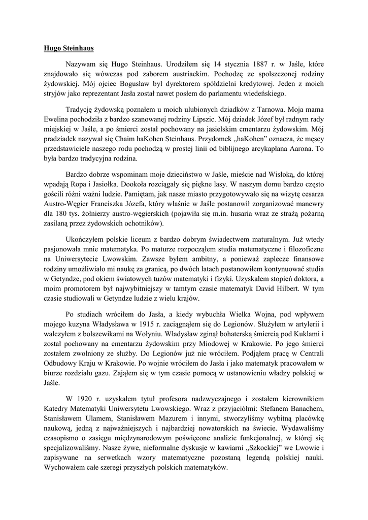 Hugo Steinhaus Nazywam się Hugo Steinhaus. Urodziłem się 14 stycznia 1887 r. w Jaśle, które znajdowało się wówczas pod zaborem austriackim. Pochodzę ze spolszczonej rodziny żydowskiej. Mój ojciec Bogusław był dyrektorem spółdzielni kredytowej. Jeden z moich stryjów jako reprezentant Jasła został nawet posłem do parlamentu wiedeńskiego. Tradycję żydowską poznałem u moich ulubionych dziadków z Tarnowa. Moja mama Ewelina pochodziła z bardzo szanowanej rodziny Lipszic. Mój dziadek Józef był radnym rady miejskiej w Jaśle, a po śmierci został pochowany na jasielskim cmentarzu żydowskim. Mój pradziadek nazywał się Chaim haKohen Steinhaus. Przydomek „haKohen” oznacza, że męscy przedstawiciele naszego rodu pochodzą w prostej linii od biblijnego arcykapłana Aarona. To była bardzo tradycyjna rodzina. Bardzo dobrze wspominam moje dzieciństwo w Jaśle, mieście nad Wisłoką, do której wpadają Ropa i Jasiołka. Dookoła rozciągały się piękne lasy. W naszym domu bardzo często gościli różni ważni ludzie. Pamiętam, jak nasze miasto przygotowywało się na wizytę cesarza Austro-Węgier Franciszka Józefa, który właśnie w Jaśle postanowił zorganizować manewry dla 180 tys. żołnierzy austro-węgierskich (pojawiła się m.in. husaria wraz ze strażą pożarną zasilaną przez żydowskich ochotników). Ukończyłem polskie liceum z bardzo dobrym świadectwem maturalnym. Już wtedy pasjonowała mnie matematyka. Po maturze rozpocząłem studia matematyczne i filozoficzne na Uniwersytecie Lwowskim. Zawsze byłem ambitny, a ponieważ zaplecze finansowe rodziny umożliwiało mi naukę za granicą, po dwóch latach postanowiłem kontynuować studia w Getyndze, pod okiem światowych tuzów matematyki i fizyki. Uzyskałem stopień doktora, a moim promotorem był najwybitniejszy w tamtym czasie matematyk David Hilbert. W tym czasie studiowali w Getyndze ludzie z wielu krajów. Po studiach wróciłem do Jasła, a kiedy wybuchła Wielka Wojna, pod wpływem mojego kuzyna Władysława w 1915 r. zaciągnąłem się do Legionów. Służyłem w artylerii i walczyłem z bolszewikami na Wołyniu. Władysław zginął bohaterską śmiercią pod Kuklami i został pochowany na cmentarzu żydowskim przy Miodowej w Krakowie. Po jego śmierci zostałem zwolniony ze służby. Do Legionów już nie wróciłem. Podjąłem pracę w Centrali Odbudowy Kraju w Krakowie. Po wojnie wróciłem do Jasła i jako matematyk pracowałem w biurze rozdziału gazu. Zająłem się w tym czasie pomocą w ustanowieniu władzy polskiej w Jaśle. W 1920 r. uzyskałem tytuł profesora nadzwyczajnego i zostałem kierownikiem Katedry Matematyki Uniwersytetu Lwowskiego. Wraz z przyjaciółmi: Stefanem Banachem, Stanisławem Ulamem, Stanisławem Mazurem i innymi, stworzyliśmy wybitną placówkę naukową, jedną z najważniejszych i najbardziej nowatorskich na świecie. Wydawaliśmy czasopismo o zasięgu międzynarodowym poświęcone analizie funkcjonalnej, w której się specjalizowaliśmy. Nasze żywe, nieformalne dyskusje w kawiarni „Szkockiej” we Lwowie i zapisywane na serwetkach wzory matematyczne pozostaną legendą polskiej nauki. Wychowałem całe szeregi przyszłych polskich matematyków. Atmosfera panująca w tym czasie w naszym zespole składającym się z Polaków, Żydów i Ukraińców była wyjątkowa. Bezsprzecznie czas pracy na Uniwersytecie Lwowskim to dla mnie najpiękniejszy okres mojego życia. Niestety, stosunki panujące w mieście nie były już tak dobre. Dochodziło do wystąpień skrajnych polskich ugrupowań politycznych, które