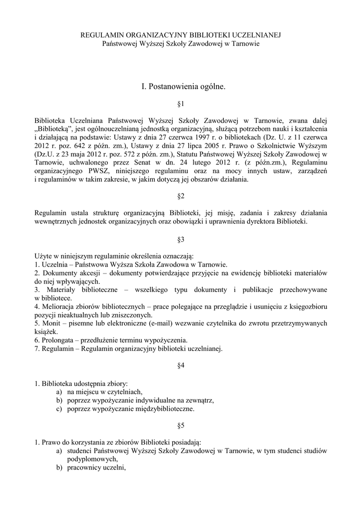 REGULAMIN ORGANIZACYJNY BIBLIOTEKI UCZELNIANEJ Państwowej Wyższej Szkoły Zawodowej w Tarnowie I. Postanowienia ogólne. §1 Biblioteka Uczelniana Państwowej Wyższej Szkoły Zawodowej w Tarnowie, zwana dalej „Biblioteką”, jest ogólnouczelnianą jednostką organizacyjną, służącą potrzebom nauki i kształcenia i działającą na podstawie: Ustawy z dnia 27 czerwca 1997 r. o bibliotekach (Dz. U. z 11 czerwca 2012 r. poz. 642 z późn. zm.), Ustawy z dnia 27 lipca 2005 r. Prawo o Szkolnictwie Wyższym (Dz.U. z 23 maja 2012 r. poz. 572 z późn. zm.), Statutu Państwowej Wyższej Szkoły Zawodowej w Tarnowie, uchwalonego przez Senat w dn. 24 lutego 2012 r. (z późn.zm.), Regulaminu organizacyjnego PWSZ, niniejszego regulaminu oraz na mocy innych ustaw, zarządzeń i regulaminów w takim zakresie, w jakim dotyczą jej obszarów działania. §2 Regulamin ustala strukturę organizacyjną Biblioteki, jej misję, zadania i zakresy działania wewnętrznych jednostek organizacyjnych oraz obowiązki i uprawnienia dyrektora Biblioteki. §3 Użyte w niniejszym regulaminie określenia oznaczają: 1. Uczelnia – Państwowa Wyższa Szkoła Zawodowa w Tarnowie. 2. Dokumenty akcesji – dokumenty potwierdzające przyjęcie na ewidencję biblioteki materiałów do niej wpływających. 3. Materiały biblioteczne – wszelkiego typu dokumenty i publikacje przechowywane w bibliotece. 4. Melioracja zbiorów bibliotecznych – prace polegające na przeglądzie i usunięciu z księgozbioru pozycji nieaktualnych lub zniszczonych. 5. Monit – pisemne lub elektroniczne (e-mail) wezwanie czytelnika do zwrotu przetrzymywanych książek. 6. Prolongata – przedłużenie terminu wypożyczenia. 7. Regulamin – Regulamin organizacyjny biblioteki uczelnianej. §4 1. Biblioteka udostępnia zbiory: a) na miejscu w czytelniach, b) poprzez wypożyczanie indywidualne na zewnątrz, c) poprzez wypożyczanie międzybiblioteczne. §5 1. Prawo do korzystania ze zbiorów Biblioteki posiadają: a) studenci Państwowej Wyższej Szkoły Zawodowej w Tarnowie, w tym studenci studiów podyplomowych, b) pracownicy uczelni, c) pozostałe osoby niebędące pracownikami, doktorantami lub studentami uczelni – z zastrzeżeniem pkt. 2, 2. Osoby wymienione w pkt. 1 ust. c mogą korzystać ze zbiorów i usług Biblioteki w Czytelni Głównej, w Czytelni Czasopism oraz w Ośrodku Dokumentacji i Informacji Naukowej. §6 Korzystający ze zbiorów są zobowiązani do przestrzegania regulaminu Biblioteki, poszanowania udostępnionych im materiałów bibliotecznych, pomieszczeń oraz wyposażenia Biblioteki. Użytkownicy Biblioteki ponoszą odpowiedzialność materialną za stan powierzonych im materiałów bibliotecznych oraz są zobowiązani do zgłaszania zauważonych braków i uszkodzeń w wypożyczanych dokumentach. II. Misja i zadania Biblioteki §7 Misją Biblioteki jest wspieranie procesu dydaktycznego oraz badań naukowych prowadzonych w uczelni poprzez zapewnienie dostępu do materiałów bibliotecznych oraz źródeł informacji naukowej i technicznej, niezbędnych do realizacji tych celów, a także zaspokajanie potrzeb informacyjno-edukacyjnych użytkowników biblioteki. §8 1. Misja Biblioteki jest wypełniana poprzez realizację następujących zadań: a) prowadzenie właściwej polityki gromadzenia i uzupełniania księgozbioru, zapewniającej dostęp do niezbędnych podręczników, literatury fachowej i naukowej oraz nowości wydawniczych, b) opracowanie, klasyfikację, magazynowanie i konserwację materiałów bibliotecznych, c) udostępnianie zbiorów bibliotecznych na miejscu i na zewnątrz, d) zapewnianie aktualnej informacji bibliograficznej o zbiorach własnych i innych bibliotek, e) udostępnianie bieżącej informacji naukowej poprzez dostęp do czasopism i innych wydawnictw ciągłych, f) prowadzenie wypożyczeń międzybibliotecznych, g) szkolenie użytkowników w zakresie umiejętności korzystania z systemu bibliotecznoinformacyjnego uczelni oraz efektywnego wyszukiwania informacji, h) promocję Biblioteki w środowisku uczelnianym i lokalnym, i) organizowanie wystaw okolicznościowych, j) badanie potrzeb użytkowników oraz modernizację form i metod pracy bibliotecznej w celu doskonalenia i rozwijania oferowanych usług, k) wspieranie projektów naukowo-badawczych realizowanych w uczelni. III. Struktura organizacyjna §9 Strukturę organizacyjną Biblioteki tworzą: 1. Dział Gromadzenia i Opracowania Księgozbioru. 2. Dział Udostępniania Księgozbioru, w skład którego wchodzą: a) Wypożyczalnia, b) Czytelnia główna, c) Czytelnia czasopism, d) Czytelnia komputerowa, e) Wypożyczalnia międzybiblioteczna. 3. Ośrodek Dokumentacji i Informacji Naukowej. §10 1. Biblioteką kieruje dyrektor, który jest bezpośrednim przełożonym pracowników. Dyrektor jest odpowiedzialny za prawidłowe funkcjonowanie Biblioteki, w tym przede wszystkim: a) planuje, organizuje oraz nadzoruje pracę Biblioteki w porozumieniu z władzami uczelni, b) kieruje polityką gromadzenia i uzupełniania księgozbioru, c) ustala szczegółowe zakresy czynności poszczególnych pracowników, d) przygotowuje sprawozdania z działalności Biblioteki i przedstawia je radzie bibliotecznej, e) powołuje wewnętrzne komisje stałe lub doraźne, f) dokonuje selekcji i zatwierdza wycenę materiałów bibliotecznych wpływających w formie darów, g) wnioskuje w kwestii zatrudnienia, awansowania, nagradzania podległych mu pracowników, h) opracowuje regulaminy i instrukcje biblioteczne, i) sprawuje nadzór nad inwentaryzacją i melioracją zbiorów bibliotecznych, j) dba, wraz z wyznaczonym informatykiem, o prawidłowe funkcjonowanie komputerowego systemu bibliotecznego. 2. W czasie nieobecności dyrektora Biblioteką kieruje wyznaczony przez władze uczelni zastępca. Zastępca odpowiada za całość działań Biblioteki w okresie zastępstwa. §11 1. Dział Gromadzenia i Opracowania Księgozbioru realizuje następujące zadania: a) wyko