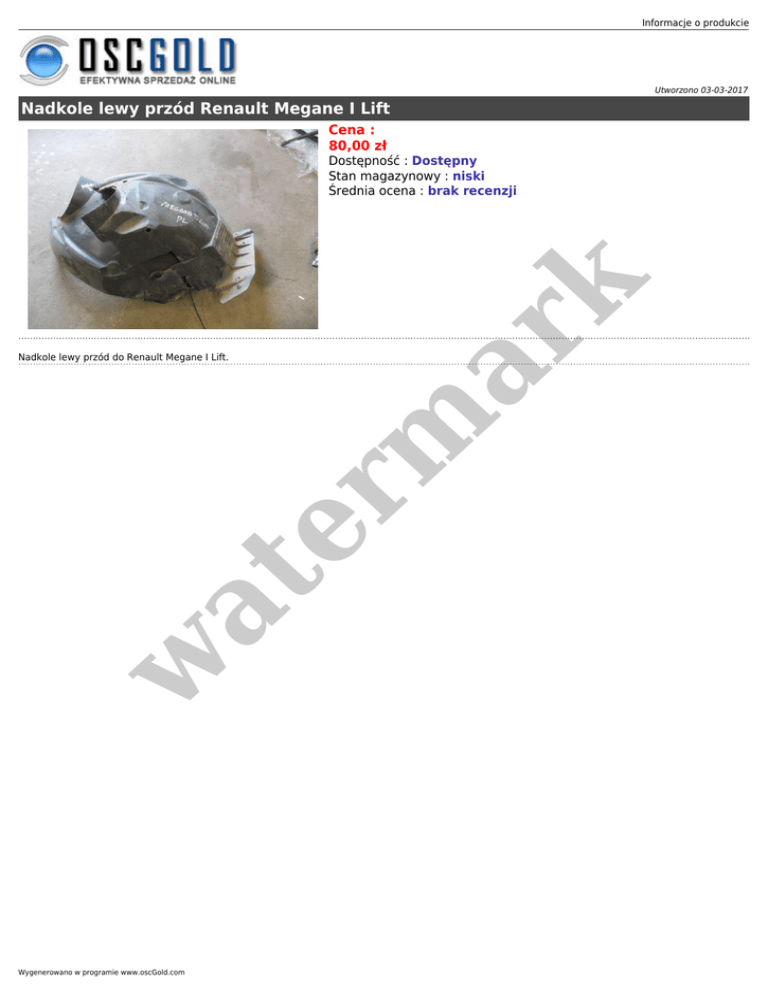 Informacje o produkcie Utworzono 03-03-2017 Nadkole lewy przód Renault Megane I Lift Cena : 80,00 zł er m ar k Dostępność : Dostępny Stan magazynowy : niski Średnia ocena : brak recenzji w at Nadkole lewy przód do Renault Megane I Lift. Wygenerowano w programie www.oscGold.com