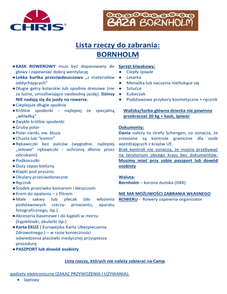 Lista rzeczy do zabrania: BORNHOLM ● KASK ROWEROWY musi być dopasowany do głowy i zapewniać dobrą wentylację ● Lekka kurtka przeciwdeszczowa „z materiałów oddychających” ● Długie getry kolarskie lub spodnie dresowe (nie za luźne, umożliwiające swobodną jazdę). Dżinsy NIE nadają się do jazdy na rowerze. ● Cieplejsze długie spodnie ● Krótkie spodenki - najlepiej ze specjalną „wkładką” ● Zwykłe krótkie spodenki ● Gruby polar ● Polar cienki, ew. bluza ● Chusta lub “komin” ● Rękawiczki bez palców (wygodne, najlepiej „żelowe” rękawiczki - ochronią dłonie przez odciskami) ● Podkoszulki ● Duży zapas bielizny ● Klapki pod prysznic ● Okulary przeciwsłoneczne ● Ręcznik ● Środek przeciwko komarom i kleszczom ● Krem do opalania – z filtrem ● Małe sakwy lub plecak (do włożenia podstawowych rzeczy- prowiantu, aparatu fotograficznego, itp.) ● Akcesoria basenowe i do kąpieli w morzu (kąpielówki, okularki itp.) ● Karta EKUZ ( Europejska Karta Ubezpieczenia Zdrowotnego ) – w razie konieczności odwiedzenia placówki medycznej przyspiesza procedurę ● PASZPORT lub dowód osobisty Sprzęt biwakowy: ● Ciepły śpiwór ● Latarka ● Menażka lub naczynia nietłukące się ● Sztućce ● Kubeczek ● Podstawowe przybory kosmetyczne + ręcznik Walizka/torba główna dziecka nie powinna przekraczać 20 kg + kask, śpiwór Dokumenty: Dania należy to strefy Schengen, co oznacza, że zniesione są kontrole graniczne dla osób wjeżdżających z krajów UE. Brak kontroli nie oznacza, że można przebywać na terytorium obcego kraju bez dokumentów. Musimy mieć przy sobie paszport lub dowód osobisty Waluta: Bornholm – korona duńska (DKK) NIE MA MOŻLIWOŚCI ZABRANIA WŁASNEGO ROWERU - Rowery zapewnia organizator Lista rzeczy, których nie należy zabierać na Camp gadżety elektroniczne (ZAKAZ PRZYWOŻENIA I UŻYWANIA): laptopy tablety psp konsole inne gry elektroniczne zbędne sprzęty elektryczne (wszystkie rzeczy z tej grupy wchodzą w zakres przedmiotów zakazanych z powodu przepisów PPOŻ) np. prostownice, lokówki, grzałki, czajniki, przedłużacze ( przeciążenie linii elektrycznych, zagrożenie pożarowe) inne zbędne przedmioty wartościowe np. duże kwoty gotówki, karty do bankomatów inne: scyzoryki, inne ostre narzędzia chipsy, napoje gazowane Prosimy też o niezabieranie jedzenia w proszku (zupek, budyniów, dań do zalewania wrzątkiem). Baza ma do dyspozycji kuchnię, w której przygotowujemy jedzenie dla wszystkich dzieci i kadry. Nikt nie jest głodny i nie ma potrzeby zabierania dodatkowego jedzenia (poza szczególnymi przypadkami specyficznej diety wynikającej z zaleceń zdrowotnych. Takie przypadki prosimy zgłaszać kierownikowi przed rozpoczęciem obozu.) * Prosimy aby dzieci brały udział w pakowaniu swoich rzeczy co ułatwia zidentyfikowanie pozostawionych rzeczy podczas trwania obozu. ** Szczególnie przy młodszych dzieciach prosimy o podpisywanie rzeczy, co zmniejsza ryzyko zagubienia. UWAGA! Na obóz przyjmowane są dzieci zdrowe. Jeśli dziecko w dniu wyjazdu jest chore (ma gorączkę, przyjmuje leki) prosimy o dowóz dziecka kilka dni później. Prosimy również o sprawdzenie głowy dziecka pod kątem wszawicy. To pozwoli na uniknięcie rozprzestrzeniania się chorób zakaźnych i wszy wśród innych uczestników. Adres bazy: Dueodde Familecamping & Hostel Skrokkegårdsvejen 17, Dueodde, Bornholm, Dania Kontakt z dzieckiem: telefoniczny - najlepiej po obiedzie lub pół godziny przed ciszą nocną (cisza nocna rozpoczyna się o godzinie 22.00). Numer telefonu do kontaktów z dzieckiem zostanie podany na naszej stronie pierwszego dnia obozu. Kondycja fizyczna: Przed planowaną wyprawą proponujemy przygotować odpowiednio organizm - zrobić kilka treningów w umiarkowanym tempie, pokonując odległości zbliżone do planowanych dystansów dziennych na wędrówkach. Najlepiej przygotowawcze wycieczki rowerowe realizować regularnie przez dłuższy okres zwiększając sukcesywnie pokonywany dystans, aż do docelowego. Odzież: Ubrania powinny być możliwie lekkie i szybkoschnące (tkaniny, które dobrze odprowadzają pot i zapewniają odpowiednią termoregulację). Kurtka przeciwdeszczowa powinna być jak najcieńsza - krój kurtki nie może utrudniać jazdy na rowerze, w pochylonej pozycji plecy powinny być zasłonięte. Na wyprawach najlepiej funkcjonuje ubieranie się 'na cebulę'- Założenie na siebie wszystkich warstw powinno zapewnić komfort termiczny w najtrudniejszych warunkach. Prosimy o nie zabieranie niepotrzebnego sprzętu elektronicznego ( gier itp.)