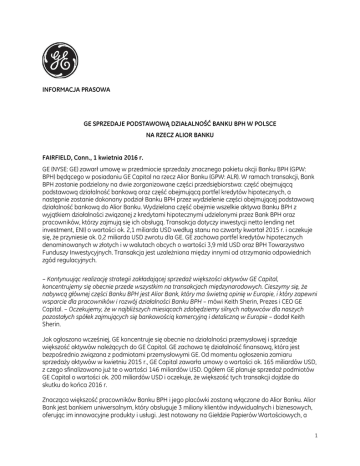 INFORMACJA PRASOWA GE SPRZEDAJE PODSTAWOWĄ DZIAŁALNOŚĆ BANKU BPH W POLSCE NA RZECZ ALIOR BANKU FAIRFIELD, Conn., 1 kwietnia 2016 r. GE (NYSE: GE) zawarł umowę w przedmiocie sprzedaży znacznego pakietu akcji Banku BPH (GPW: BPH) będącego w posiadaniu GE Capital na rzecz Alior Banku (GPW: ALR). W ramach transakcji, Bank BPH zostanie podzielony na dwie zorganizowane części przedsiębiorstwa: część obejmującą podstawową działalność bankową oraz część obejmującą portfel kredytów hipotecznych, a następnie zostanie dokonany podział Banku BPH przez wydzielenie części obejmującej podstawową działalność bankową do Alior Banku. Wydzielana część obejmie wszelkie aktywa Banku BPH z wyjątkiem działalności związanej z kredytami hipotecznymi udzielonymi przez Bank BPH oraz pracowników, którzy zajmują się ich obsługą. Transakcja dotyczy inwestycji netto (ending net investment, ENI) o wartości ok. 2,1 miliarda USD według stanu na czwarty kwartał 2015 r. i oczekuje się, że przyniesie ok. 0,2 miliarda USD zwrotu dla GE. GE zachowa portfel kredytów hipotecznych denominowanych w złotych i w walutach obcych o wartości 3,9 mld USD oraz BPH Towarzystwo Funduszy Inwestycyjnych. Transakcja jest uzależniona między innymi od otrzymania odpowiednich zgód regulacyjnych. – Kontynuując realizację strategii zakładającej sprzedaż większości aktywów GE Capital, koncentrujemy się obecnie przede wszystkim na transakcjach międzynarodowych. Cieszymy się, że nabywcą głównej części Banku BPH jest Alior Bank, który ma świetną opinię w Europie, i który zapewni wsparcie dla pracowników i rozwój działalności Banku BPH – mówi Keith Sherin, Prezes i CEO GE Capital. – Oczekujemy, że w najbliższych miesiącach zdobędziemy silnych nabywców dla naszych pozostałych spółek zajmujących się bankowością komercyjną i detaliczną w Europie – dodał Keith Sherin. Jak ogłoszono wcześniej, GE koncentruje się obecnie na działalności przemysłowej i sprzedaje większość aktywów należących do GE Capital. GE zachowa tę działalność finansową, która jest bezpośrednio związana z podmiotami przemysłowymi GE. Od momentu ogłoszenia zamiaru sprzedaży aktywów w kwietniu 2015 r., GE Capital zawarła umowy o wartości ok. 165 miliardów USD, z czego sfinalizowano już te o wartości 146 miliardów USD. Ogółem GE planuje sprzedaż podmiotów GE Capital o wartości ok. 200 miliardów USD i oczekuje, że większość tych transakcji dojdzie do skutku do końca 2016 r. Znacząca większość pracowników Banku BPH i jego placówki zostaną włączone do Alior Banku. Alior Bank jest bankiem uniwersalnym, który obsługuje 3 miliony klientów indywidualnych i biznesowych, oferując im innowacyjne produkty i usługi. Jest notowany na Giełdzie Papierów Wartościowych, a 1 25 proc. jego akcji posiada PZU, największy polski ubezpieczyciel. Transakcja, której zamknięcie jest oczekiwane w czwartym kwartale 2016 r., jest uwarunkowana od uzyskania zgody Komisji Nadzoru Finansowego i zgody antymonopolowej oraz emisji akcji Alior Banku z zachowaniem prawa poboru, a także uzgodnieniem planu podziału przez Bank BPH i Alior Bank. Informacja o GE GE (NYSE:GE) to światowa firma przemysłu cyfrowego, przekształcająca przemysł w oparciu o maszyny i rozwiązania wykorzystujące oprogramowanie, które umożliwia lepszą, szybszą i przewidywalną komunikację. GE funkcjonuje w oparciu o „GE Store” – globalny ośrodek wymiany wiedzy, dzięki któremu wszystkie działy firmy zyskują wzajemny dostęp do swoich technologii, rynków, struktur i doświadczenia. Każda innowacja zyskuje kolejne zastosowania w każdym z naszych przemysłowych sektorów. Dzięki naszym pracownikom, usługom, technologiom i oddziaływaniu skali, GE dostarcza swoim klientom najlepsze rozwiązania poprzez mówienie językiem przemysłu. www.ge.com Strona relacji inwestorskich GE’s Investor Relations dostępna pod adresem www.ge.com/investor oraz blog korporacyjny www.gereports.com, a także strona GE na Facebooku i konta na Twitterze, łącznie z @GE_Reports, zawierają istotne informacje o GE, w tym informacje finansowe i inne przeznaczone dla inwestorów. Ze względu na to, że informacje te są na bieżąco aktualizowane i systematycznie pojawiają się nowe wpisy, GE zachęca inwestorów do regularnego odwiedzania tych stron. ### Kontakt dla inwestorów: Matt Cribbins, +1 203-373-2424, [email protected] Kontakt dla mediów: GE Capital: Susan Bishop, +1 203-253-2735, [email protected] GE Polska i Kraje Bałtyckie: Monika Doroz, +48 604 092 242, [email protected] Bank BPH: Beata Zduńczyk-Golędzinowska, +48 785 935 049, [email protected] Joanna Nagierska, +48 783 937 482, [email protected] Ostrzeżenie o oświadczeniach dotyczących przyszłości: Niniejszy dokument zawiera „oświadczenia dotyczące przyszłości”, czyli oświadczenia dotyczące przyszłych wydarzeń, które z uwagi na swój charakter dotyczą spraw, które w różnym zakresie są niepewne. Szczegóły dotyczące elementów niepewnych, które mogą sprawić, że przyszłe rzeczywiste wyniki będą się znacząco różnić od wyników przedstawionych w niniejszym oświadczeniu dotyczącym przyszłości przedstawiono na stronie internetowej pod adresem: http://www.ge.com/investor-relations/disclaimer-caution-concerningforward-looking-statements oraz na formularzu 10-K i 10-Q raportów rocznych. Nie zobowiązujemy się do przeprowadzania aktualizacji oświadczeń dotyczących przyszłości. Niniejszy dokument zawiera również pewne przewidywane informacje finansowe dotyczące przyszłości, które są oparte o obecne przewidywania i prognozy. Rzeczywiste wyniki mogą znacząco się różnić. 2