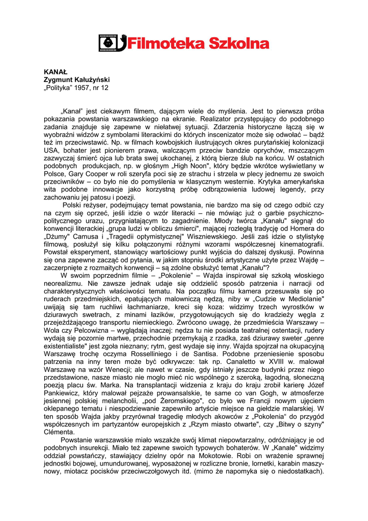 KANAŁ Zygmunt Kałużyński „Polityka” 1957, nr 12 „Kanał” jest ciekawym filmem, dającym wiele do myślenia. Jest to pierwsza próba pokazania powstania warszawskiego na ekranie. Realizator przystępujący do podobnego zadania znajduje się zapewne w niełatwej sytuacji. Zdarzenia historyczne łączą się w wyobraźni widzów z symbolami literackimi do których inscenizator może się odwołać – bądź też im przeciwstawić. Np. w filmach kowbojskich ilustrujących okres purytańskiej kolonizacji USA, bohater jest pionierem prawa, walczącym przeciw bandzie oprychów, mszczącym zazwyczaj śmierć ojca lub brata swej ukochanej, z którą bierze ślub na końcu. W ostatnich podobnych produkcjach, np. w głośnym „High Noon", który będzie wkrótce wyświetlany w Polsce, Gary Cooper w roli szeryfa poci się ze strachu i strzela w plecy jednemu ze swoich przeciwników – co było nie do pomyślenia w klasycznym westernie. Krytyka amerykańska wita podobne innowacje jako korzystną próbę odbrązowienia ludowej legendy, przy zachowaniu jej patosu i poezji. Polski reżyser, podejmujący temat powstania, nie bardzo ma się od czego odbić czy na czym się oprzeć, jeśli idzie o wzór literacki – nie mówiąc już o garbie psychicznopolitycznego urazu, przygniatającym to zagadnienie. Młody twórca „Kanału" sięgnął do konwencji literackiej „grupa ludzi w obliczu śmierci", mającej rozległą tradycję od Homera do „Dżumy" Camusa i „Tragedii optymistycznej" Wiszniewskiego. Jeśli zaś idzie o stylistykę filmową, posłużył się kilku połączonymi różnymi wzorami współczesnej kinematografii. Powstał eksperyment, stanowiący wartościowy punkt wyjścia do dalszej dyskusji. Powinna się ona zapewne zacząć od pytania, w jakim stopniu środki artystyczne użyte przez Wajdę – zaczerpnięte z rozmaitych konwencji – są zdolne obsłużyć temat „Kanału"? W swoim poprzednim filmie – „Pokolenie” – Wajda inspirował się szkołą włoskiego neorealizmu. Nie zawsze jednak udaje się oddzielić sposób patrzenia i narracji od charakterystycznych właściwości tematu. Na początku filmu kamera przesuwała się po ruderach przedmiejskich, epatujących malowniczą nędzą, niby w „Cudzie w Mediolanie" uwijają się tam ruchliwi łachmaniarze, kreci się koza: widzimy trzech wyrostków w dziurawych swetrach, z minami łazików, przygotowujących się do kradzieży węgla z przejeżdżającego transportu niemieckiego. Zwrócono uwagę, że przedmieścia Warszawy – Wola czy Pelcowizna – wyglądają inaczej: nędza tu nie posiada teatralnej ostentacji, rudery wydają się pozornie martwe, przechodnie przemykają z rzadka, zaś dziurawy sweter „genre existentialiste" jest zgoła nieznany; rytm, gest wydaje się inny. Wajda spojrzał na okupacyjną Warszawę trochę oczyma Rosselliniego i de Santisa. Podobne przeniesienie sposobu patrzenia na inny teren może być odkrywcze: tak np. Canaletto w XVIII w. malował Warszawę na wzór Wenecji; ale nawet w czasie, gdy istniały jeszcze budynki przez niego przedstawione, nasze miasto nie mogło mieć nic wspólnego z szeroką, łagodną, słoneczną poezją placu św. Marka. Na transplantacji widzenia z kraju do kraju zrobił karierę Józef Pankiewicz, który malował pejzaże prowansalskie, te same co van Gogh, w atmosferze jesiennej polskiej melancholii, „pod Żeromskiego", co było we Francji nowym ujęciem oklepanego tematu i niespodziewanie zapewniło artyście miejsce na giełdzie malarskiej. W ten sposób Wajda jakby przyrównał tragedię młodych akowców z „Pokolenia“ do przygód współczesnych im partyzantów europejskich z „Rzym miasto otwarte", czy „Bitwy o szyny" Clémenta. Powstanie warszawskie miało wszakże swój klimat niepowtarzalny, odróżniający je od podobnych insurekcji. Miało też zapewne swoich typowych bohaterów. W „Kanale" widzimy oddział powstańczy, stawiający dzielny opór na Mokotowie. Robi on wrażenie sprawnej jednostki bojowej, umundurowanej, wyposażonej w rozliczne bronie, lornetki, karabin maszynowy, miotacz pocisków przeciwczołgowych itd. (mimo że napomyka się o niedostatkach). Dowódca wygląda na dobrego zawodowca, zaś żołnierze zachowują się jakby przeszli pół Europy w szyku bojowym. Jeden z nich wykazuje dużą zręczność, przecinając linę zdalnie kierowanej przez Niemców tankietki z materiału min wybuchowych. Nie odnosimy wrażenia owego desperackiego, historycznego amatorstwa, niszczycielskiego wobec samego siebie, którego opis przynoszą nam dokumenty. Nie ma tu też straszliwego w skutkach splątania „walczących z cywilami”, których nie ma gdzie umieścić ni czym karmić – co było główna ludzką klęską powstania. Żyją oni osobno, zjawiają się na krótko, plączą się pod nogami, wołają: „Gaz, gaz!" i znikają. Wydaje się, że reżyser miał zbyt wybitnego fachowca za doradcę militarnego. W tej części film niewiele się różni od dobrych wojennych produkcji zagranicznych. Oddział otrzymuje następnie rozkaz by przedrzeć się kanałami do centrum, gdzie skupiają się ocalałe siły. W przeprawie tej wszyscy giną. Tutaj film ulega bogatemu zbeletryzowaniu. Obserwujemy kilka wątków osobistych, przy czym każda z postaci „spełnia" swój los do końca, odkrywając to, co jest zasadniczego w jej charakterze. Muzyk, który przyłączył się do oddziału, wariuje i przebiega kanał grając na okarynie, zahipnotyzowany odkrytą przez siebie, ostateczną melodią. Młoda para, nie dość dojrzała, by w pełni uświadomić sobie miłość, teraz dochodzi do porozumienia – gdy dotarli do kraty zamykającej kanał i pozbawieni odwrotu muszą zginąć. Oficer, który żył z łączniczką, ogarnięty rozpaczą wyznaje jej, że ma żonę, dziecko, że chce do nich wrócić – wówczas jego towarzyszka popełnia samobójstwo, ale i on, mimo swej małoduszności, nie wyjdzie z kanału żywy, 