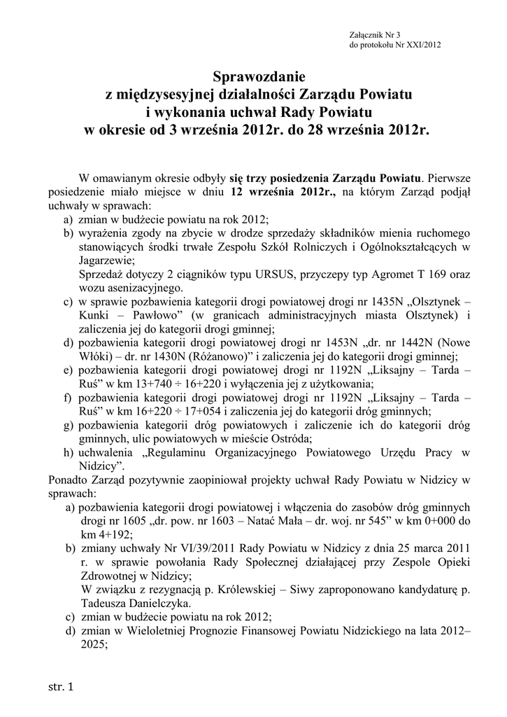 Załącznik Nr 3 do protokołu Nr XXI/2012 Sprawozdanie z międzysesyjnej działalności Zarządu Powiatu i wykonania uchwał Rady Powiatu w okresie od 3 września 2012r. do 28 września 2012r. W omawianym okresie odbyły się trzy posiedzenia Zarządu Powiatu. Pierwsze posiedzenie miało miejsce w dniu 12 września 2012r., na którym Zarząd podjął uchwały w sprawach: a) zmian w budżecie powiatu na rok 2012; b) wyrażenia zgody na zbycie w drodze sprzedaży składników mienia ruchomego stanowiących środki trwałe Zespołu Szkół Rolniczych i Ogólnokształcących w Jagarzewie; Sprzedaż dotyczy 2 ciągników typu URSUS, przyczepy typ Agromet T 169 oraz wozu asenizacyjnego. c) w sprawie pozbawienia kategorii drogi powiatowej drogi nr 1435N „Olsztynek – Kunki – Pawłowo” (w granicach administracyjnych miasta Olsztynek) i zaliczenia jej do kategorii drogi gminnej; d) pozbawienia kategorii drogi powiatowej drogi nr 1453N „dr. nr 1442N (Nowe Włóki) – dr. nr 1430N (Różanowo)” i zaliczenia jej do kategorii drogi gminnej; e) pozbawienia kategorii drogi powiatowej drogi nr 1192N „Liksajny – Tarda – Ruś” w km 13+740 ÷ 16+220 i wyłączenia jej z użytkowania; f) pozbawienia kategorii drogi powiatowej drogi nr 1192N „Liksajny – Tarda – Ruś” w km 16+220 ÷ 17+054 i zaliczenia jej do kategorii dróg gminnych; g) pozbawienia kategorii dróg powiatowych i zaliczenie ich do kategorii dróg gminnych, ulic powiatowych w mieście Ostróda; h) uchwalenia „Regulaminu Organizacyjnego Powiatowego Urzędu Pracy w Nidzicy”. Ponadto Zarząd pozytywnie zaopiniował projekty uchwał Rady Powiatu w Nidzicy w sprawach: a) pozbawienia kategorii drogi powiatowej i włączenia do zasobów dróg gminnych drogi nr 1605 „dr. pow. nr 1603 – Natać Mała – dr. woj. nr 545” w km 0+000 do km 4+192; b) zmiany uchwały Nr VI/39/2011 Rady Powiatu w Nidzicy z dnia 25 marca 2011 r. w sprawie powołania Rady Społecznej działającej przy Zespole Opieki Zdrowotnej w Nidzicy; W związku z rezygnacją p. Królewskiej – Siwy zaproponowano kandydaturę p. Tadeusza Danielczyka. c) zmian w budżecie powiatu na rok 2012; d) zmian w Wieloletniej Prognozie Finansowej Powiatu Nidzickiego na lata 2012– 2025; str. 1 Następnie Zarząd, w związku z wprowadzonym planem oszczędnościowym, wyraził zgodę na zatrudnienie na umowę-zlecenie w Zespole Szkół Rolniczych i Ogólnokształcących w Jagarzewie nauczyciela-stażysty do nauki matematyki. W dalszej części posiedzenia Zarząd Powiatu pozytywnie zaopiniował wniosek p. Jarmułowicza i wyraził zgodę na rozłożenie na raty kwoty w wys. 13 415zł, wynikającej z usunięcia pojazdu z drogi i jego przechowywania. Wysokość raty ustalono na 150zł/miesięcznie. Ponadto przedmiotem obrad Zarządu Powiatu było rozpatrzenie warunków podpisania porozumienia z panem Arkadiuszem Pliszką za przechowywanie i dozór 9 pojazdów. W porozumieniu Powiat Nidzicki zobowiązuje się do wypłacenia P. Arkadiuszowi Pliszce kosztów usunięcia pojazdów oraz kosztów przechowywania i wynagrodzenia za dozór w dwóch ratach. Pierwsza rata za okres od dnia 4 września 2010r. do dnia zakończenia dozoru. Druga rata za okres od dnia usunięcia pojazdu z drogi do dnia 3 września 2010r. płatna w ciągu 6 miesięcy od uprawomocnienia się postanowienia o zwrocie kosztów dotyczącego każdego z pojazdów. Następnie Zarząd przyjął do wiadomości informację dyrektora Zespołu Szkół Zawodowych i Ogólnokształcących w Nidzicy w sprawie najmu lokalu o pow. 42m2 w budynku szkolnym przy ul. Jagiełły 3 pod potrzeby Ośrodka Szkolenia Kierowców s.c. p. Dariusz Grzebski na łączną kwotę netto 184,50zł i na tych samych warunkach z p. Piotrem Jastrzębowskim reprezentującym Ośrodek Szkolenia Kierowców s.c. W dalszej części posiedzenia Starosta poinformował członków Zarządu nt. przeprowadzanych rokowań z właścicielami nieruchomości gruntowych położonych w obrębie Jabłonka i w obrębie Szkotowo, które w planie miejscowym przeznaczone są pod drogę powiatową i na poszerzenie już istniejącej drogi powiatowej. W wyniku negocjacji została ustalona stawka odszkodowania za działkę nr 161/59 obręb Szkotowo z właścicielem gruntu na 6zł/m2. Kolejne rokowania z właścicielami gruntów położonych w obrębie Jabłonka zaplanowano na 4 października 2012r. (ze względu na brak porozumienia). Drugie posiedzenie Zarządu Powiatu w omawianym okresie międzysesyjnym odbyło się w dniu 18 września 2012r., podczas którego Zarząd podjął uchwałę w sprawie: a) zmian w budżecie powiatu na rok 2012. Powyższe zmiany dokonano w związku z otrzymaniem decyzji Wojewody Warmińsko – Mazurskiego, zgodnie z którą zwiększono plan dotacji celowych w dziale 75411 o kwotę 5 300zł, z przeznaczeniem dla Komendy Powiatowej państwowej Straży Pożarnej w Nidzicy, na wypłatę ekwiwalentu pieniężnego funkcjonariuszom PSP, którzy w okresie EURO 2012 pełnili służbę w czasie przekraczającym ustawowo określoną tygodniową normę czasu służby. Trzecie posiedzenie Zarządu miało miejsce w dniu 26 września 2012r. Zarząd podjął uchwały w sprawach: 1. zatwierdzenia arkusza organizacji Zespołu Szkół Zawodowych i Ogólnokształcących w Nidzicy; 2. zatwierdzenia arkusza organizacji Zespołu Szkół Ogólnokształcących w Nidzicy; 3. zatwierdzenia arkusza organizacji Zespołu Szkół Rolniczych i Ogólnokształcących w Jagarzewie; str. 2 4. zatwierdzenia arkusza organizacji Specjalnego Ośrodka SzkolnoWychowawczego w Nidzicy; 5. zatwierdzenia arkusza organizacji Centrum Kształcenia Praktycznego w Nidzicy; 6. zatwierdzenia arkusza organizacji Poradni Psychologiczno – Pedagogicznej w Nidzicy; 7. powierzenia stanowiska dyrektora Specjalnego Ośrodka SzkolnoWychowawczego w Nidzicy Pani Bożenie Breńskiej; 8. powierzenia stanowiska dyrektora Centrum Kształcenia Praktycznego w Nidzicy Panu Jarosławowi Kwiecień; 9. wyrażenia 