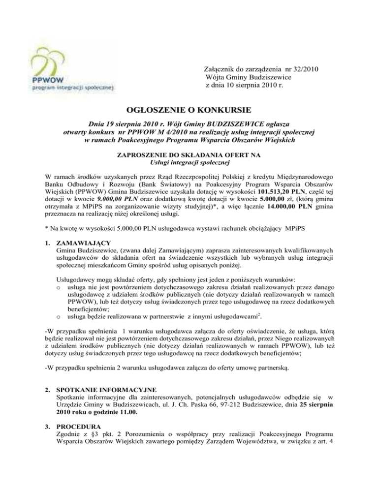 Załącznik do zarządzenia nr 32/2010 Wójta Gminy Budziszewice z dnia 10 sierpnia 2010 r. OGŁOSZENIE O KONKURSIE Dnia 19 sierpnia 2010 r. Wójt Gminy BUDZISZEWICE ogłasza otwarty konkurs nr PPWOW M 4/2010 na realizację usług integracji społecznej w ramach Poakcesyjnego Programu Wsparcia Obszarów Wiejskich ZAPROSZENIE DO SKŁADANIA OFERT NA Usługi integracji społecznej W ramach środków uzyskanych przez Rząd Rzeczpospolitej Polskiej z kredytu Międzynarodowego Banku Odbudowy i Rozwoju (Bank Światowy) na Poakcesyjny Program Wsparcia Obszarów Wiejskich (PPWOW) Gmina Budziszewice uzyskała dotację w wysokości 101.513,20 PLN, część tej dotacji w kwocie 9.000,00 PLN oraz dodatkową kwotę dotacji w kwocie 5.000,00 zł, (którą gmina otrzymała z MPiPS na zorganizowanie wizyty studyjnej)*, a więc łącznie 14.000,00 PLN gmina przeznacza na realizację niżej określonej usługi. * Na kwotę w wysokości 5.000,00 PLN usługodawca wystawi rachunek obciążający MPiPS 1. ZAMAWIAJĄCY Gmina Budziszewice, (zwana dalej Zamawiającym) zaprasza zainteresowanych kwalifikowanych usługodawców do składania ofert na świadczenie wszystkich lub wybranych usług integracji społecznej mieszkańcom Gminy spośród usług opisanych poniżej. Usługodawcy mogą składać oferty, gdy spełniony jest jeden z poniższych warunków: o usługa nie jest powtórzeniem dotychczasowego zakresu działań realizowanych przez danego usługodawcę z udziałem środków publicznych (nie dotyczy działań realizowanych w ramach PPWOW), lub też dotyczy usług świadczonych przez tego usługodawcę na rzecz dodatkowych beneficjentów; o usługa będzie realizowana w partnerstwie z innymi usługodawcami2. -W przypadku spełnienia 1 warunku usługodawca załącza do oferty oświadczenie, że usługa, którą będzie realizował nie jest powtórzeniem dotychczasowego zakresu działań, przez Niego realizowanych z udziałem środków publicznych (nie dotyczy działań realizowanych w ramach PPWOW), lub też dotyczy usług świadczonych przez tego usługodawcę na rzecz dodatkowych beneficjentów; -W przypadku spełnienia 2 warunku usługodawca załącza do oferty umowę partnerską. 2. SPOTKANIE INFORMACYJNE Spotkanie informacyjne dla zainteresowanych, potencjalnych usługodawców odbędzie się w Urzędzie Gminy w Budziszewicach, ul. J. Ch. Paska 66, 97-212 Budziszewice, dnia 25 sierpnia 2010 roku o godzinie 11.00. 3. PROCEDURA Zgodnie z §3 pkt. 2 Porozumienia o współpracy przy realizacji Poakcesyjnego Programu Wsparcia Obszarów Wiejskich zawartego pomiędzy Zarządem Województwa, w związku z art. 4 ust. 1 lit. a Ustawy z dnia 29 stycznia 2004 r. Prawo zamówień publicznych (Dz. U. z 2007 Nr 233 poz. 1655) wybór usługodawców odbywać się będzie w oparciu o procedurę CPP ((ang.) Community Participation in Procurement – Udział społeczności w zamówieniach) Banku Światowego opisaną w Podręczniku Realizacji Programu Integracji Społecznej dostępnym pod następującym adresem: http://www.ppwow.gov.pl. Podręcznik zawiera również informacje nt. kosztów kwalifikowanych, podmiotów uprawnionych do świadczenia usług jak również formularze wykorzystywane w realizacji programu. 4. OPIS PRZEDMIOTU ZAMÓWIENIA (SZCZEGÓŁOWY OPIS POSZCZEGÓLNYCH CZĘŚCI) OFERTY CZĘŚCIOWE Zamawiający nie dopuszcza składania ofert częściowych WARIANTY Zamawiający nie dopuszcza składania ofert wariantowych OPIS ZAMAWIANYCH USŁUG – WYNIKA Z ZAPISÓW ZATWIERDZONEGEGO PLANU DZIAŁANIA I JEGO AKTUALIZACJI. Zorganizowanie wizyty studyjnej przeznaczonej dla liderów oraz osób aktywnych społecznie. Cele usługi: - zapoznanie się z dobrymi praktykami oraz wymiana doświadczeń związanych z rozwojem organizacji pozarządowych; - aktywizacja mieszkańców, rozwój przedsiębiorczości; - propagowanie integracji społecznej wśród mieszkańców wsi oraz idei obywatelskiego uczestnictwa w życiu społeczności lokalnej; - rozwój współpracy samorządu terytorialnego z organizacjami pozarządowymi. Usługa obejmuje: a) zorganizowanie 3 dniowej wizyty studyjnej dla 30 osób z terenu gminy Budziszewice; b) zapewnienie programu zgodnego z celami; w tym organizacja spotkań z przedstawicielami władz samorządowych, liderami społeczności gminnej itp.; c) zaprezentowanie dobrych praktyk z terenu woj. podlaskiego; d) pobyt w gminach Dubicze Cerkiewne, Hajnówka i Narewka; e) zapewnienia wyżywienia i zakwaterowania dla uczestników wizyty studyjnej; f) zaprezentowanie dziedzictwa kulturalnego i tradycji woj. podlaskiego; g) zapewnienie transportu podczas 3 dniowej wizyty studyjnej; Termin realizacji usługi: 17-19 września 2010 rok Sugerowana jednostka szacunkowa – 1 trzydniowa wizyta studyjna Planowana kwota na realizację usługi: 14.000,00 PLN (słownie: czternaście tysięcy złotych 00/100) (alokacja z PPWOW – 9.000,00 zł oraz dodatkowe dofinansowanie do wizyty studyjnej z MPiPS5.000,00 zł ) Podstawą dla płatności na rzecz usługodawcy realizującego usługę będzie rzeczywiście zrealizowana liczba jednostek zdefiniowanych jako: 1 trzydniowa wizyta studyjna Usługodawca zobowiązany jest do przedstawienia w ofercie informacji nt. sposobu monitorowania realizacji usług, przewidywanych działań informacyjnych, jak również informacji dotyczących zapewnienia trwałości podejmowanych działań. 5. UPRAWNIENI USŁUGODAWCY Podmiotami uprawnionymi do ubiegania się o zamówienie w ramach niniejszej procedury są: 1. Organizacje pozarządowe (NGOs) 2. Organizacje kościelne 3. Prywatni usługodawcy: Firmy, osoby fizyczne, spółdzielnie socjalne, 4. Samorządy zawodowe, organizacje samorządu gospodarczego, izby rolnicze 5. Jednostki organizacyjne samorządu terytorialnego, stowarzyszenia jst i im podległe jednostki organizacyjne, 6. KRYTERIA OCENY TECHNICZNEJ1 a. zgodność z warunkami realizacji i zakresem zamawianych usług; b. posiadanie doświadczenia w organizowaniu wizyt studyjnych. Zam