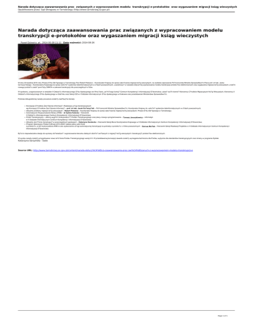 Narada dotycząca zaawansowania prac związanych z wypracowaniem modelu transkrypcji e-protokołów oraz wygaszaniem migracji ksiąg wieczystych Opublikowane przez: Sąd Okręgowy w Tarnobrzegu (http://www.tarnobrzeg.so.gov.pl) Narada dotycząca zaawansowania prac związanych z wypracowaniem modelu transkrypcji e-protokołów oraz wygaszaniem migracji ksiąg wieczystych Paweł Dziewirz, pt., 2014-05-09 11:11 Data ważności: 2014-08-26 W dniu 23 kwietnia 2014 roku Prezes S?du Okr?gowego w Tarnobrzegu Pan Robert Pelewicz – Koordynator Krajowy do spraw zako?czenia migracji ksi?g wieczystych, na osobiste zaproszenie Pe?nomocnika Ministra Sprawiedliwo?ci Pana prof. dr hab. Jacka Go?aczy?skiego - Koordynatora Krajowego do spraw wdro?e? systemów teleinformatycznych w s?dach powszechnych, uczestniczy? w naradzie dotycz?cej wypracowania modelu transkrypcji protoko?ów elektronicznych oraz wygaszania migracji ksi?g wieczystych, a tak?e nowego podzia?u zada? pomi?dzy OMKW w zakresie transkrypcji dla poszczególnych s?dów. W spotkaniu, zorganizowanym w siedzibie II Oddzia?u Informatycznego S?du Apelacyjnego we Wroc?awiu, pe?ni?cego funkcj? Centrum Kompetencji i Informatyzacji S?downictwa, udzia? wzi?li równie? Kierownicy O?rodków Migracyjnych Ksi?g Wieczystych, Kierownicy II Oddzia?u Informatycznego S?du Apelacyjnego w Gda?sku oraz Sekcji OZI w I Oddziale Informatycznym S?du Apelacyjnego w Krakowie oraz przedstawiciel Ministerstwa Sprawiedliwo?ci. Podczas kilkugodzinnej narady poruszone zosta?y nast?puj?ce tematy: Koncepcja O?rodków Zarz?dzania Informacj?. Realizacja us?ug transkrypcyjnych wg Koncepcji O?rodków Zarz?dzania Informacj? – prof. dr hab. Jacek Go?aczy?ski – Pe?nomocnik Ministra Sprawiedliwo?ci, Koordynator Krajowy ds. wdro?e? systemów teleinformatycznych w s?dach powszechnych; Aktualne problemy migracji ksi?g wieczystych – Robert Pelewicz – Koordynator Krajowy do spraw zako?czenia migracji ksi?g wieczystych, Prezes S?du Okr?gowego w Tarnobrzegu; Automatyczne Rozpoznawanie Mowy (ARM) – dr Sylwia Kotecka – Kierownik II Oddzia?u Informatycznego Centrum Kompetencji i Informatyzacji S?downictwa; Portal Transkrypcyjny – obecny wygl?d i funkcjonalno?? Portalu Transkrypcyjnego oraz plany rozwoju oprogramowania – Tomasz Januszkiewicz – informatyk w II Oddziale Informatycznym Centrum Kompetencji i Informatyzacji S?downictwa; Aktualne obci??enie transkrypcj? w poszczególnych apelacjach – Katarzyna Sandecka – Kierownik Sekcji Biura Koordynatora Krajowego w II Oddziale Informatycznym Centrum Kompetencji i Informatyzacji S?downictwa; Program Operacyjny Polska Cyfrowa 2014-2020 i dalsze plany wdro?enia e-protoko?u, w tym wykorzystania ARM w celu wytworzenia us?ugi automatycznej transkrypcji na potrzeby e-protoko?u i s?dów powszechnych – Dariusz Ma?lak – Kierownik Sekcji Realizacji Projektów w II Oddziale Informatycznym Centrum Kompetencji i Informatyzacji S?downictwa. By?a to niepowtarzalna okazja do wymiany do?wiadcze? i wypracowania kierunku dalszych dzia?a? zwi?zanych z migracj? ksi?g wieczystych i transkrypcj? protoko?ów elektronicznych. W wyniku narady zosta?y przygotowane nowe za?o?enia Portalu Transkrypcyjnego wersji 2.0. W przedstawionej koncepcji zawarte zosta?y wymagania techniczne dla Portalu, wytyczne dla standardów transkrypcyjnych oraz zmiany w programie Dyktak. Katarzyna Sarzyńska - Sado Source URL: http://www.tarnobrzeg.so.gov.pl/content/narada-dotycz%C4%85ca-zaawansowania-prac-zwi%C4%85zanych-z-wypracowaniem-modelu-transkrypcji-e Page 1 of 1 Powered by TCPDF (www.tcpdf.org)