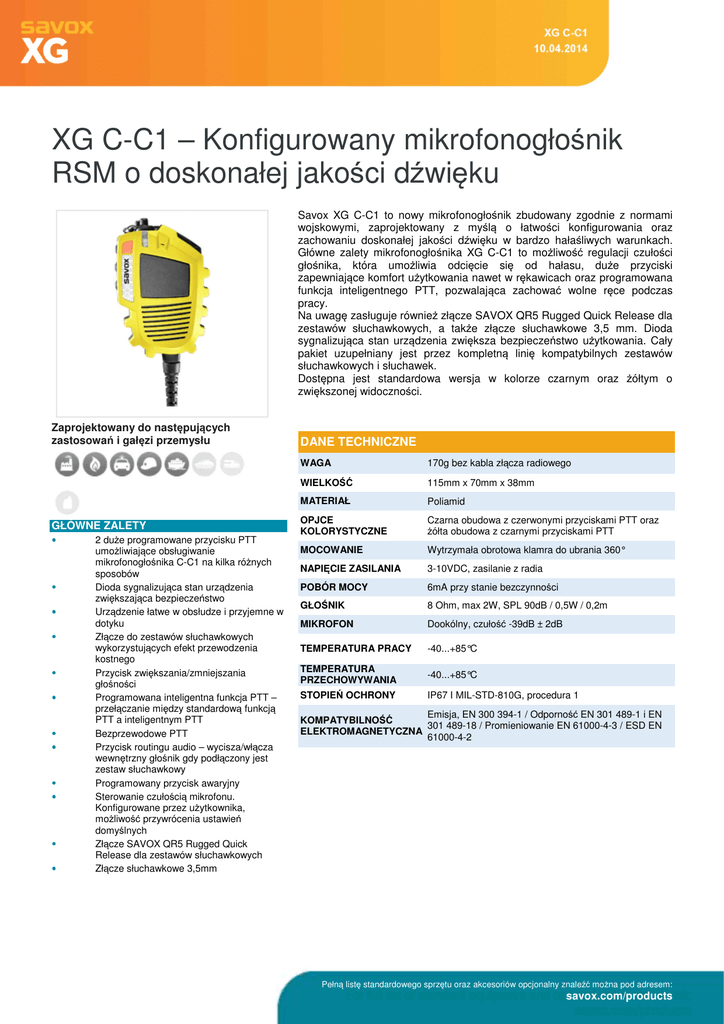 XG C-C1 – Konfigurowany mikrofonogłośnik RSM o doskonałej jakości dźwięku Savox XG C-C1 to nowy mikrofonogłośnik zbudowany zgodnie z normami wojskowymi, zaprojektowany z myślą o łatwości konfigurowania oraz zachowaniu doskonałej jakości dźwięku w bardzo hałaśliwych warunkach. Główne zalety mikrofonogłośnika XG C-C1 to możliwość regulacji czułości głośnika, która umożliwia odcięcie się od hałasu, duże przyciski zapewniające komfort użytkowania nawet w rękawicach oraz programowana funkcja inteligentnego PTT, pozwalająca zachować wolne ręce podczas pracy. Na uwagę zasługuje również złącze SAVOX QR5 Rugged Quick Release dla zestawów słuchawkowych, a także złącze słuchawkowe 3,5 mm. Dioda sygnalizująca stan urządzenia zwiększa bezpieczeństwo użytkowania. Cały pakiet uzupełniany jest przez kompletną linię kompatybilnych zestawów słuchawkowych i słuchawek. Dostępna jest standardowa wersja w kolorze czarnym oraz żółtym o zwiększonej widoczności. Zaprojektowany do następujących zastosowań i gałęzi przemysłu GŁÓWNE ZALETY 2 duże programowane przycisku PTT umożliwiające obsługiwanie mikrofonogłośnika C-C1 na kilka różnych sposobów Dioda sygnalizująca stan urządzenia zwiększająca bezpieczeństwo Urządzenie łatwe w obsłudze i przyjemne w dotyku Złącze do zestawów słuchawkowych wykorzystujących efekt przewodzenia kostnego Przycisk zwiększania/zmniejszania głośności Programowana inteligentna funkcja PTT – przełączanie między standardową funkcją PTT a inteligentnym PTT Bezprzewodowe PTT Przycisk routingu audio – wycisza/włącza wewnętrzny głośnik gdy podłączony jest zestaw słuchawkowy Programowany przycisk awaryjny Sterowanie czułością mikrofonu. Konfigurowane przez użytkownika, możliwość przywrócenia ustawień domyślnych Złącze SAVOX QR5 Rugged Quick Release dla zestawów słuchawkowych Złącze słuchawkowe 3,5mm DANE TECHNICZNE WAGA 170g bez kabla złącza radiowego WIELKOŚĆ 115mm x 70mm x 38mm MATERIAŁ Poliamid OPJCE KOLORYSTYCZNE Czarna obudowa z czerwonymi przyciskami PTT oraz żółta obudowa z czarnymi przyciskami PTT MOCOWANIE Wytrzymała obrotowa klamra do ubrania 360° NAPIĘCIE ZASILANIA 3-10VDC, zasilanie z radia POBÓR MOCY 6mA przy stanie bezczynności GŁOŚNIK 8 Ohm, max 2W, SPL 90dB / 0,5W / 0,2m MIKROFON Dookólny, czułość -39dB ± 2dB TEMPERATURA PRACY -40...+85°C TEMPERATURA PRZECHOWYWANIA -40...+85°C STOPIEŃ OCHRONY IP67 I MIL-STD-810G, procedura 1 Emisja, EN 300 394-1 / Odporność EN 301 489-1 i EN KOMPATYBILNOŚĆ 301 489-18 / Promieniowanie EN 61000-4-3 / ESD EN ELEKTROMAGNETYCZNA 61000-4-2 Pełną listę standardowego sprzętu oraz akcesoriów opcjonalny znaleźć można pod adresem: savox.com/products